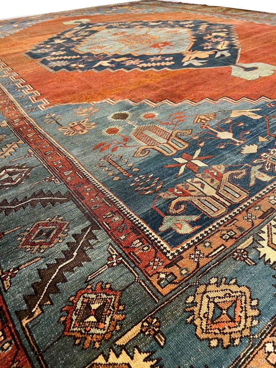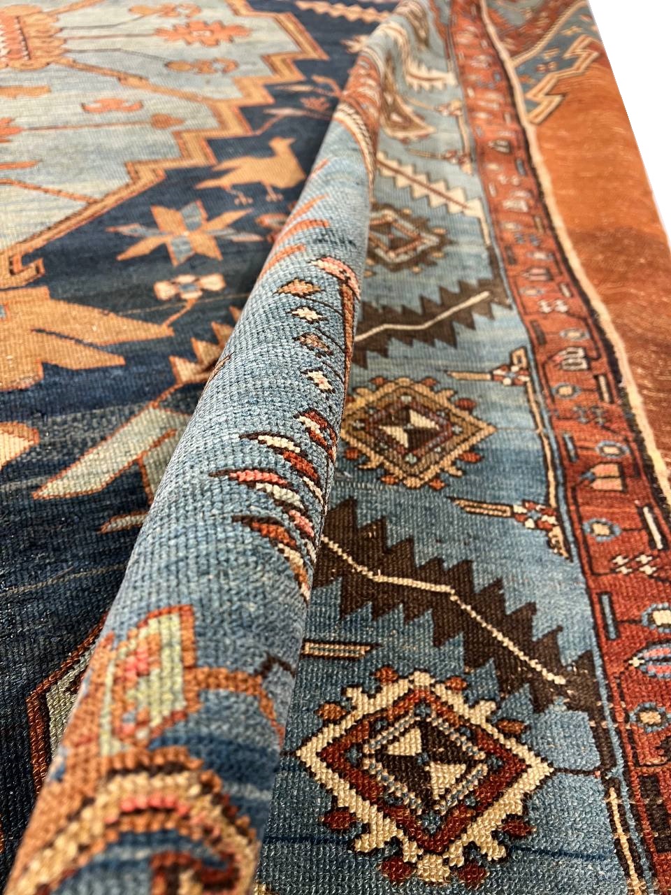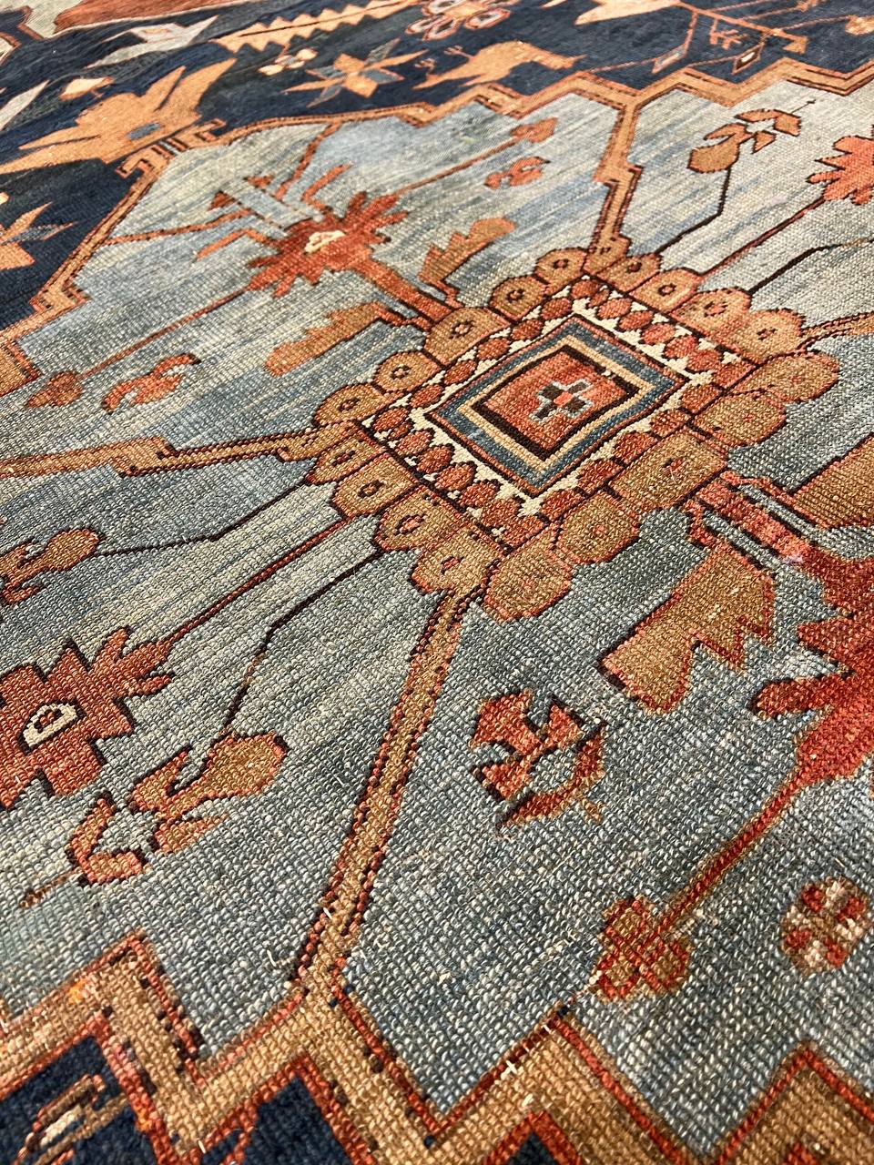 Antique Serapi rugs were made by small workshops and families, which resulted in formal Persian carpets as well as those with rustic tribal influences. Local production methods contributed to the characteristic abrash that adds a textural appearance to the stark field and contrasting decorations seen in many Serapi rugs. These fine antique carpets were made in many sizes and shapes ranging from elongated corridor carpets to highly desirable room-size rugs. Serapi rugs feature clear colors, creamy un-dyed fleece beautifully tempered reds, warm earth tones and concentrated blues.