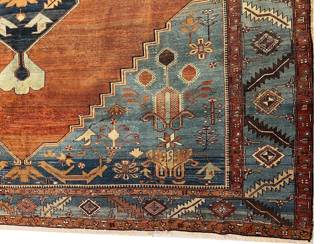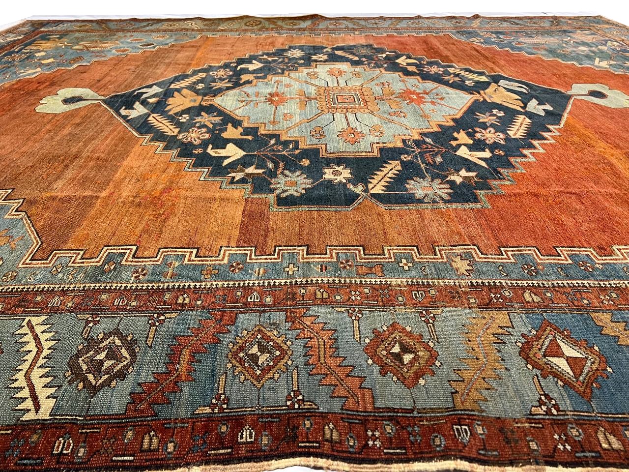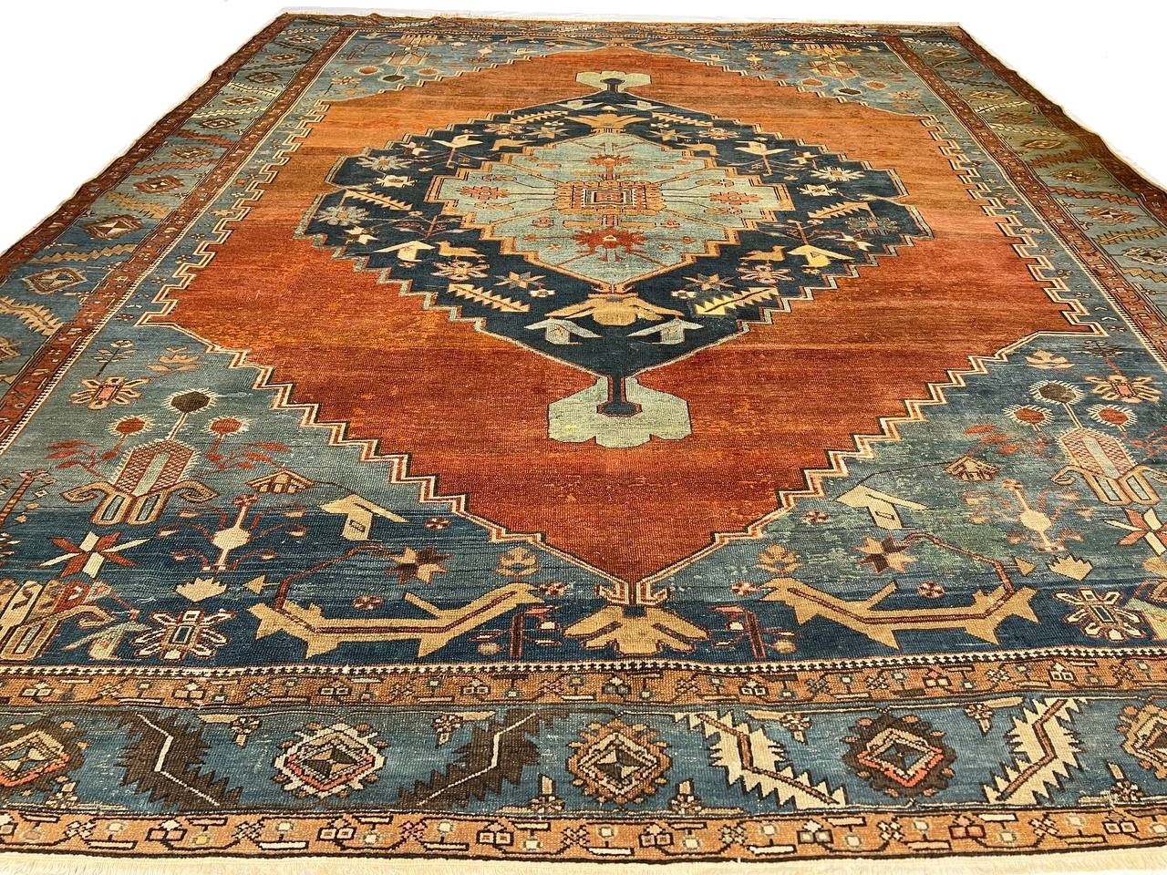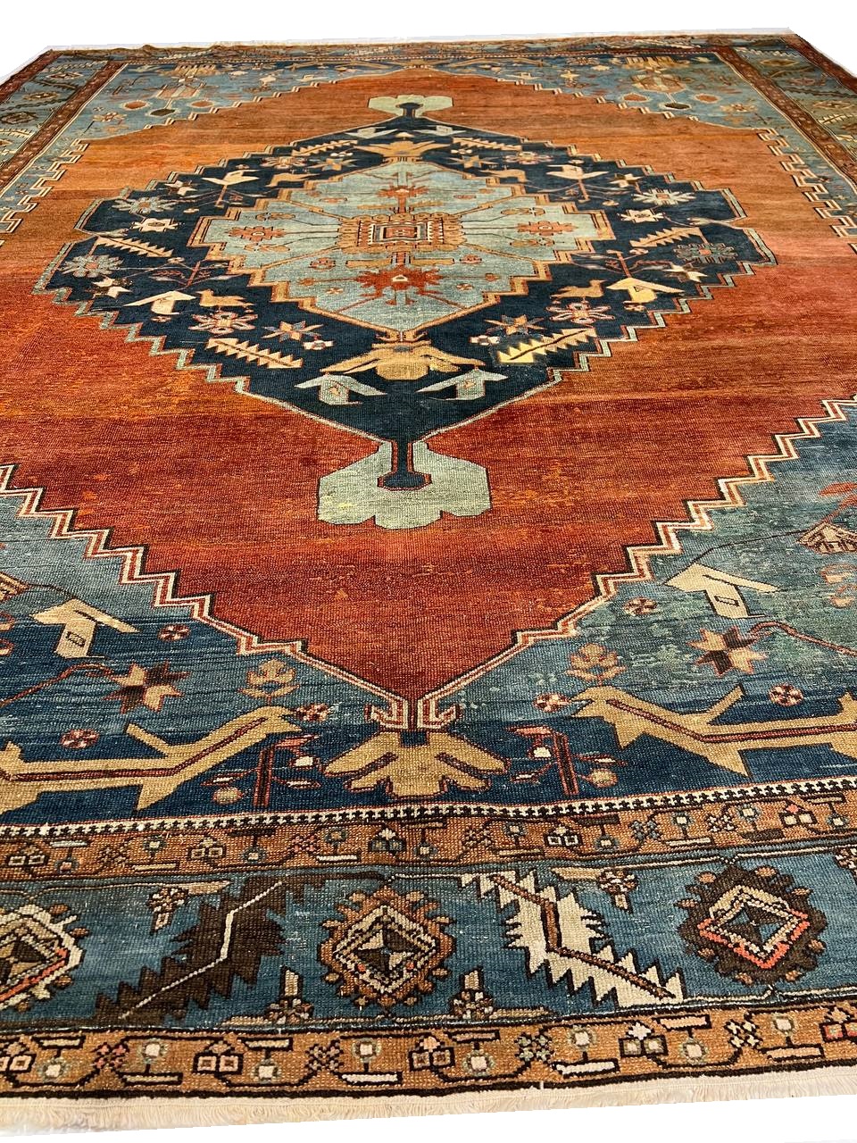 Antique Serapi rugs were made by small workshops and families, which resulted in formal Persian carpets as well as those with rustic tribal influences. Local production methods contributed to the characteristic abrash that adds a textural appearance to the stark field and contrasting decorations seen in many Serapi rugs. These fine antique carpets were made in many sizes and shapes ranging from elongated corridor carpets to highly desirable room-size rugs. Serapi rugs feature clear colors, creamy un-dyed fleece beautifully tempered reds, warm earth tones and concentrated blues.