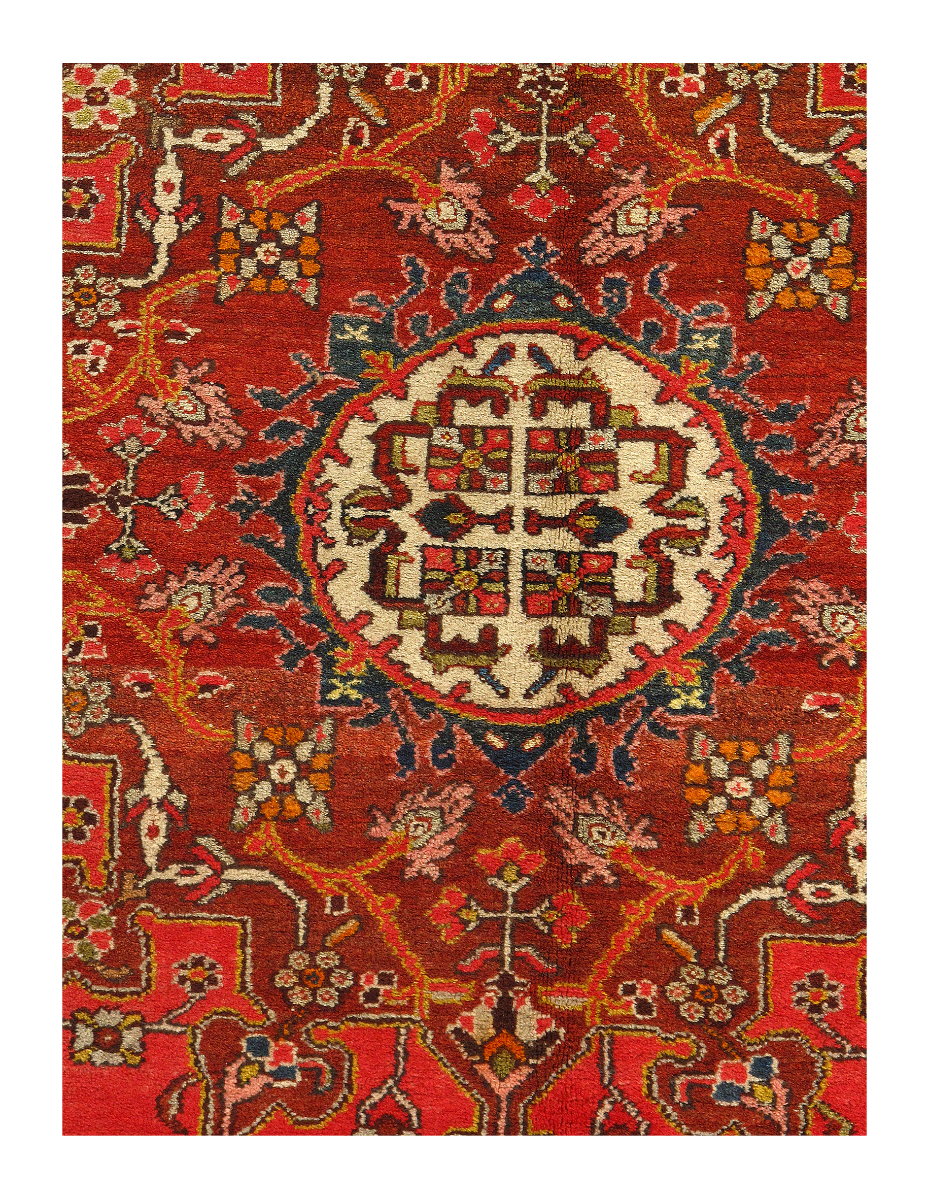 Hand knotted in the village of Tafrish, which is located in western Persia in the Hamadan region. Tafrish rugs are recognizable by their medallions, which resemble a clock-face (albeit with sixteen segments, not twelve). Some believe that the medallion represents the sun with radiating sunbeams as a symbol of the Zoroastrian (Parsee) religion. Antique Tafrish rugs have one of the finest weaves of the Hamadan area.