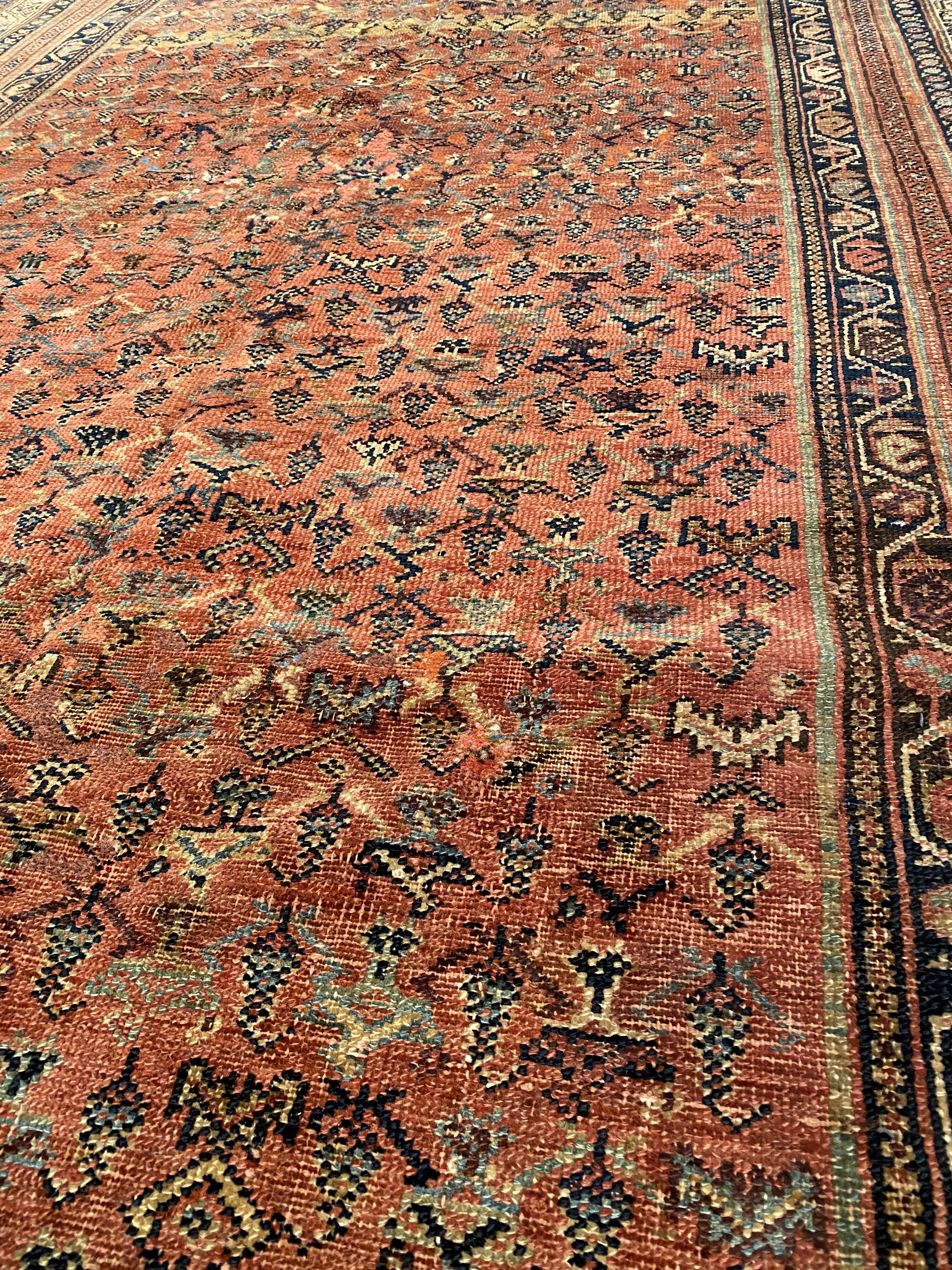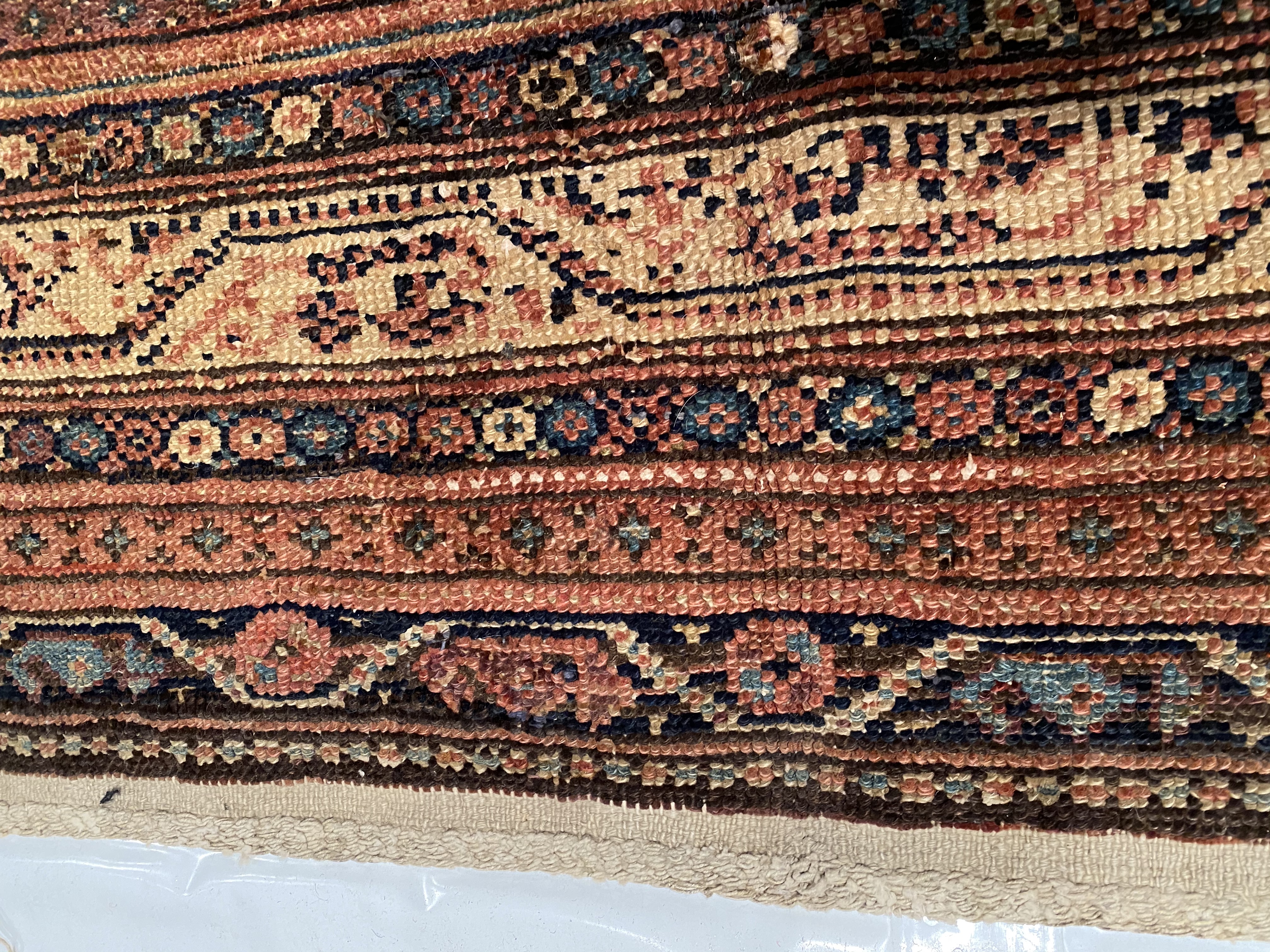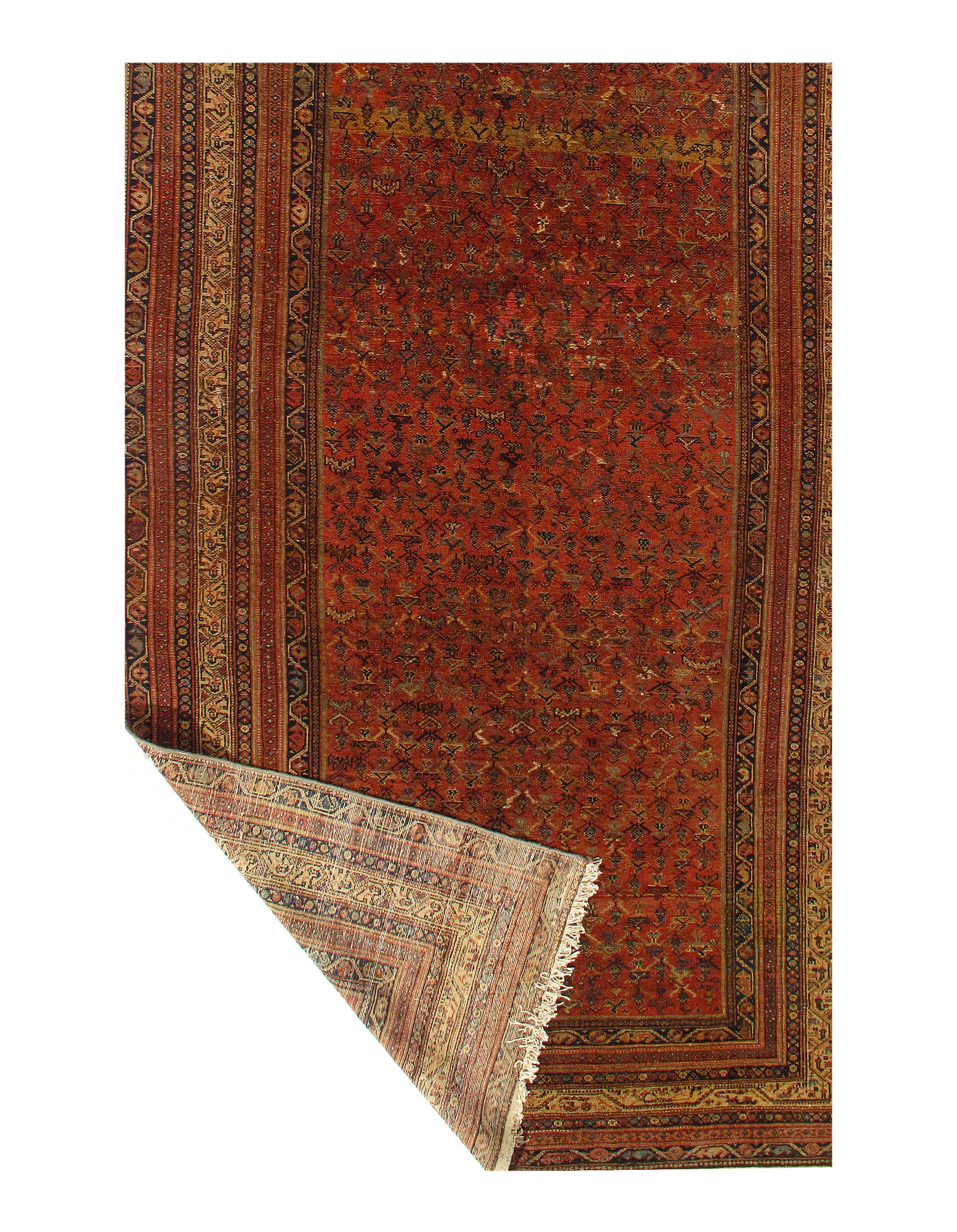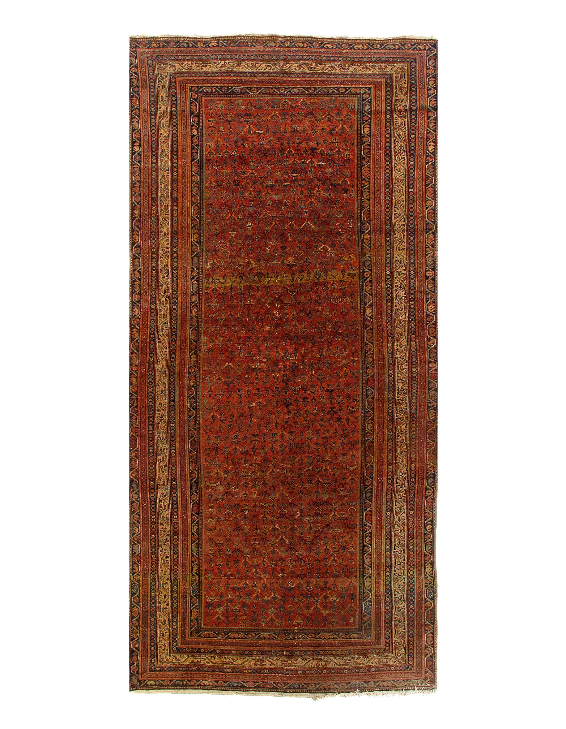 Antique Malayer Runner, Like many gorgeous Malayer runners, this piece is designed to lead the eye down through the vibrant collection of shapes and tones. A soft beige background defines the largest border that the carpet; a pleasant collection of angular flowers create flow and movement within this border, standing out against the backdrop. The large frame is further hemmed by two beautiful red lines, containing a series of diagonally running green forms. An rust background creates an elegant flow at the center of the runner, allowing the forms within to appear even more defined.