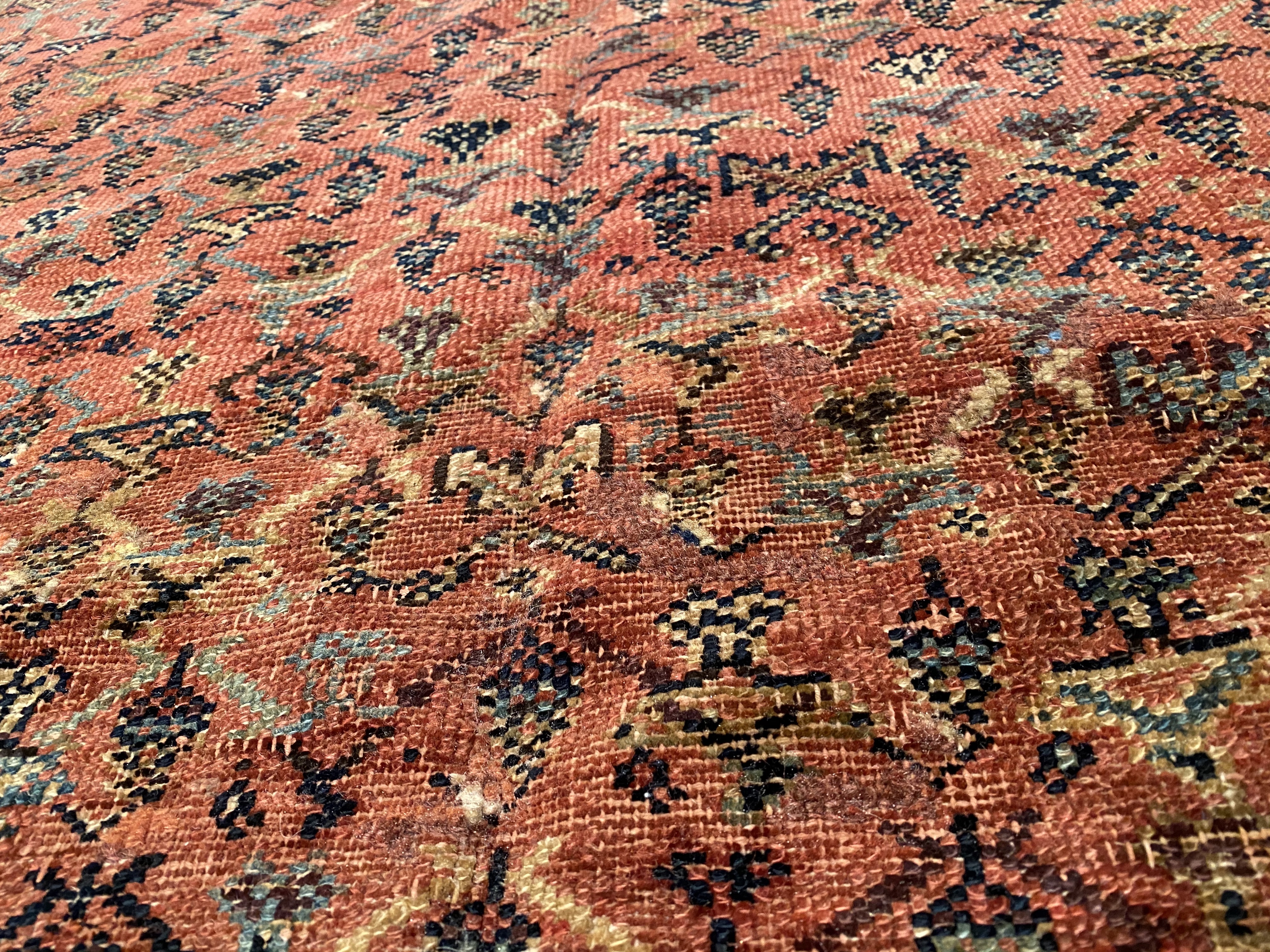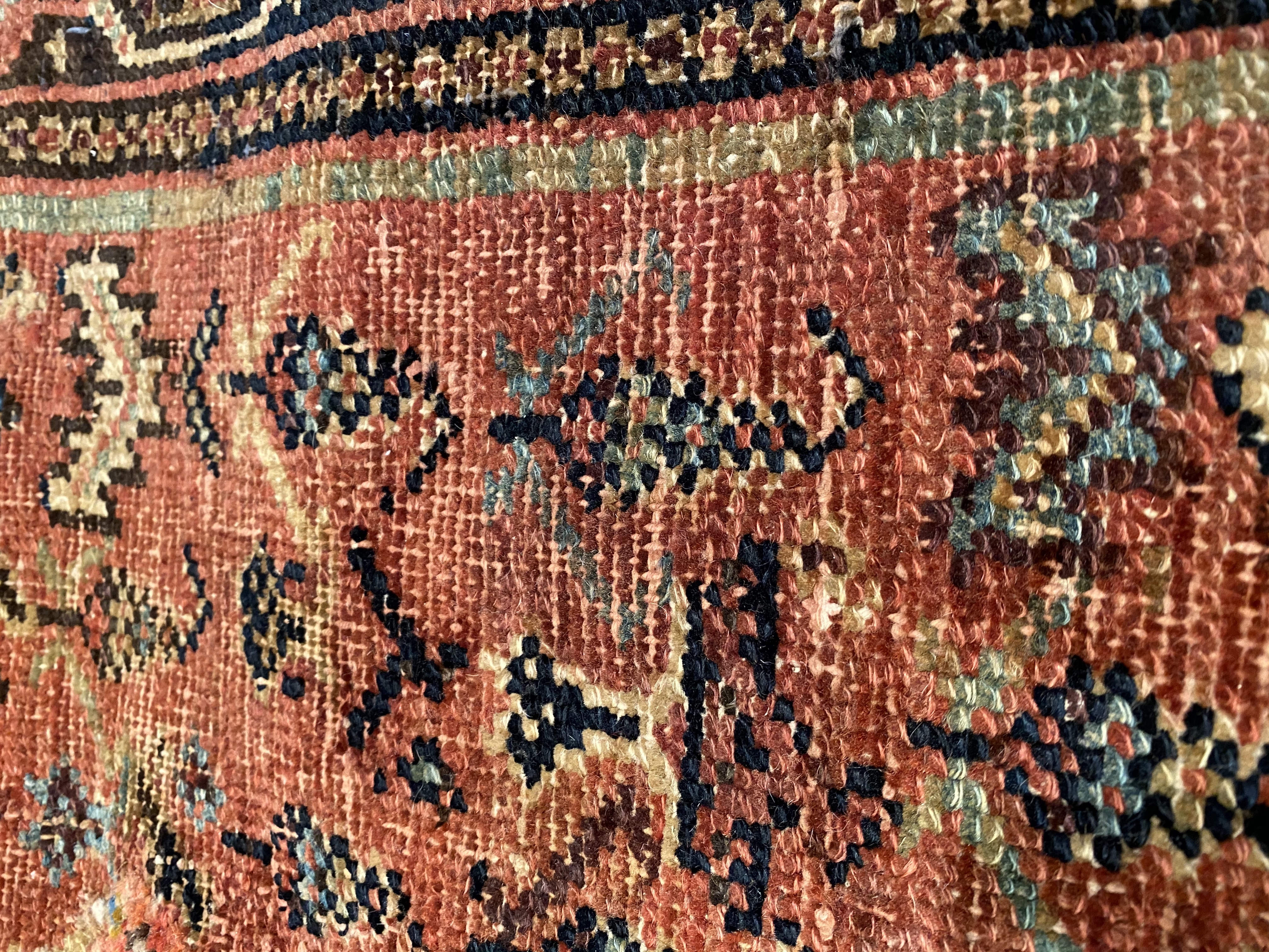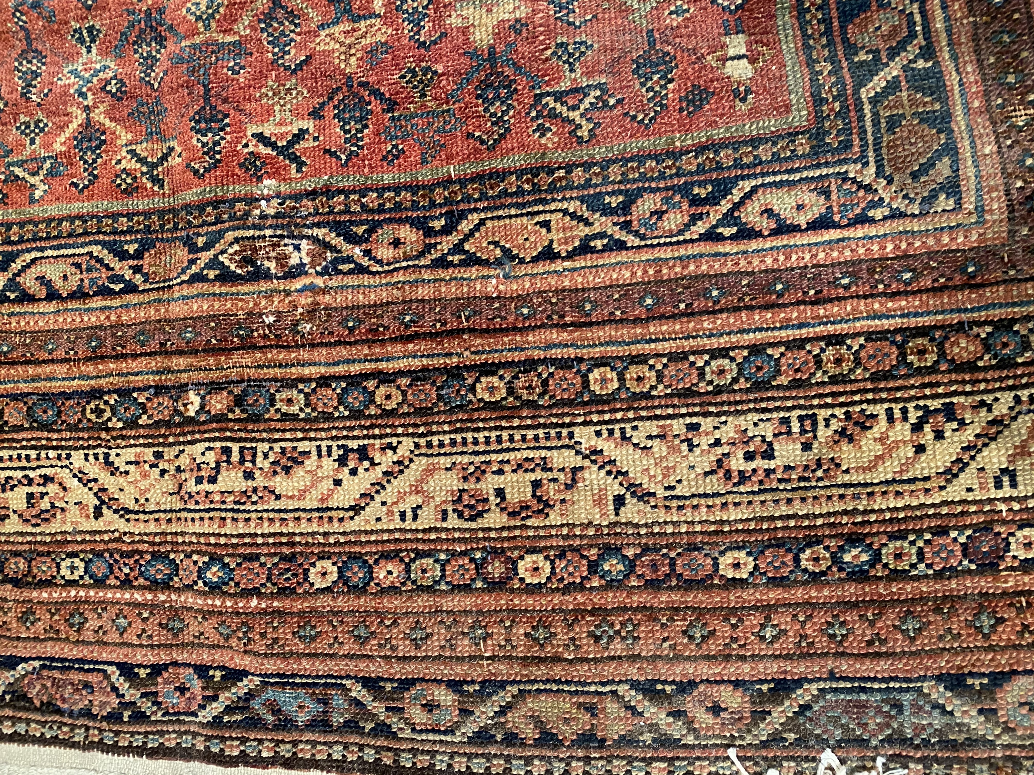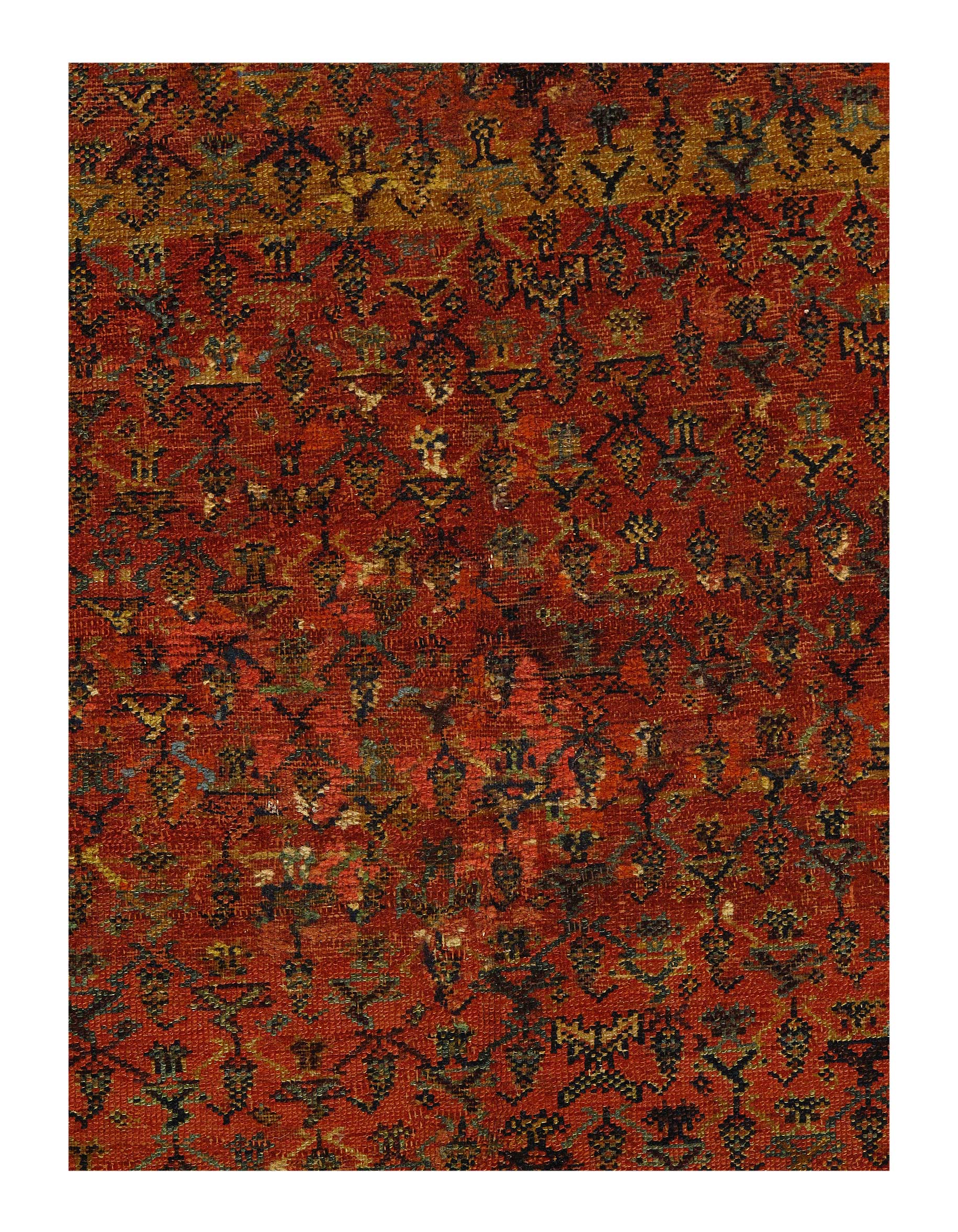Antique Malayer Runner, Like many gorgeous Malayer runners, this piece is designed to lead the eye down through the vibrant collection of shapes and tones. A soft beige background defines the largest border that the carpet; a pleasant collection of angular flowers create flow and movement within this border, standing out against the backdrop. The large frame is further hemmed by two beautiful red lines, containing a series of diagonally running green forms. An rust background creates an elegant flow at the center of the runner, allowing the forms within to appear even more defined.