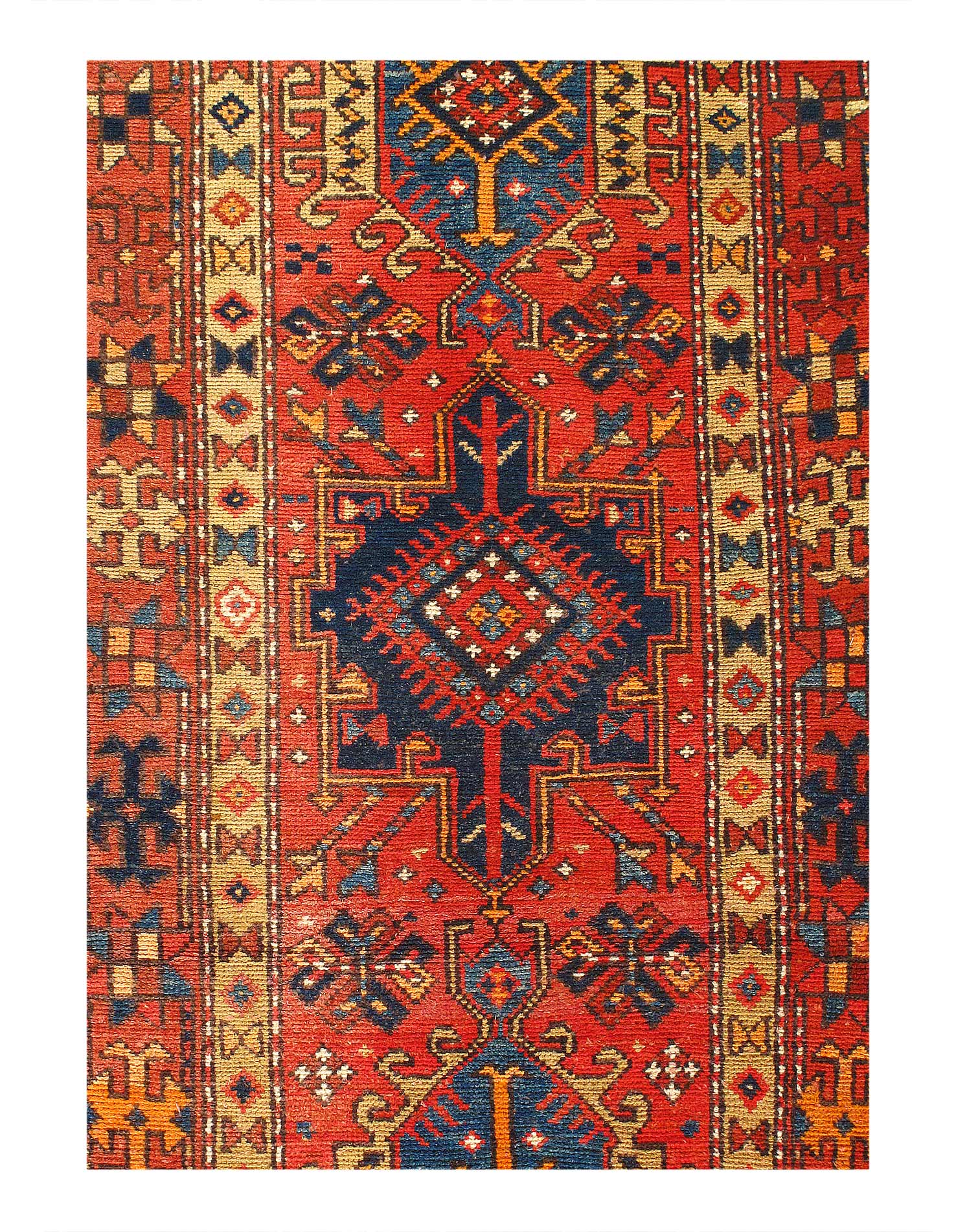 Antique Tribal Heriz Serapi Persian Runner Rug, Country of origin: Persia, Circa Date: Late 19th Century – While Heriz carpets in a runner format are not uncommon, most are known under the term of Karadja. Serapi Heriz runners like this one, however, are very rare. The strongly tribal field design with its abstract latchhook and ‘Lenkoran Turtle’ medallions is derived from the village rugs produced further north in the Caucasus, as are the geometric space-fillers. The serrated vine-scroll and rosette borders, however, are classic Persian or Serapi Heriz, along with the distinctive palette of soft blues and Rust set against rich red.