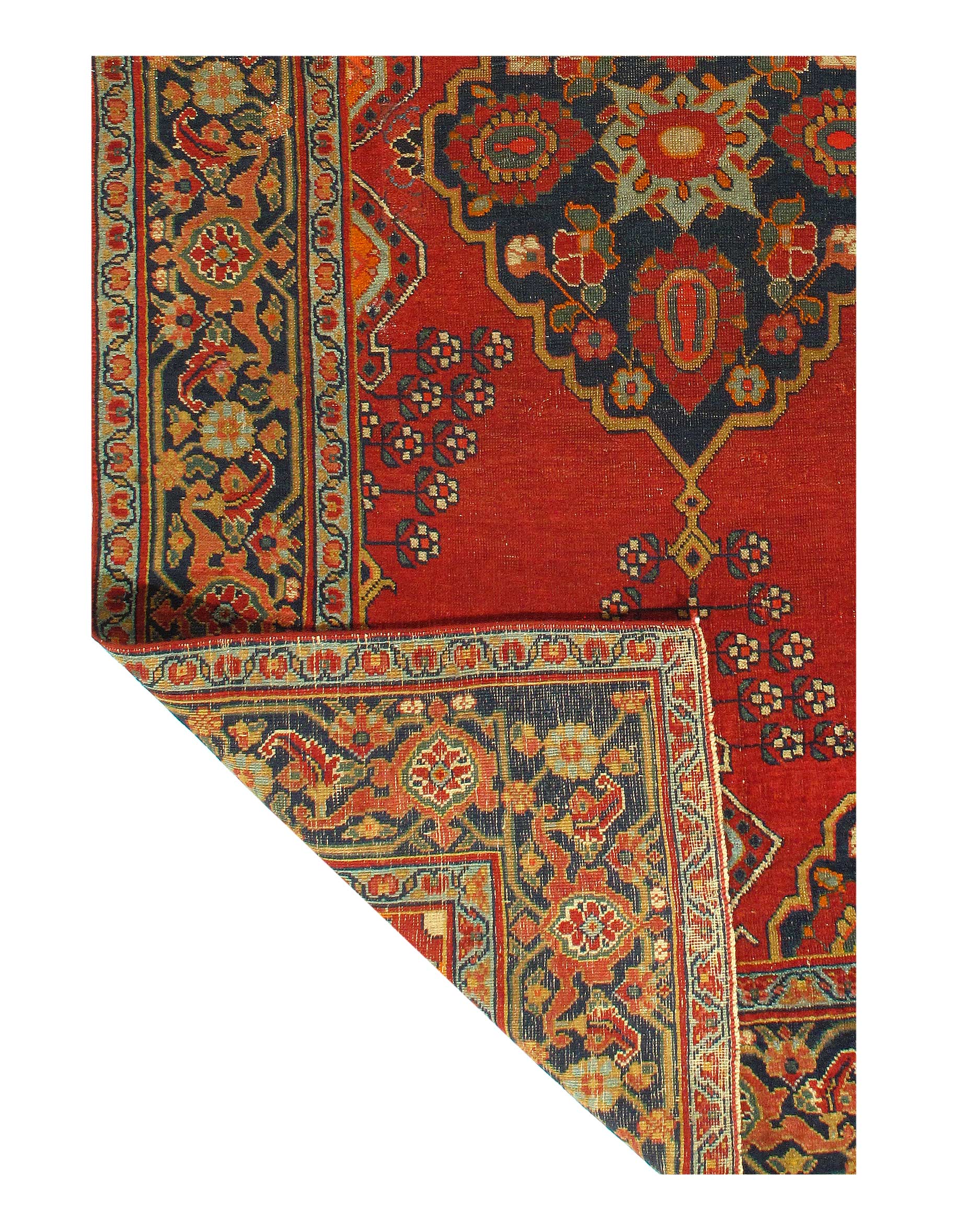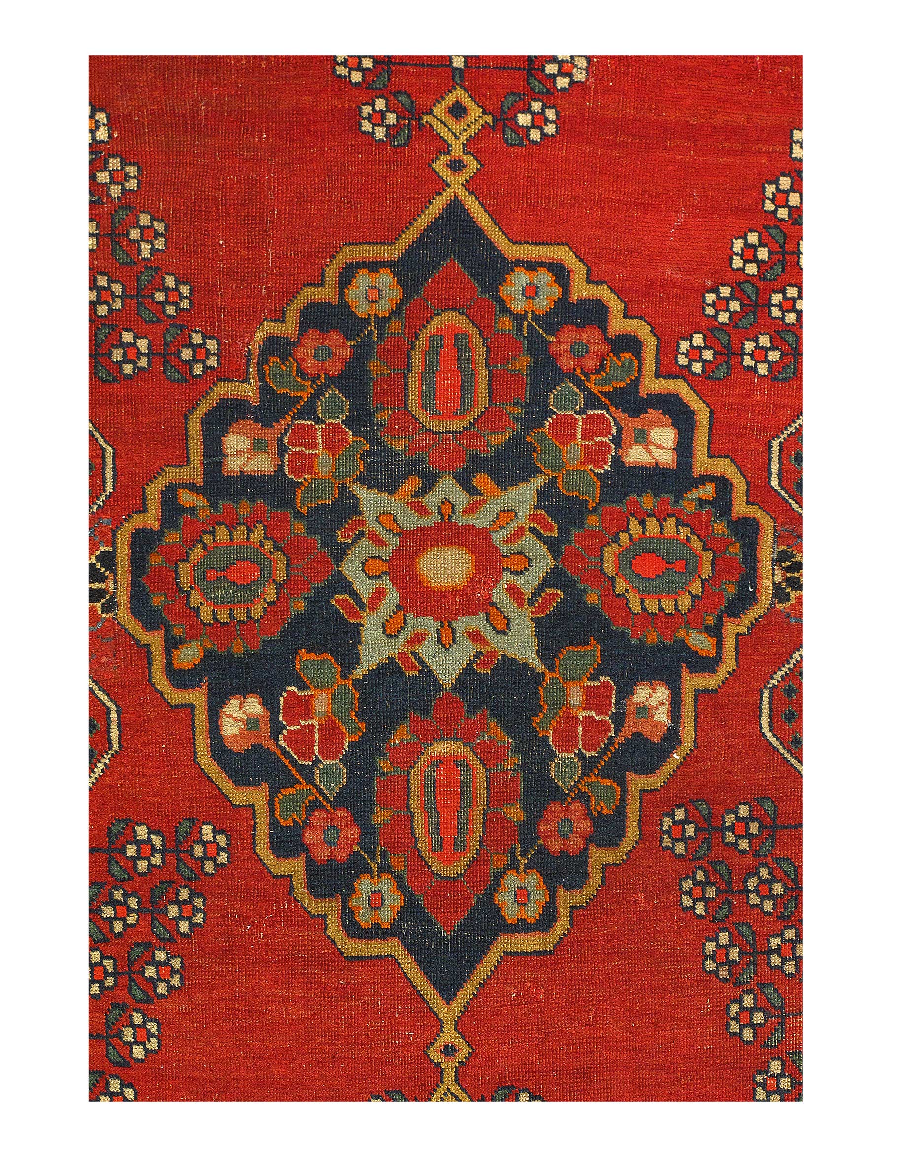 This beautiful antique Persian rug is a choice example of the Bakshaish Rugs, boasting many of the qualities most sought after in such pieces. The monumental medallion of striking red that dominates the piece is a brilliant articulation of the Bakshaish tendency to utilize bright, rich tones. Similarly, the abstract geometric design elements that pepper the field of blue are a typical Bakshaish element, their careful lines and unique shapes characteristic of an ancient concept of design that is as powerful to behold today as it has ever been. Geometric figures of alternating color populate the paneled border, each seemingly dancing in its own square. The strength of the overall composition of this splendid Bakshaish lives in its rich colors, abstract geometric figuring, and graphic boldness, which combine to create a beautiful and representative piece of art.