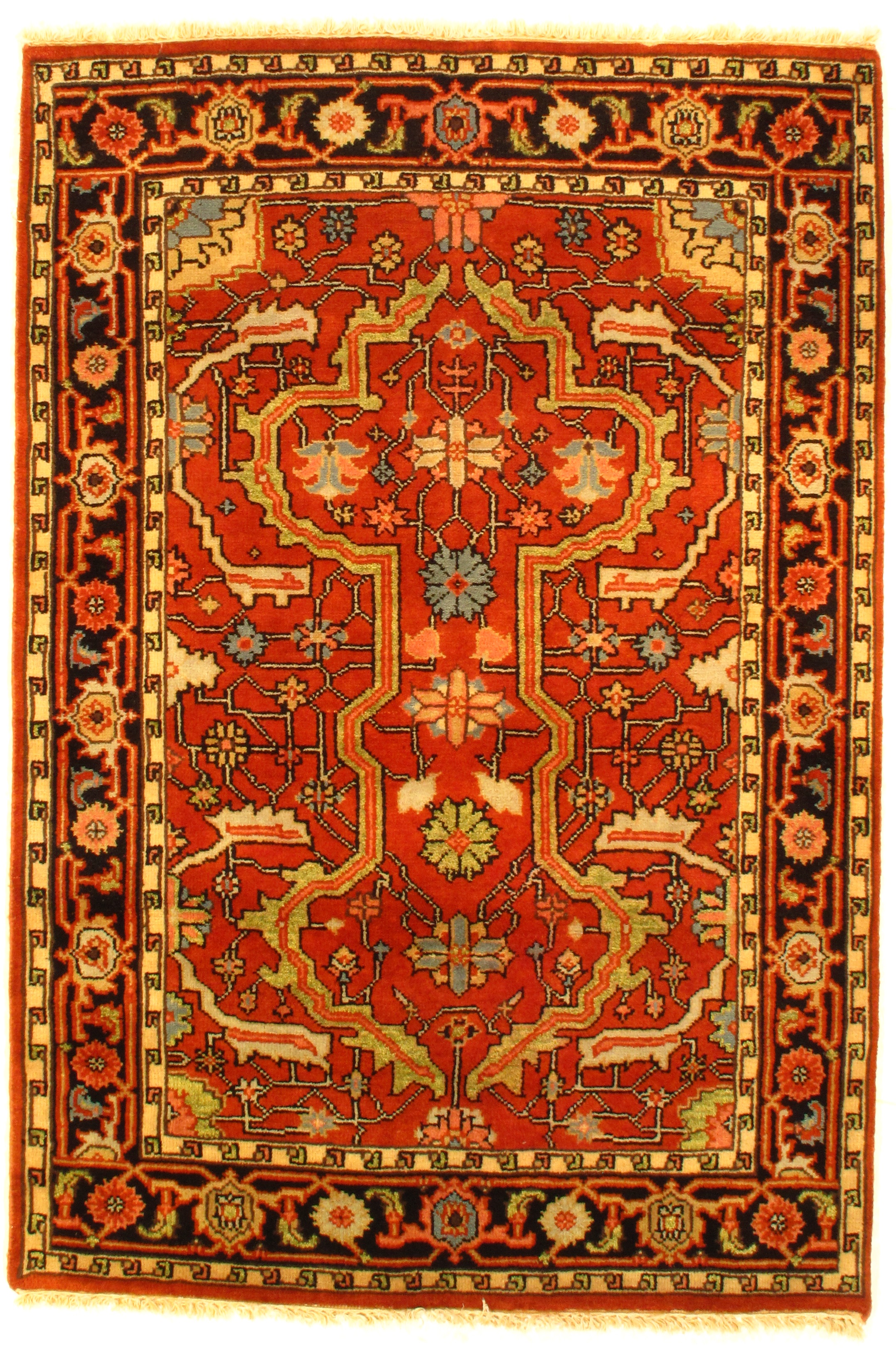 Indo Serapi design rug. Handmade and hand-knotted in fine lambswool on a cotton foundation. Vegetable dyed hand-spun wool rug.