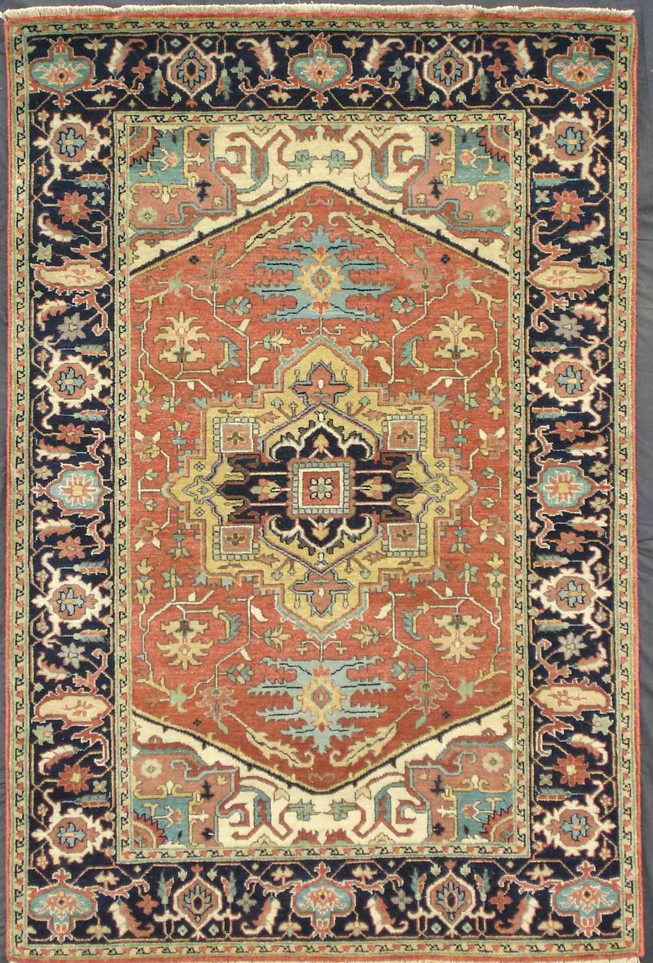 Indo Serapi design rug. Handmade and hand-knotted in fine lambswool on a cotton foundation. Vegetable dyed hand-spun wool rug.