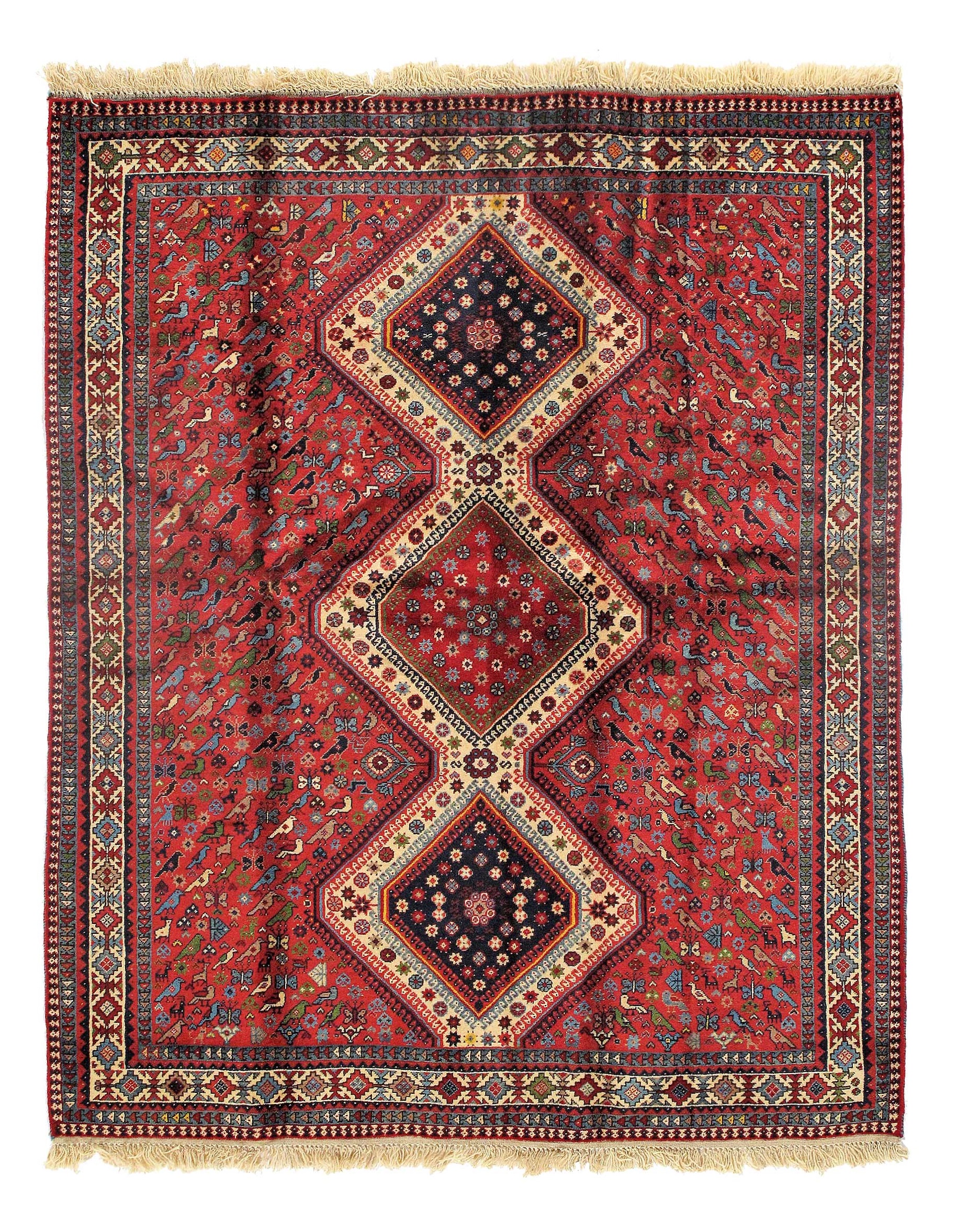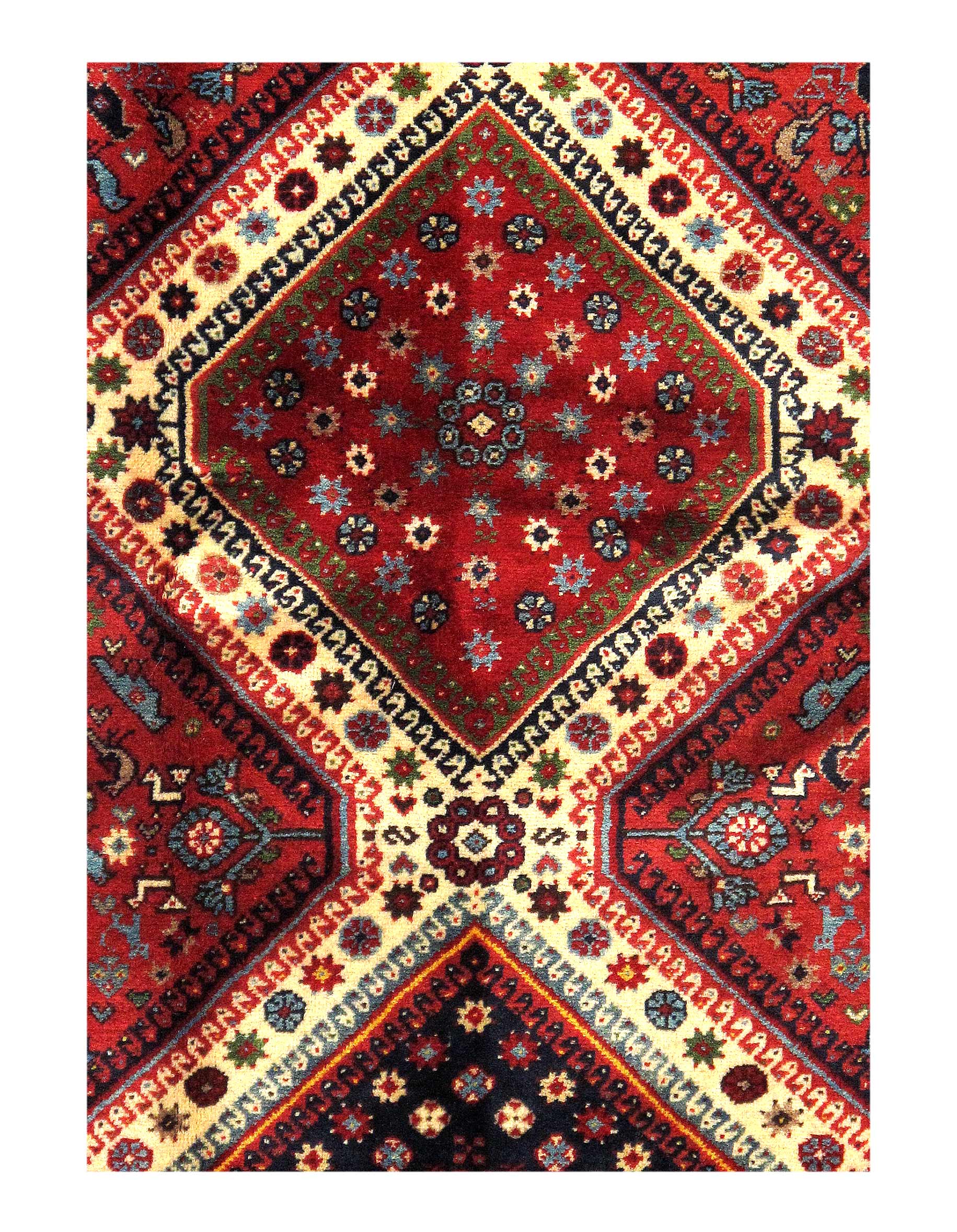 The pile used in Yalameh rugs is very fine, particularly in comparison to other tribal designs, using soft wool based on a Wool foundation. The pattern is distinctive with large repeated diamonds in a straight line down the carpet, often with geometrical animal or human prints scattered across the field. Dark red or light brown on a blue or orange background is most common for Yalameh, similar to Shiraz rugs, the rugs compliment modern or minimalist furniture beautifully, giving the living space an aura of luxurious style and warm.