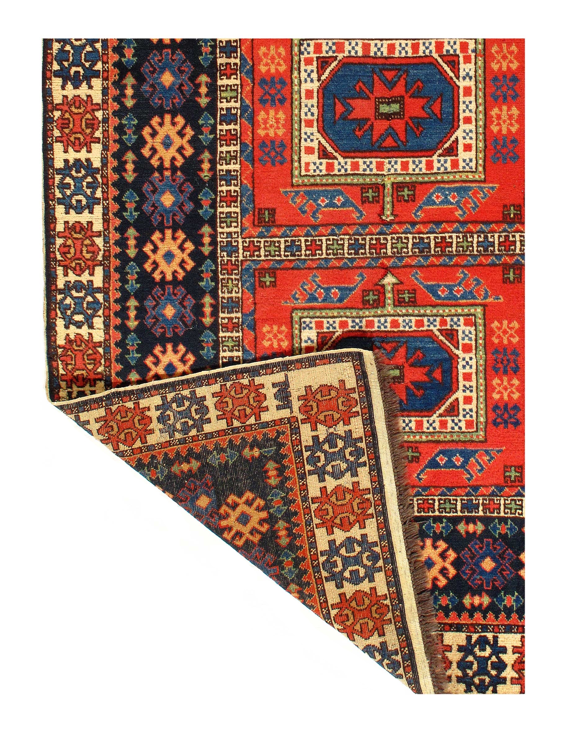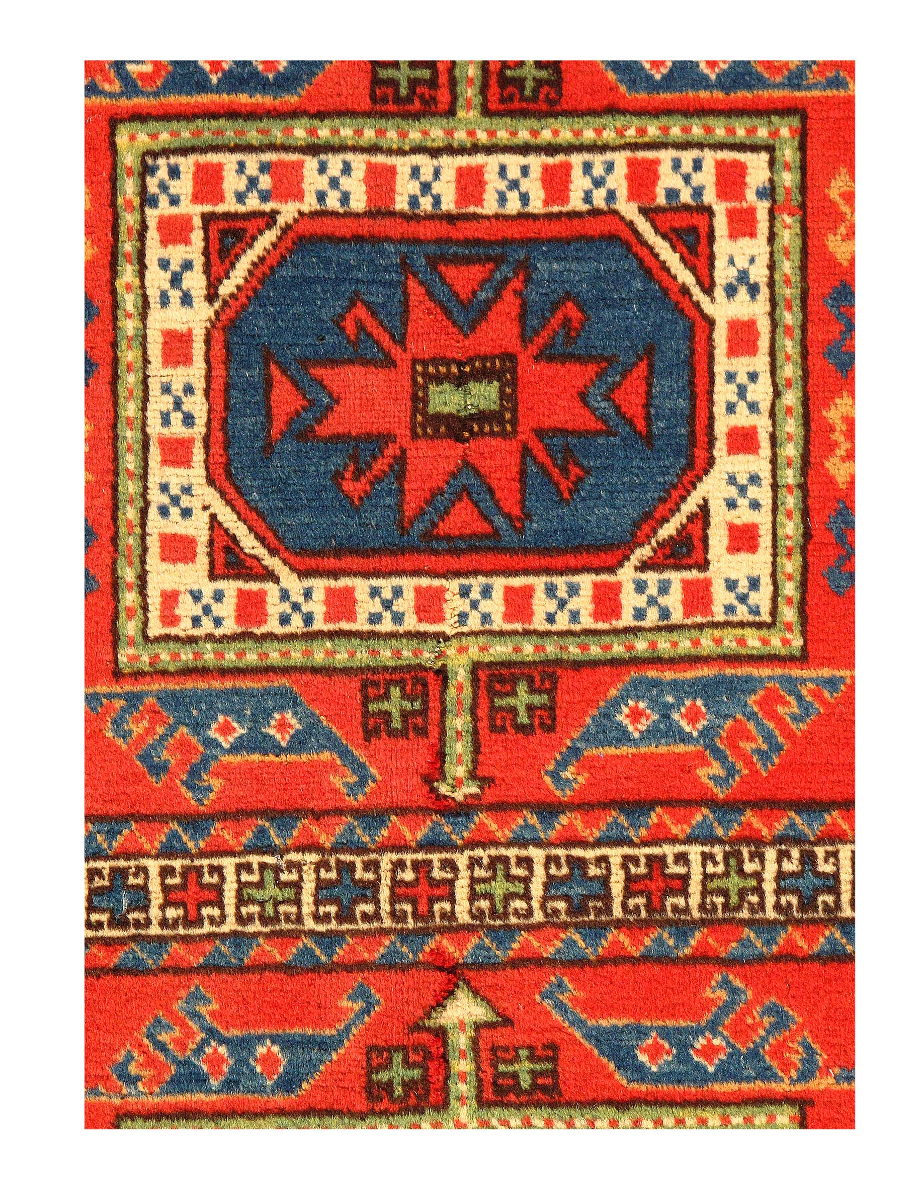 Kazak is a modern shape of old Caucasian rugs which strictly adheres to traditional design elements of the Caucasus. It has elements such as the stepped hooked polygons, geometrical medallions and rosettes, presented in more stylized manner and with a new dimension. Natural dyes produce soft luminous shades and abrashes causing a beautiful sheen. Handspun wool yarn is normally used in the variety of vibrant warm colors.