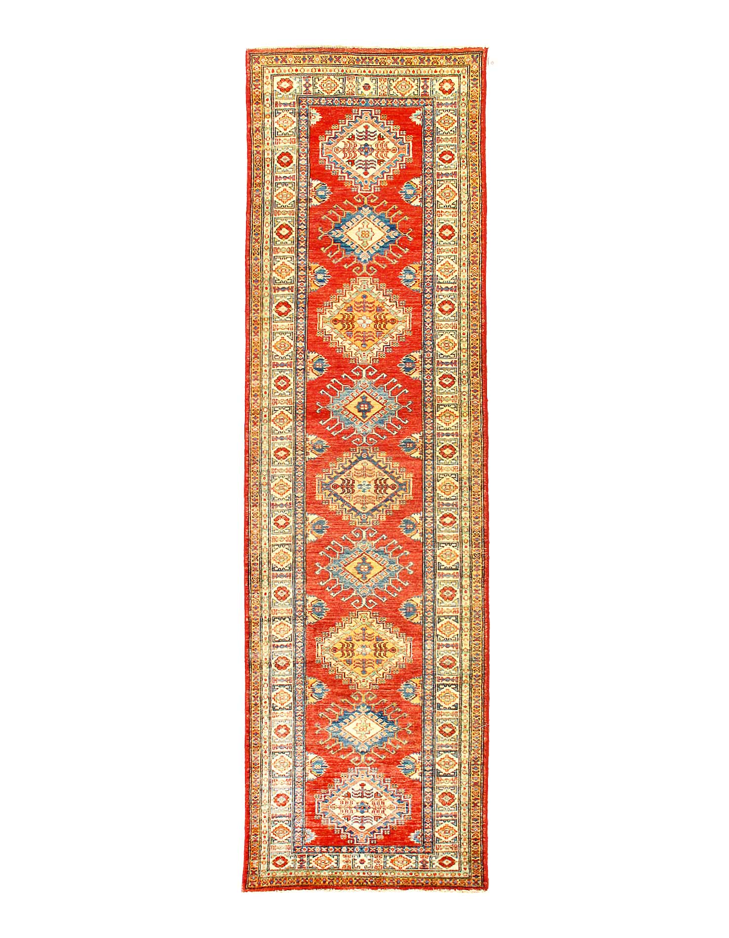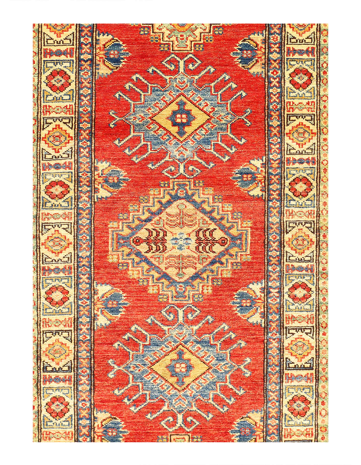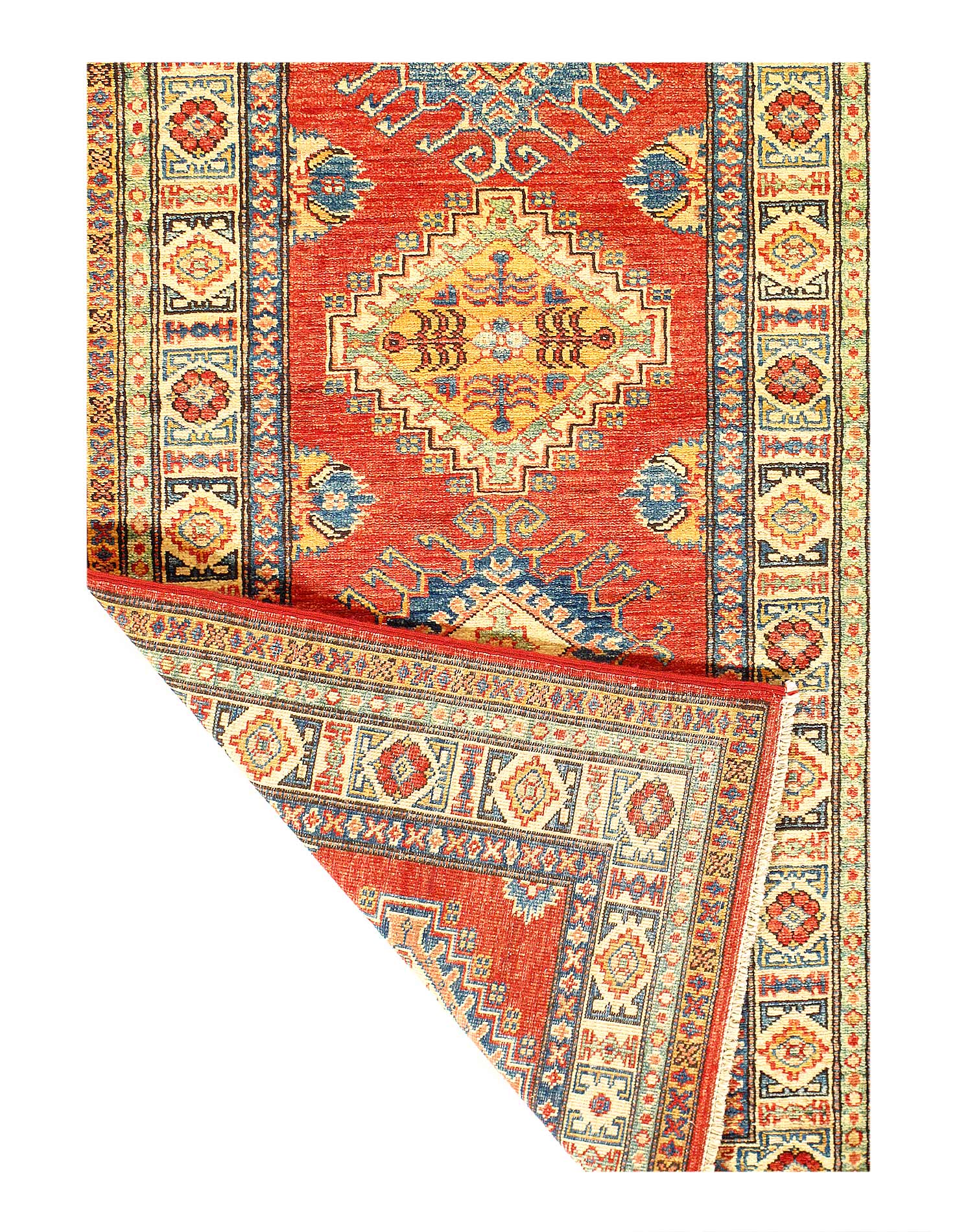 Kazak is a modern shape of old Caucasian rugs which strictly adheres to traditional design elements of the Caucasus. It has elements such as the stepped hooked polygons, geometrical medallions and rosettes, presented in more stylized manner and with a new dimension. Natural dyes produce soft luminous shades and abrashes causing a beautiful sheen. Hand spun wool yarn is normally used in the variety of vibrant warm colors. Kazaks rugs in our collection are all fine quality pieces from Pakistan made with Ghazni hand spun wool and natural dyes.