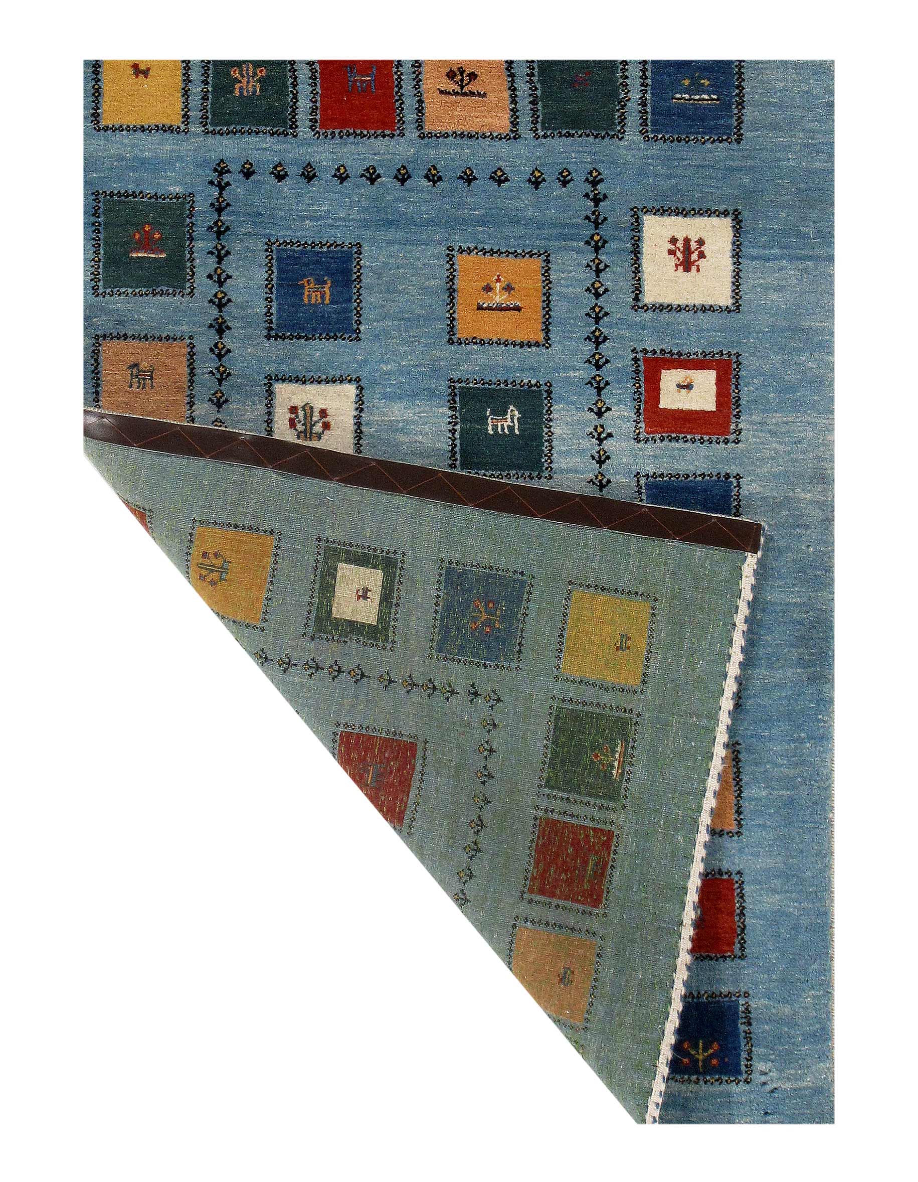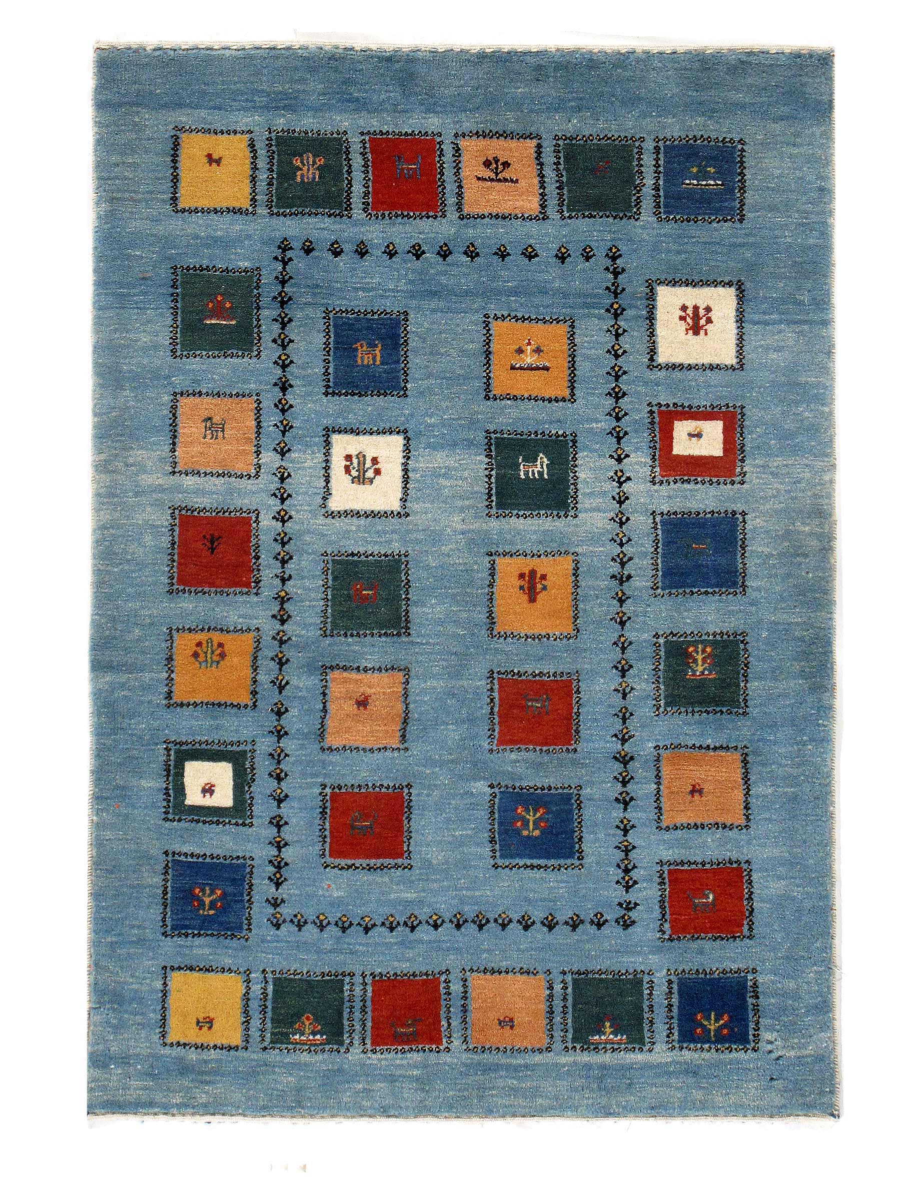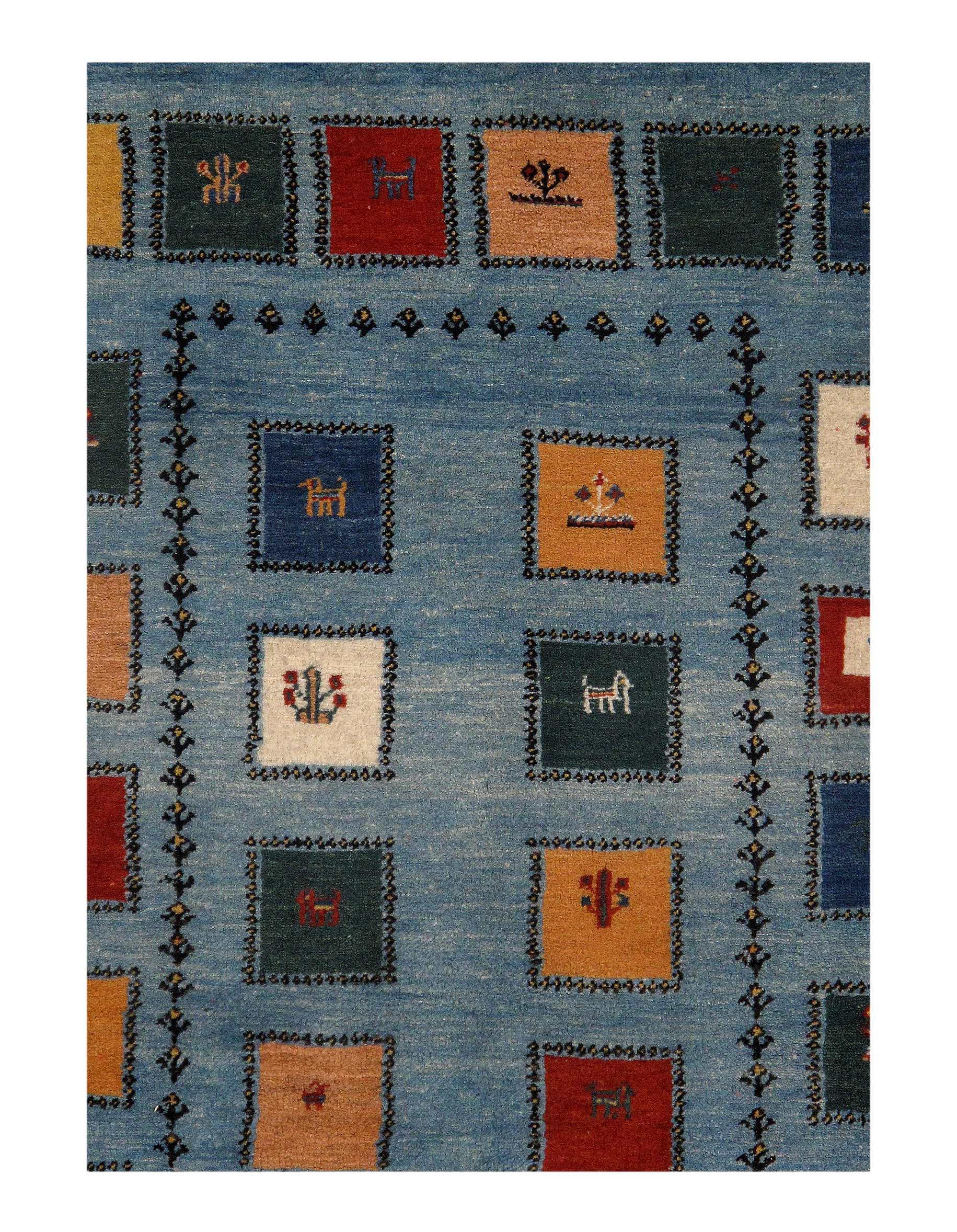 A Gabbeh is a handmade Persian rug which were traditionally woven by Qashqai and Luri weavers in Iran. These rugs are and were simple, whimsical or modern in design, often using geometric and stylized human, animal and plant forms.