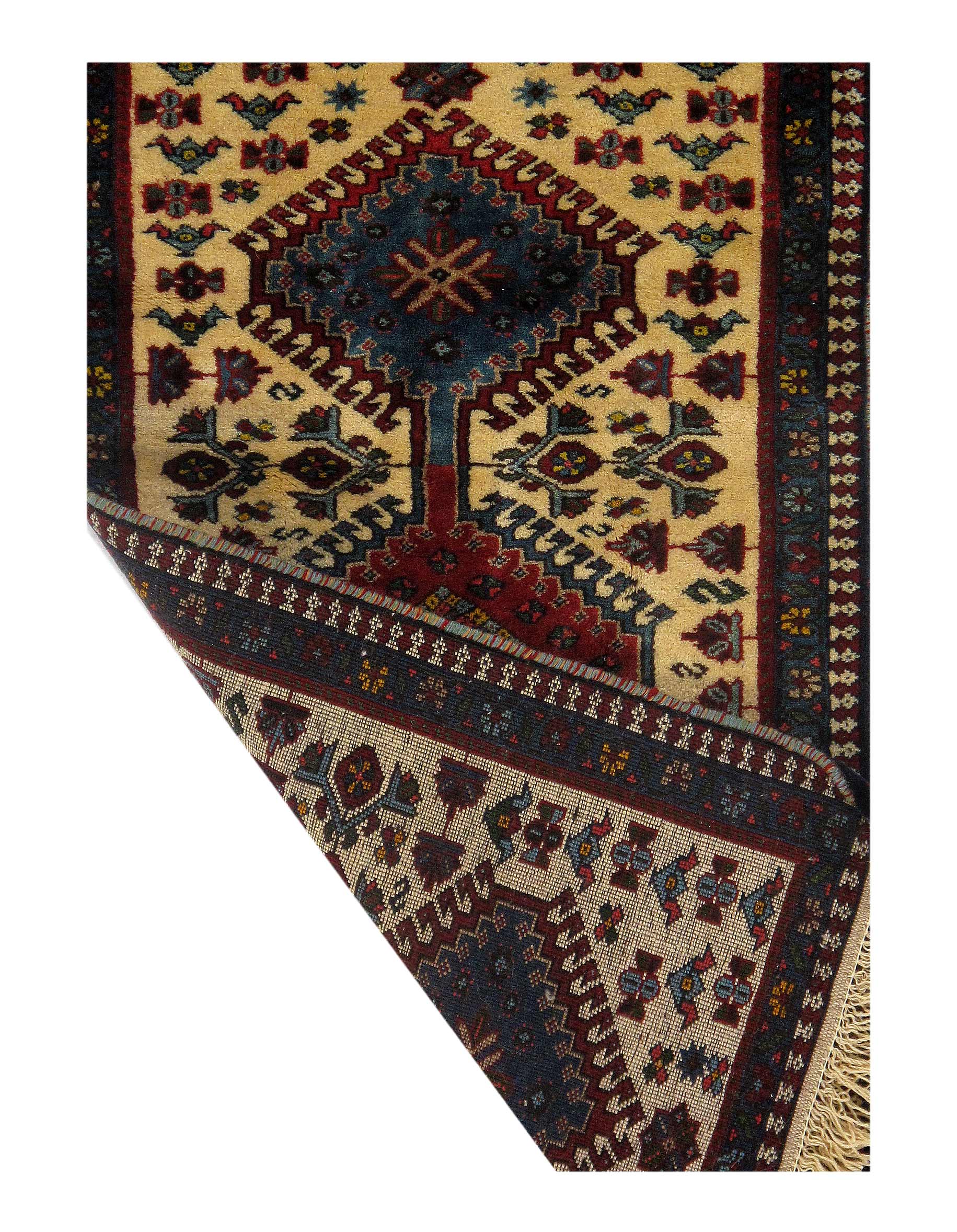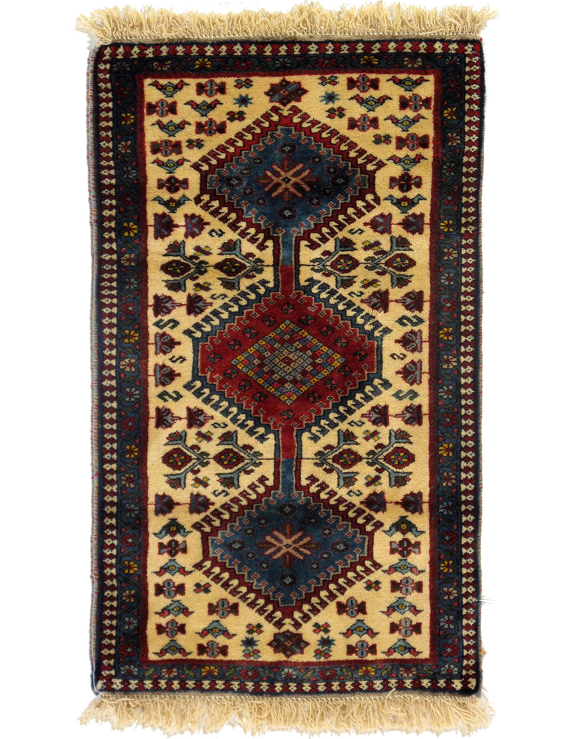 The pile used in Yalameh rugs is very fine, particularly in comparison to other tribal designs, using soft wool based on a Wool foundation. The pattern is distinctive with large repeated diamonds in a straight line down the carpet, often with geometrical animal or human prints scattered across the field. Dark red or light brown on a blue or orange background is most common for Yalameh, similar to Shiraz rugs, the rugs compliment modern or minimalist furniture beautifully, giving the living space an aura of luxurious style and warm.