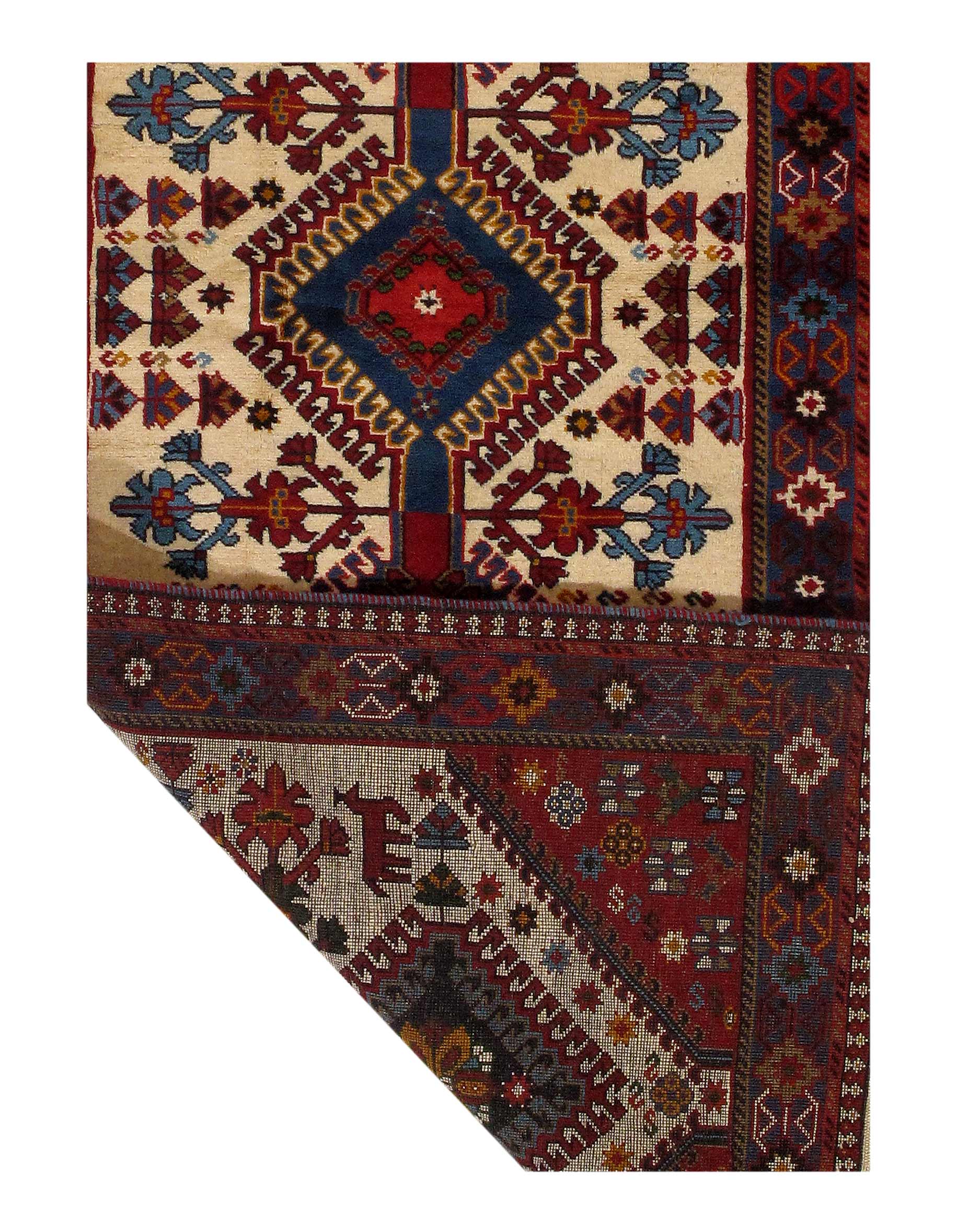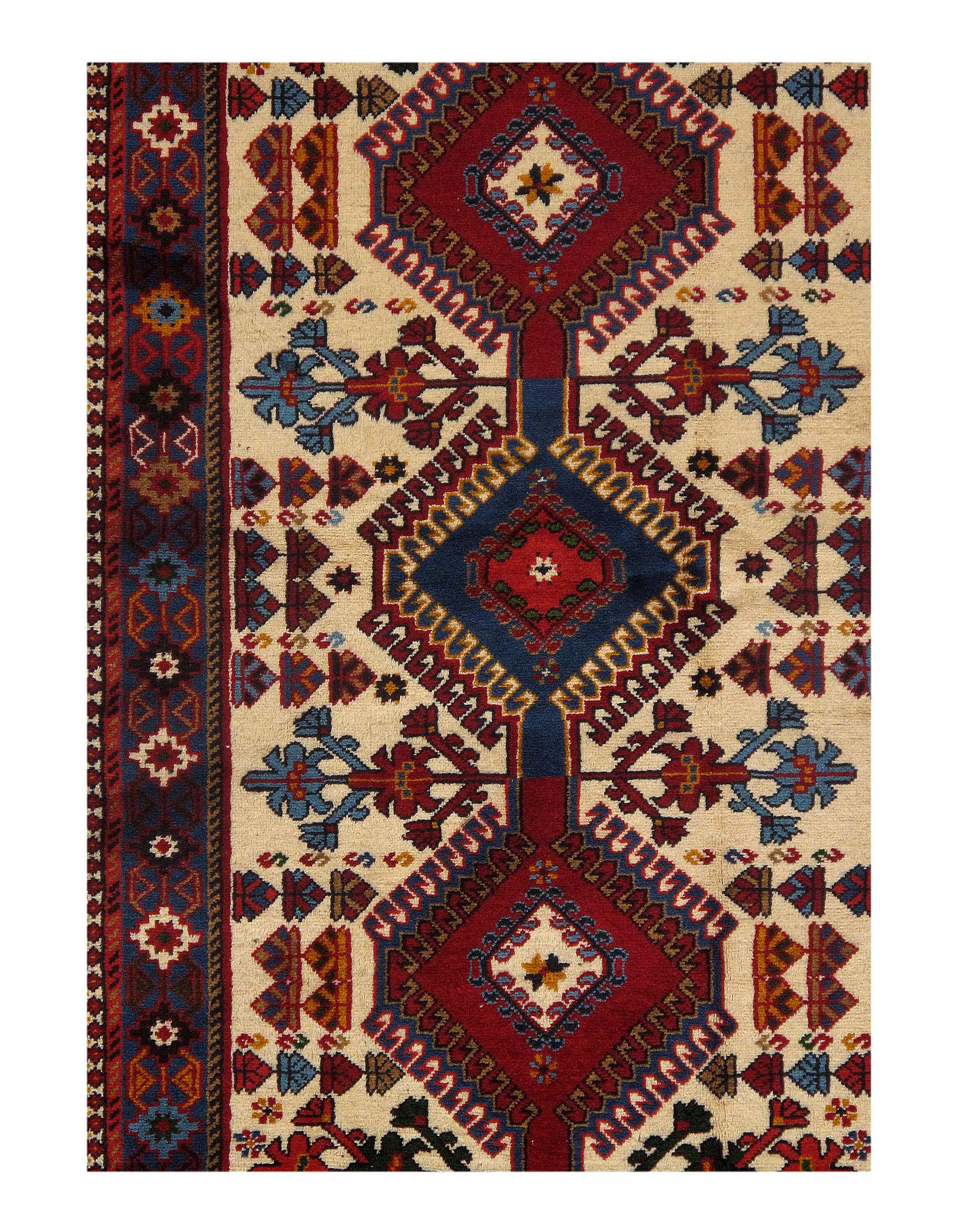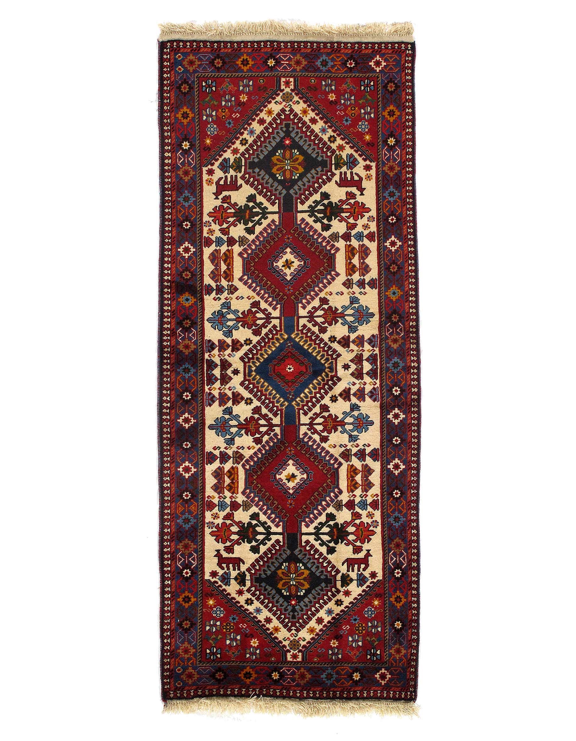 The pile used in Yalameh rugs is very fine, particularly in comparison to other tribal designs, using soft wool based on a Wool foundation. The pattern is distinctive with large repeated diamonds in a straight line down the carpet, often with geometrical animal or human prints scattered across the field. Dark red or light brown on a blue or orange background is most common for Yalameh, similar to Shiraz rugs, the rugs compliment modern or minimalist furniture beautifully, giving the living space an aura of luxurious style and warm.