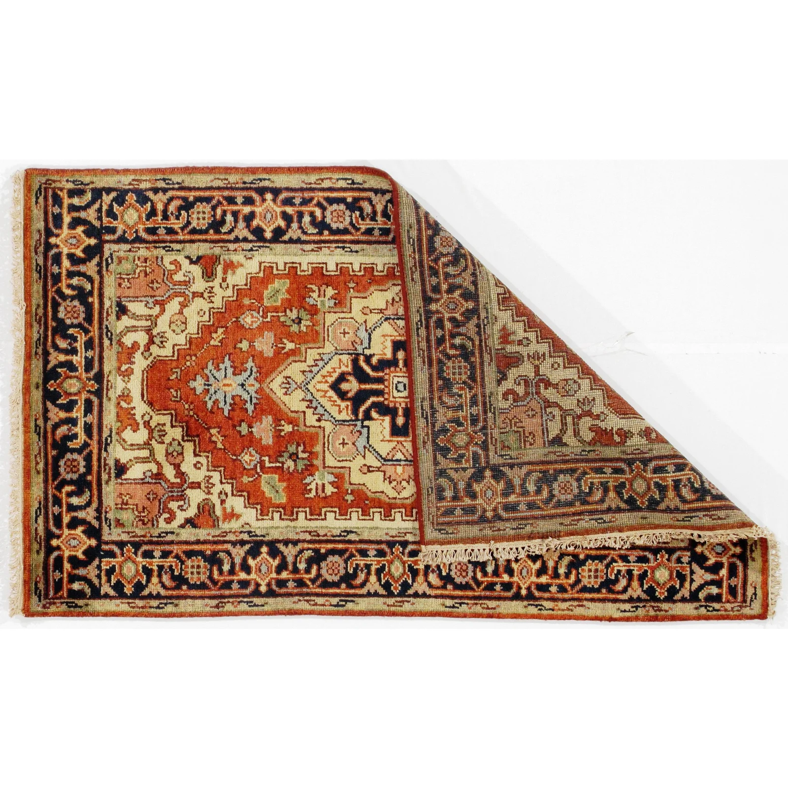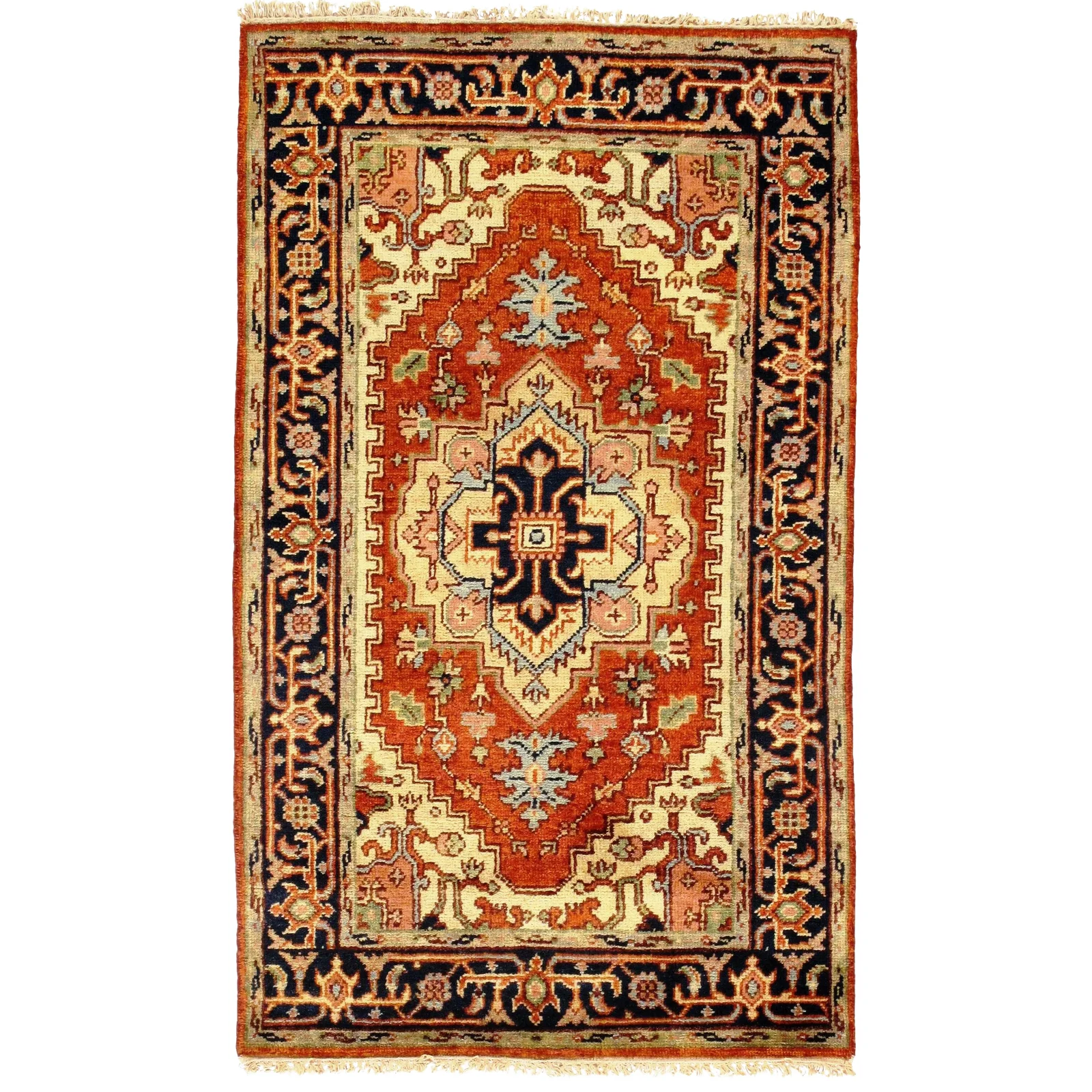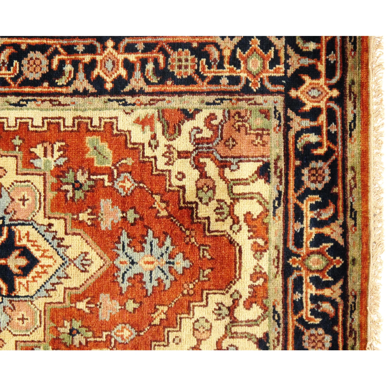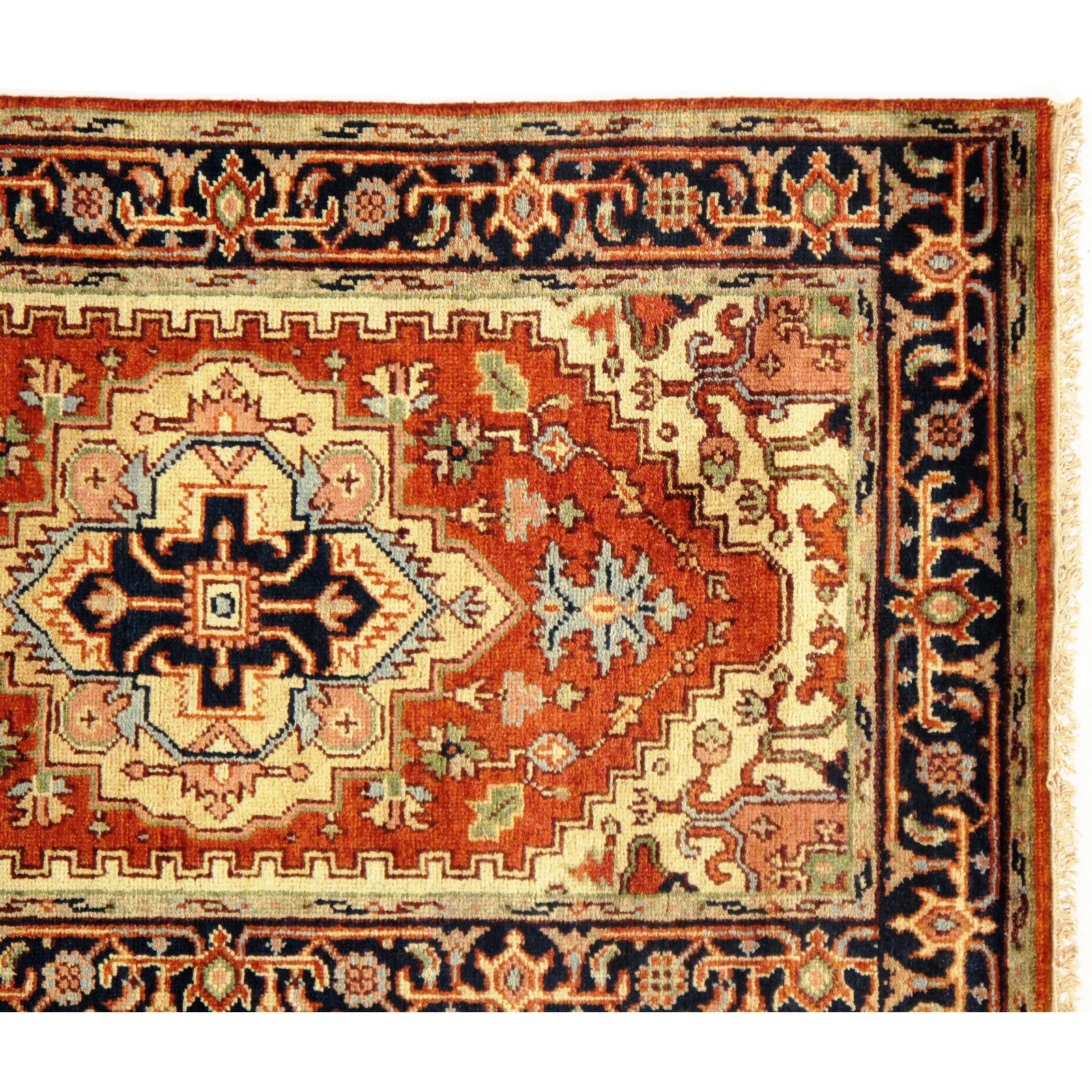 Indo Serapi design rug. Handmade Hand-knotted in fine lambswool. Lamb's Wool on a Cotton Foundation Vegetable Dyed Hand-Spun Wool Rug The Serapi Rug is one of the most sought after rugs particularly in the USA and England for many years. No other rug so epitomizes the "East Coast Establishment" than the Serapi carpet This rug has a dense, soft pile, and excellent quality, to ensure that you will enjoy the look and feel of your rug for years to come D08949