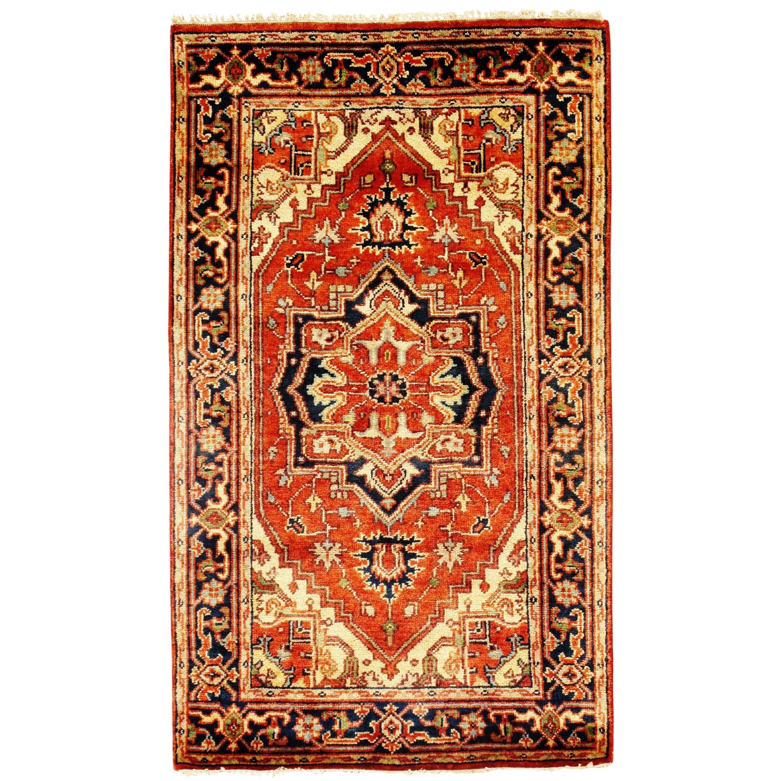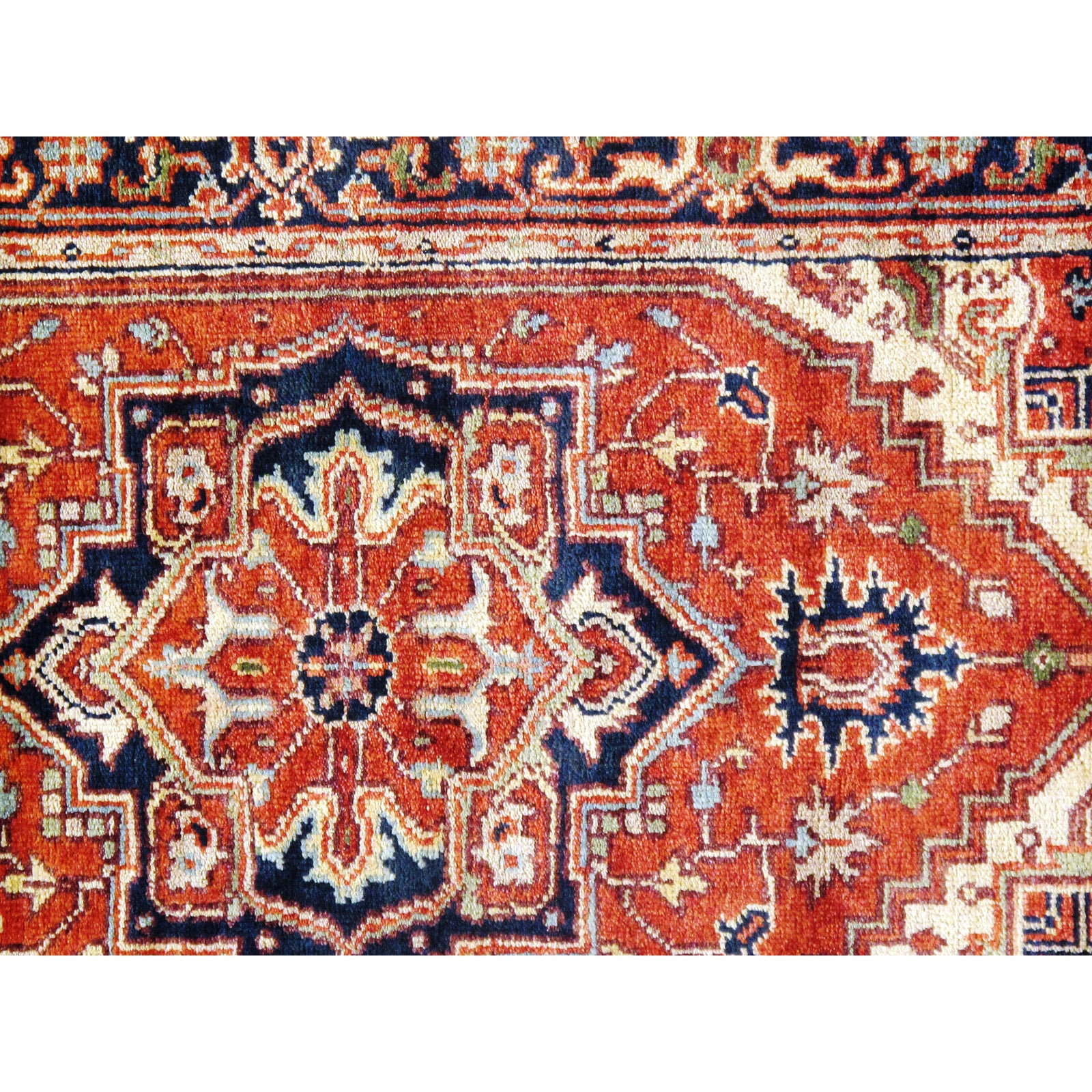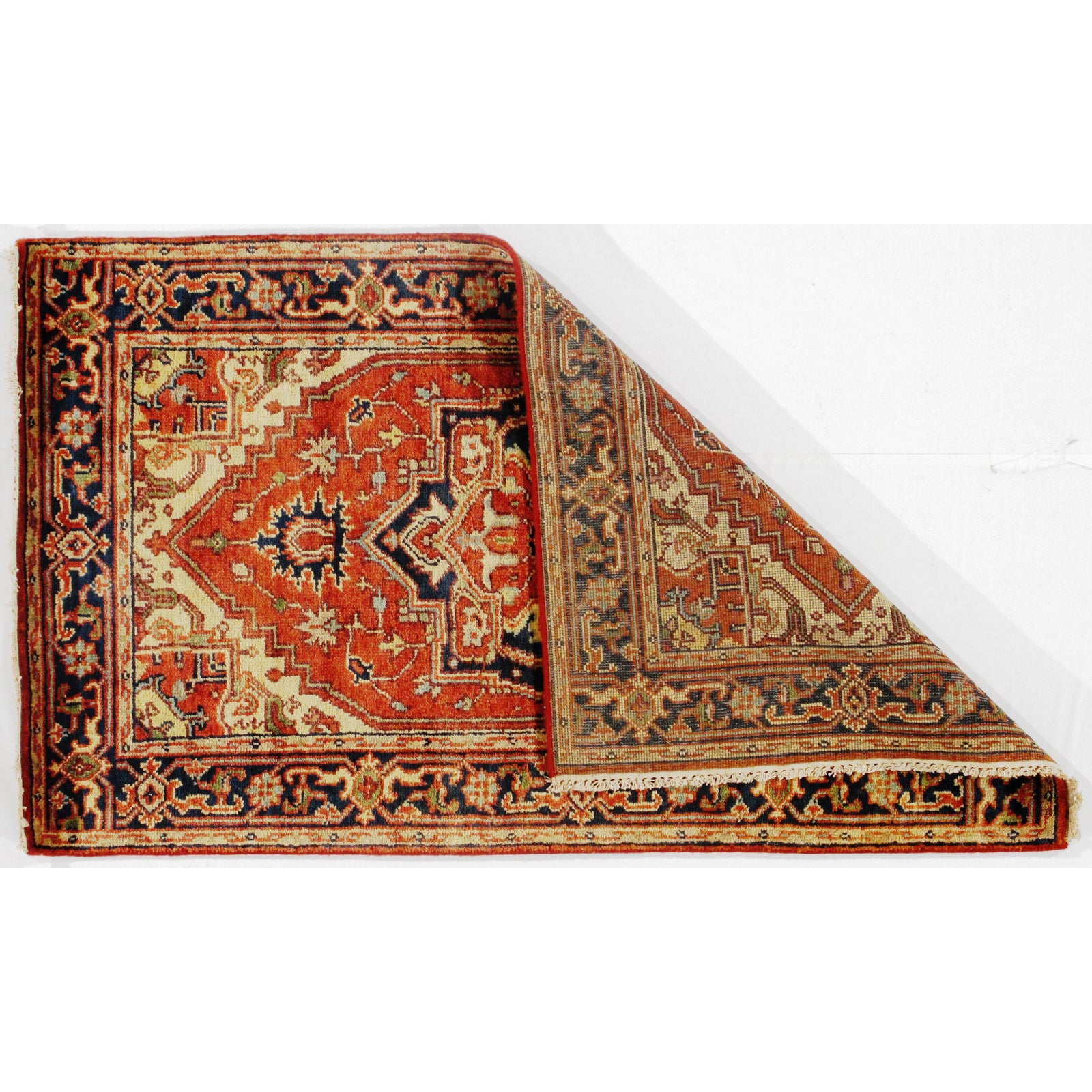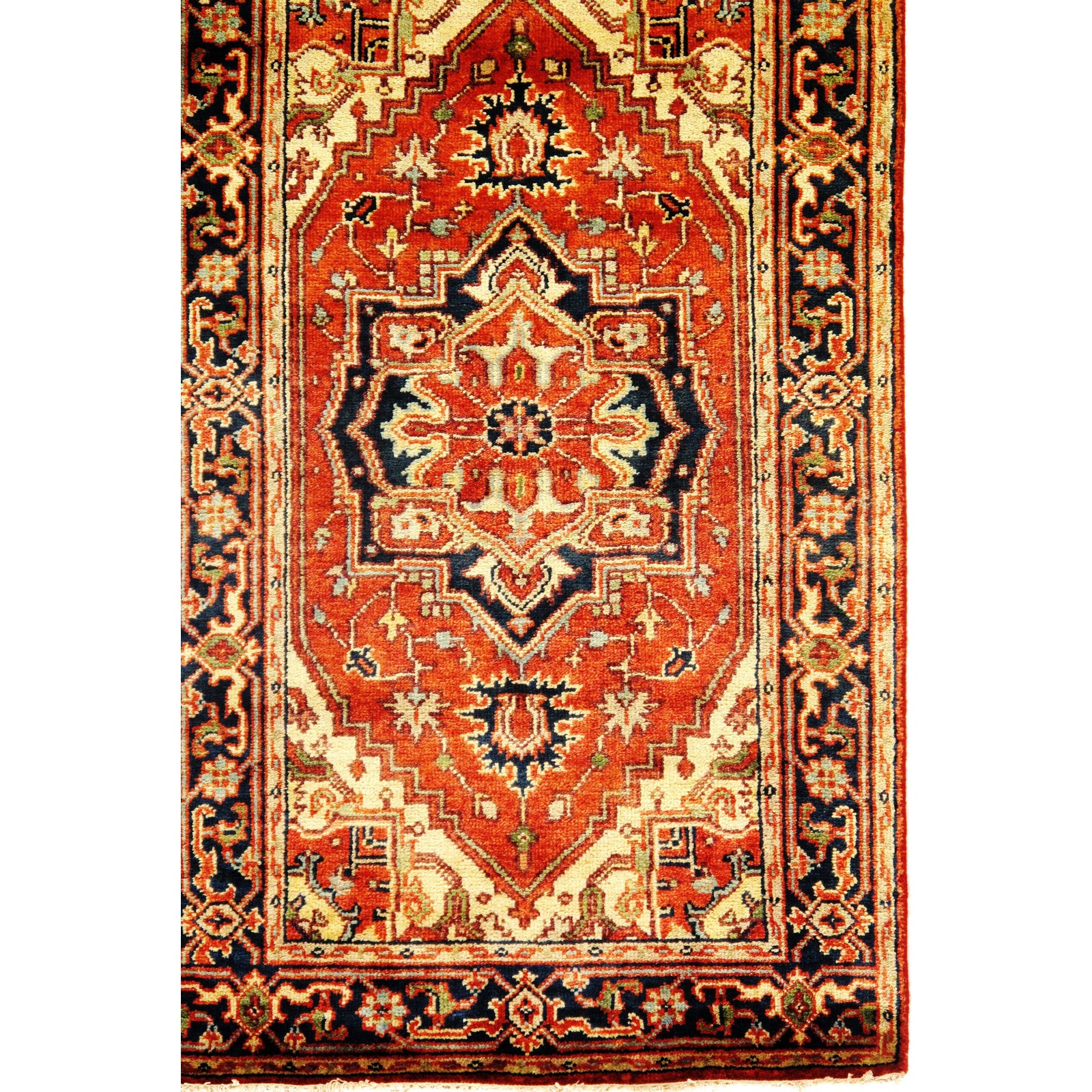 Indo Serapi design rug. Handmade Hand-knotted in fine lambswool. Lamb's Wool on a Cotton Foundation Vegetable Dyed Hand-Spun Wool Rug The Serapi Rug is one of the most sought after rugs particularly in the USA and England for many years. No other rug so epitomizes the "East Coast Establishment" than the Serapi carpet This rug has a dense, soft pile, and excellent quality, to ensure that you will enjoy the look and feel of your rug for years to come