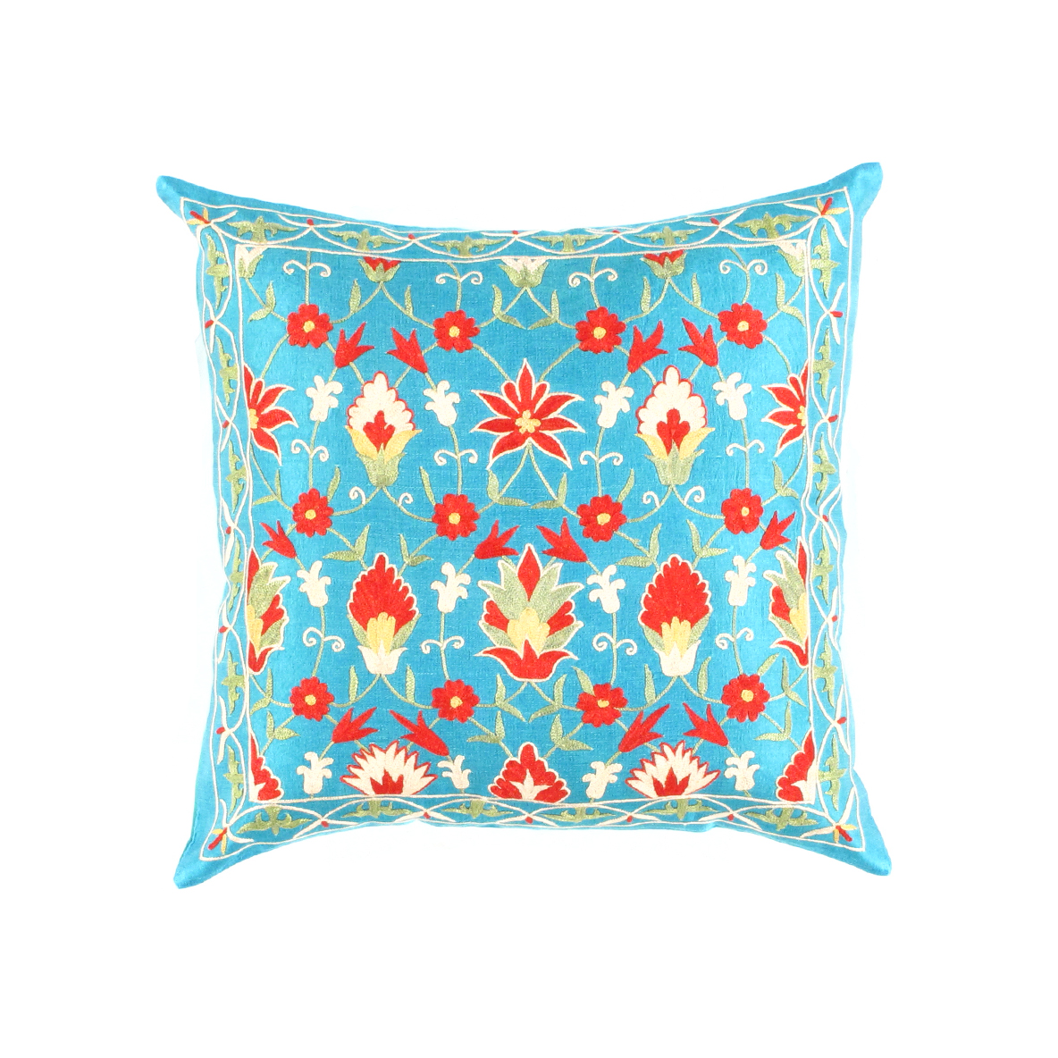● True to the “needle” origin of the Persian word suzani, these pillows are embroidered with traditional floral motifs in richly coloured patterns that define this historic style.