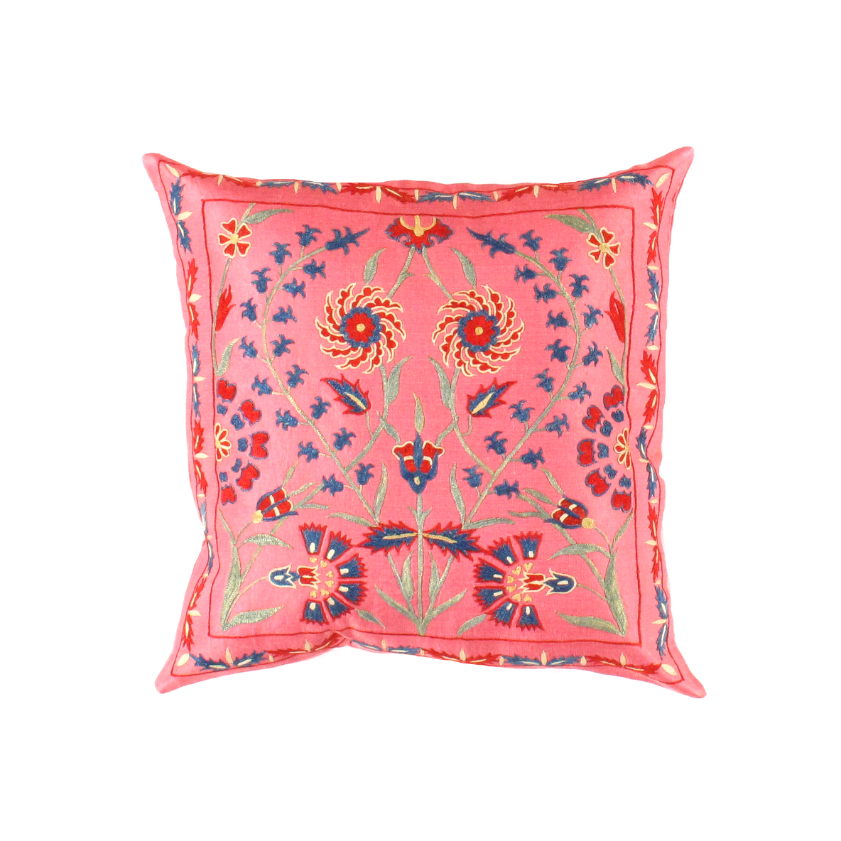● True to the “needle” origin of the Persian word suzani, these pillows are embroidered with traditional floral motifs in richly coloured patterns that define this historic style.