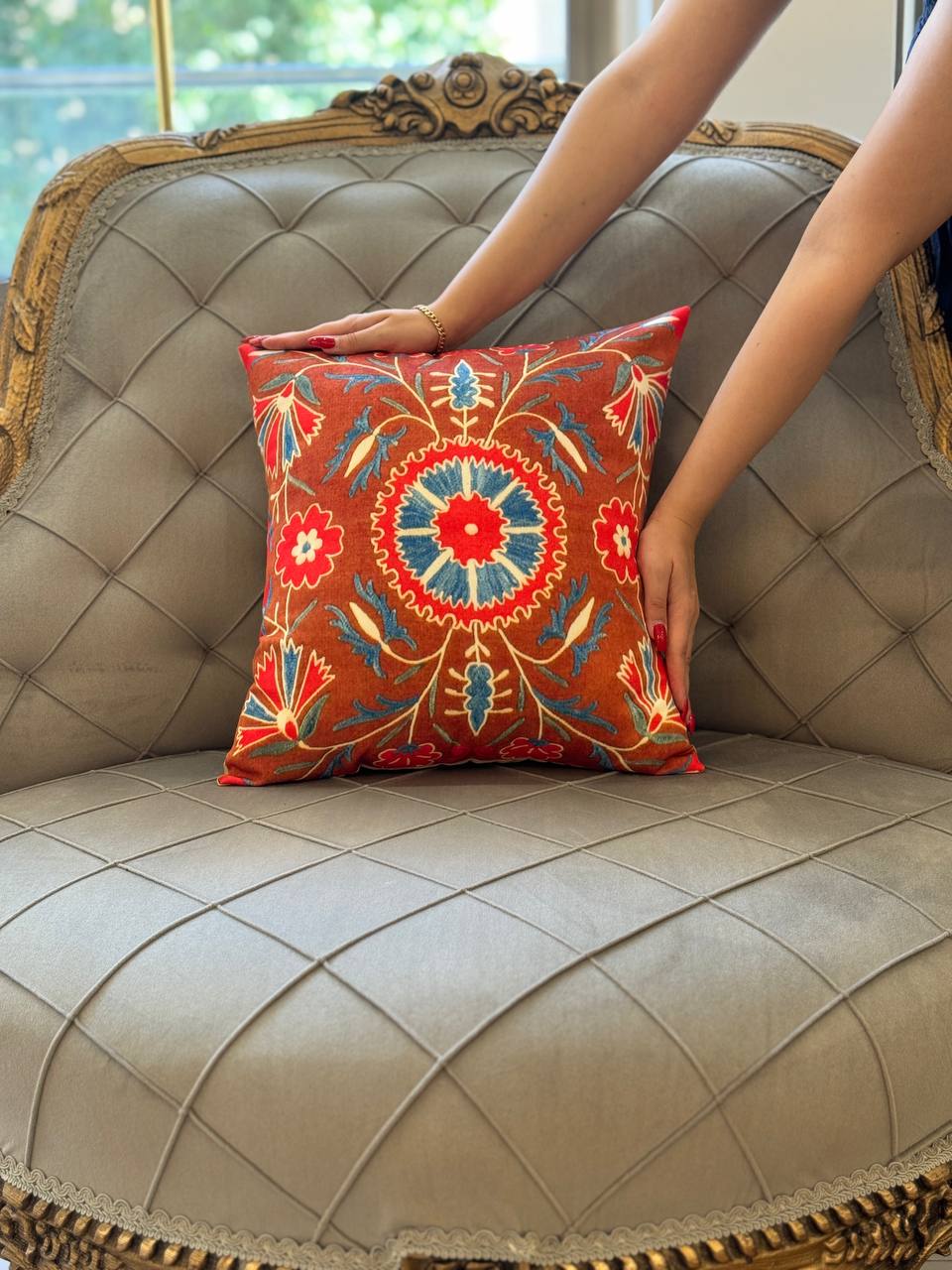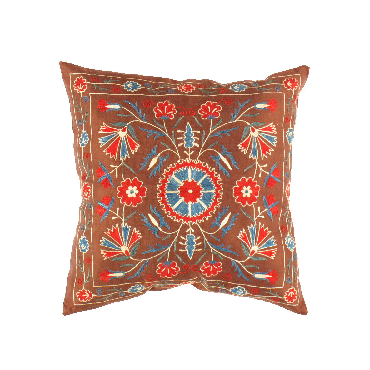 ● True to the “needle” origin of the Persian word suzani, these pillows are embroidered with traditional floral motifs in richly coloured patterns that define this historic style.