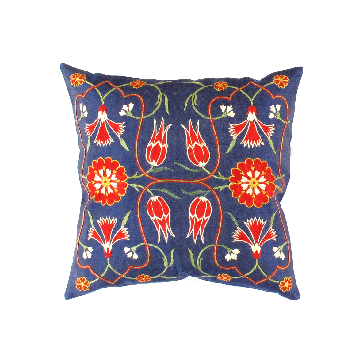 ● True to the “needle” origin of the Persian word suzani, these pillows are embroidered with traditional floral motifs in richly coloured patterns that define this historic style.