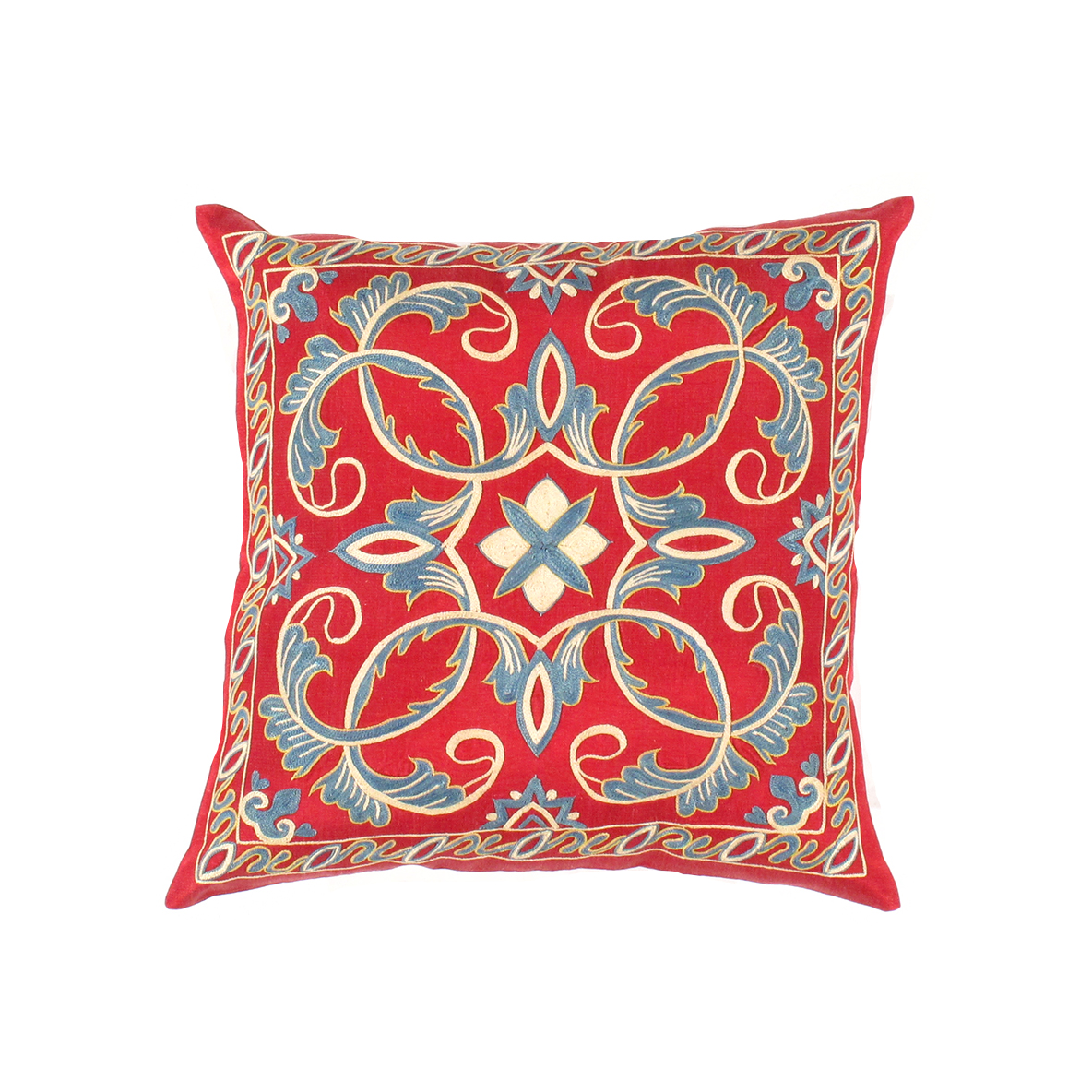 ● True to the “needle” origin of the Persian word suzani, these pillows are embroidered with traditional floral motifs in richly coloured patterns that define this historic style.