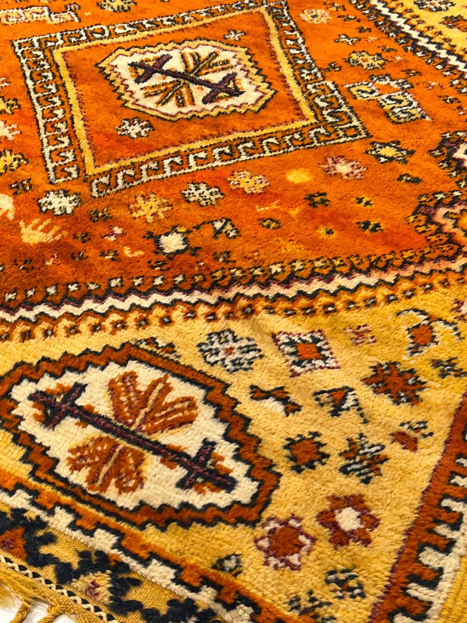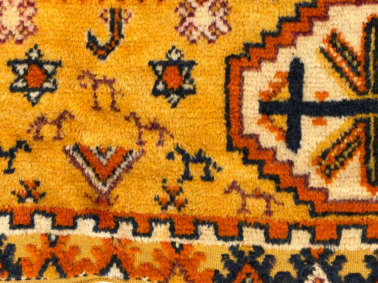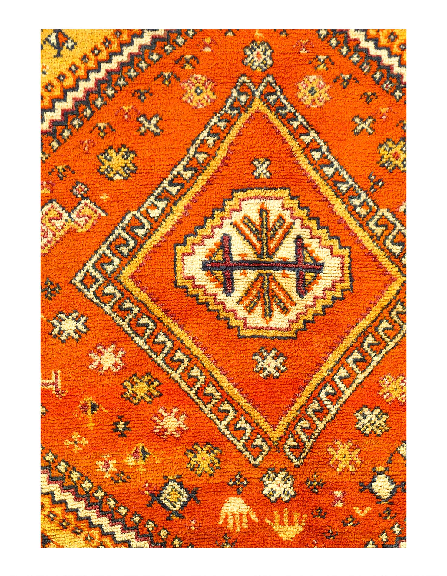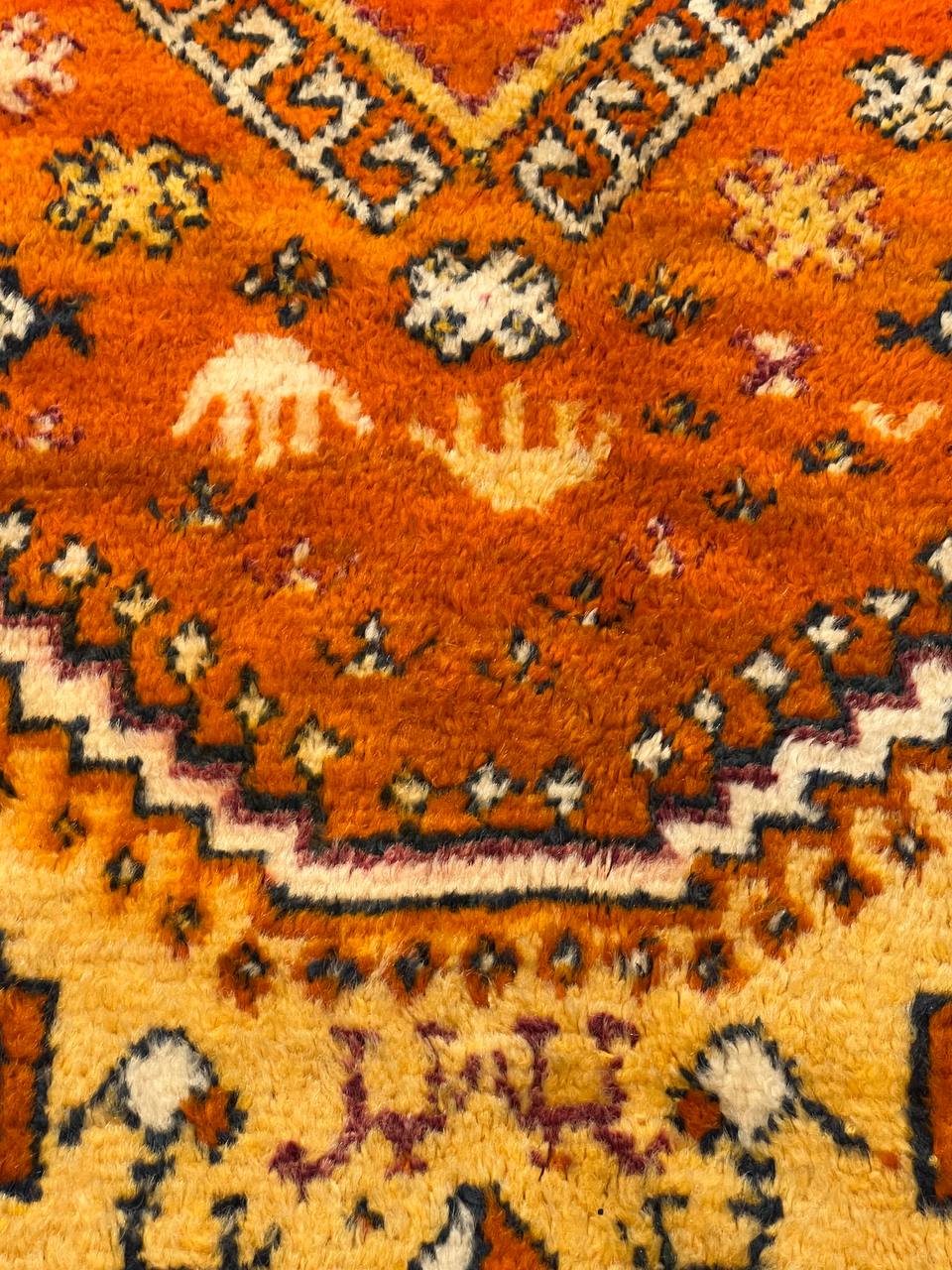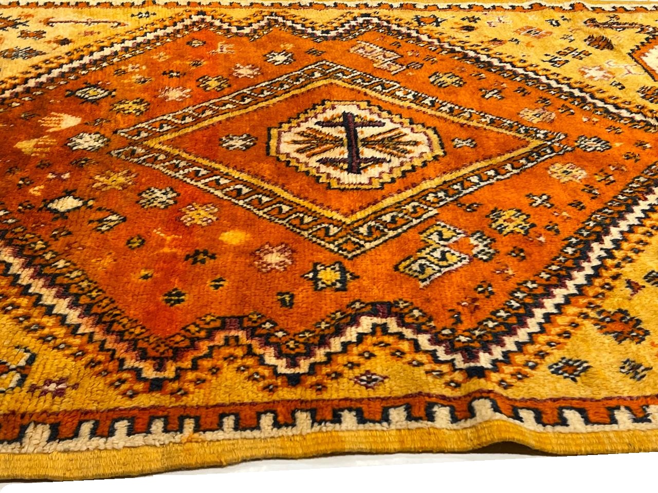 Beautiful Colorful Long and Narrow Vintage Moroccan Rug, Country of Origin: Morocco, Circa Date: Mid 20th Century β Stacked lozenges, checkered medallions, humanoid figures and ancient protection symbols used to combat the evil eye are prominently featured across the field of this vibrantly colored vintage Moroccan rug, which highlights design elements preferred by the Moroccan weavers of vintage rugs. Created circa 1950, this vintage rug features colorfully striped flat-woven ends and distinctive tribal-influenced motifs rendered in a bold combination of ivory, saffron yellow and Kelly green set over a tomato red field. Horizontal bands decorated with checkered goz symbols and staggered Bargello stripes subtly frame the central medallion, which is in turn flanked by a group of checkered bands and towering stacked lozenges. Filled with tribal details and strong colors, this bold Moroccan carpet makes a grand impression with an eclectic visage ideal for rustic and modern spaces alike.