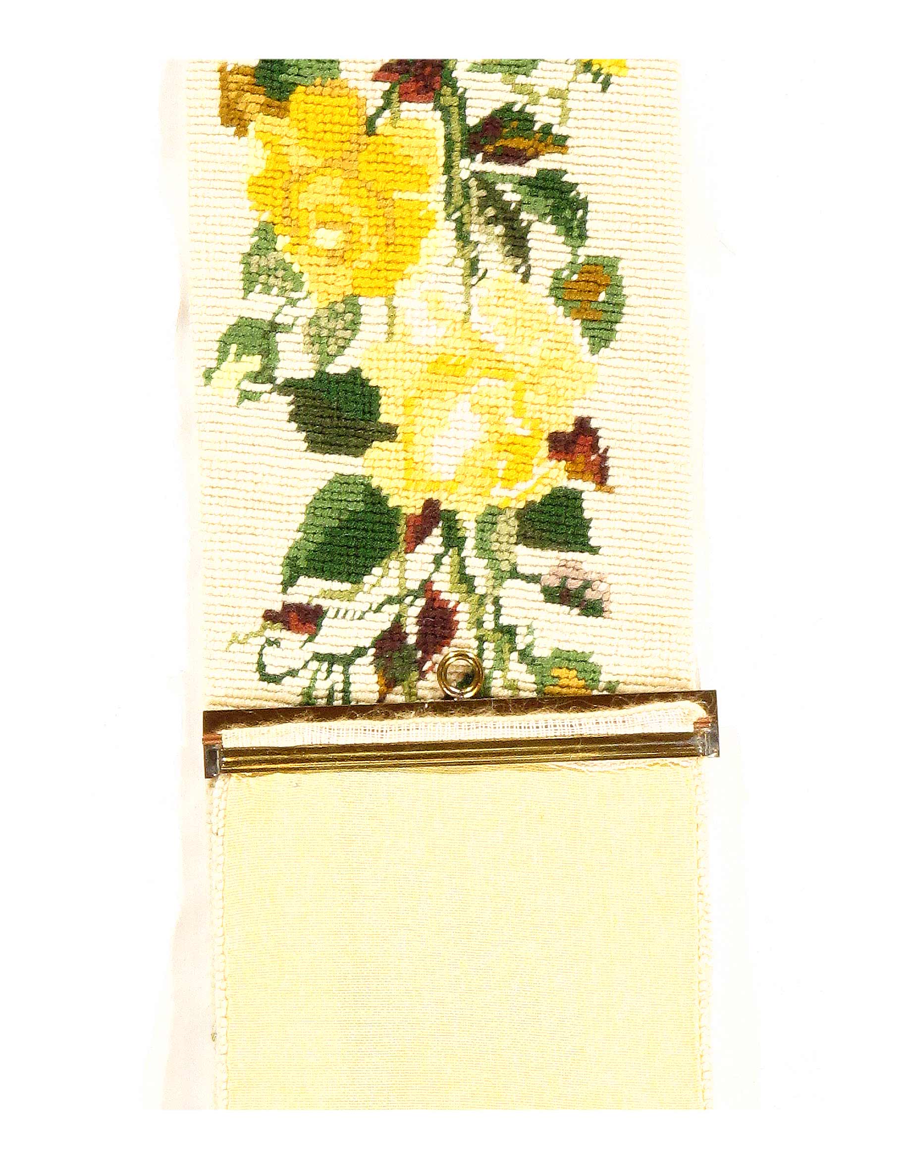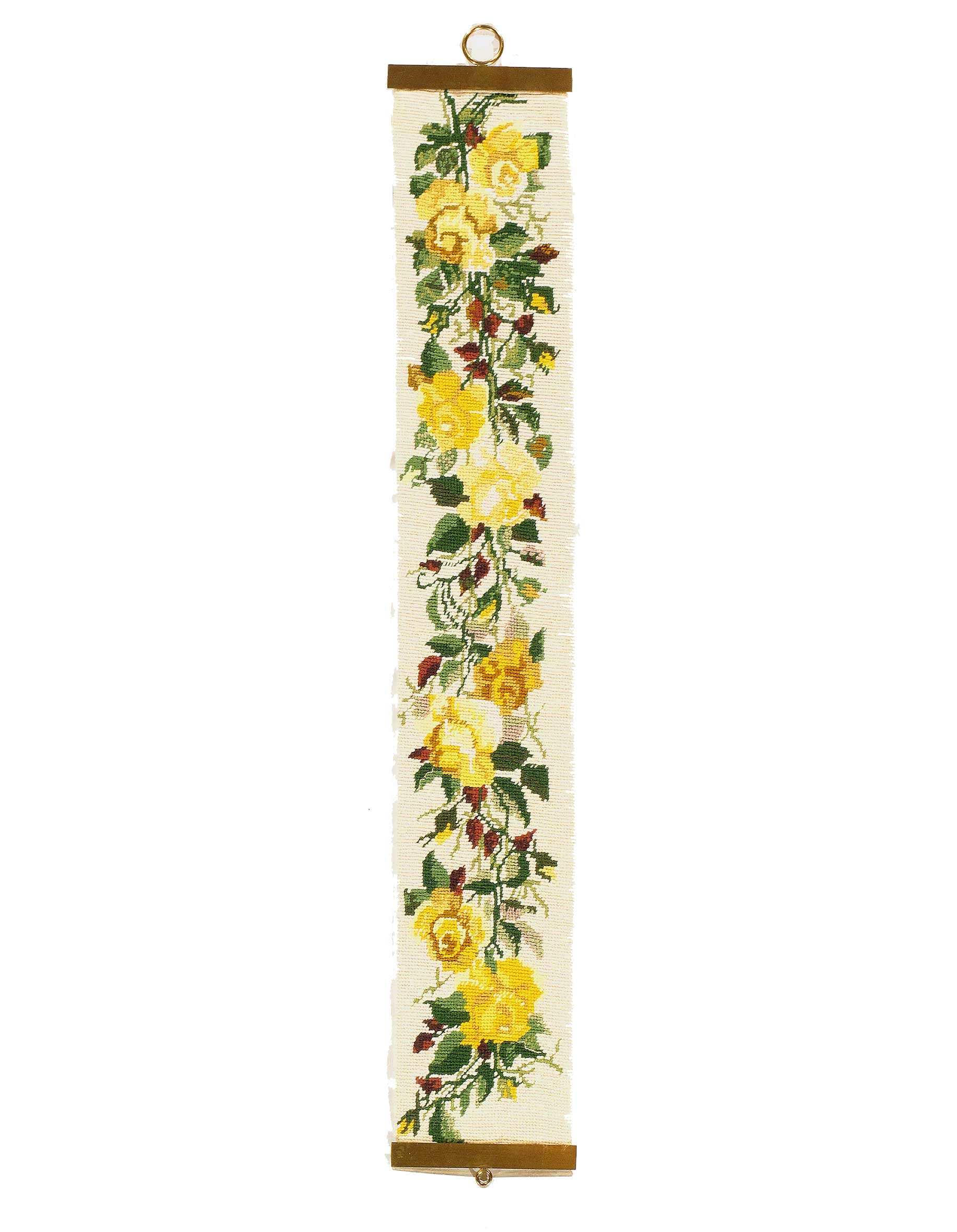 This is a Gorgeous Vintage Needlepoint Tapestry Bell Pull. Beautiful Wool thread in soft colors were stitched into an intricate design of flowers and roses. This lovely Handmade Wall Hanging is finished with Bronze Hardware.