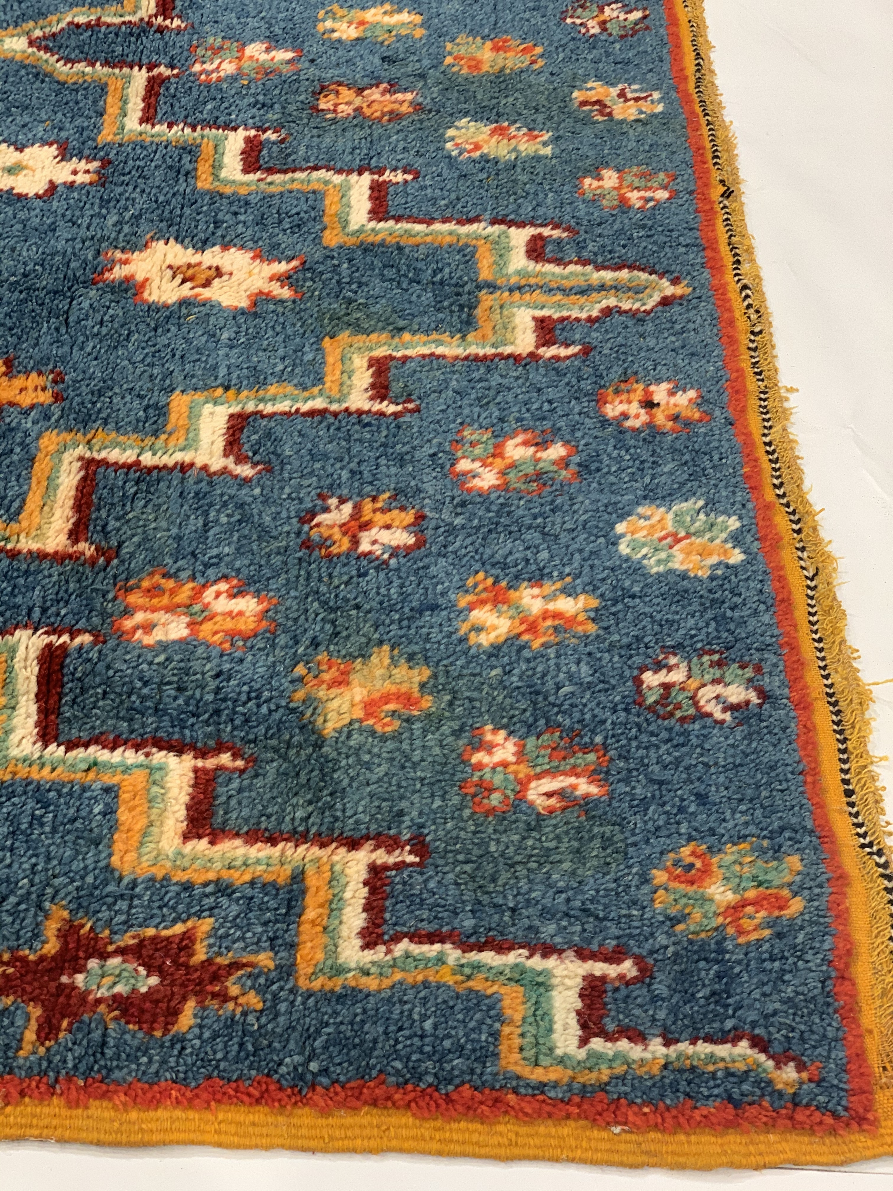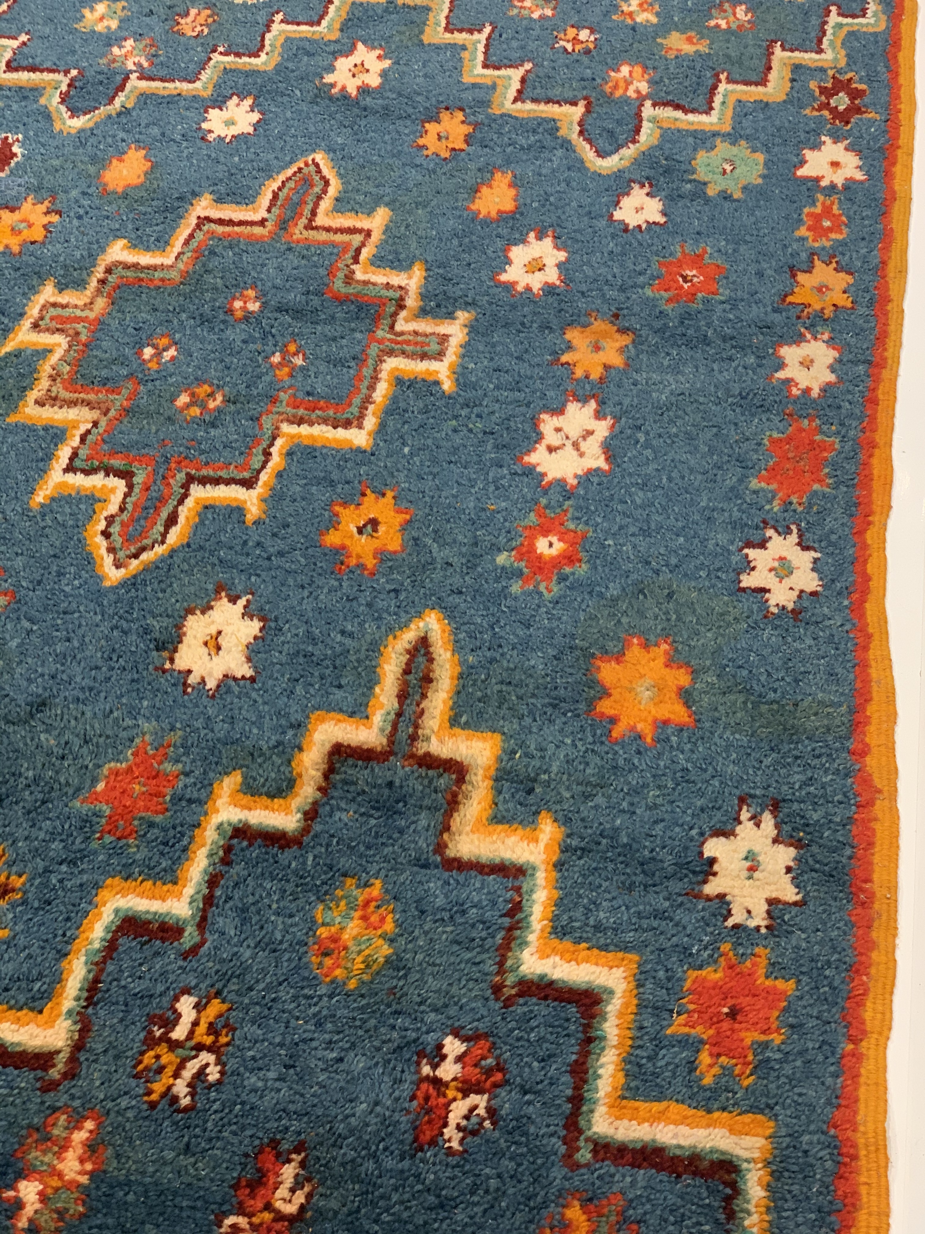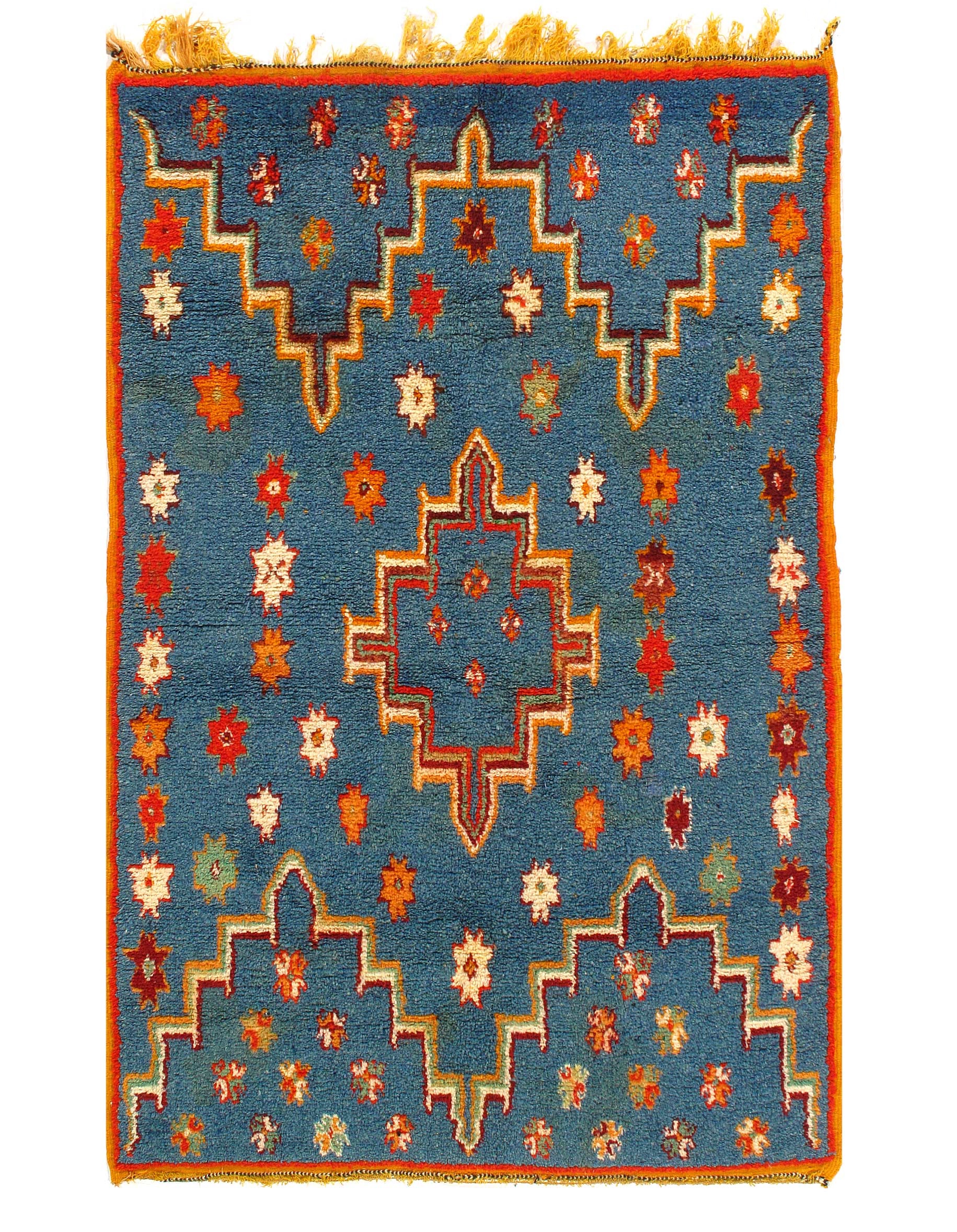 Beautiful Vintage Blue Color Background Moroccan Rug, Country of Origin: Morocco, Circa Date: Mid 20th Century – Stacked lozenges, humanoid figures and ancient protection symbols used to combat the evil eye are prominently featured across the field of this vibrantly colored vintage Moroccan rug, which highlights design elements preferred by the Moroccan weavers of vintage rugs. Created circa 1950, this vintage rug features colorfully striped flat-woven ends and distinctive tribal-influenced motifs rendered in a bold combination of ivory, saffron yellow and Blue set over a tomato red field. Horizontal bands decorated with checkered goz symbols and staggered Bargello stripes subtly frame the central medallion, which is in turn flanked by a group of checkered bands and towering stacked lozenges. Filled with tribal details and strong colors, this bold Moroccan carpet makes a grand impression with an eclectic visage ideal for rustic and modern spaces alike.