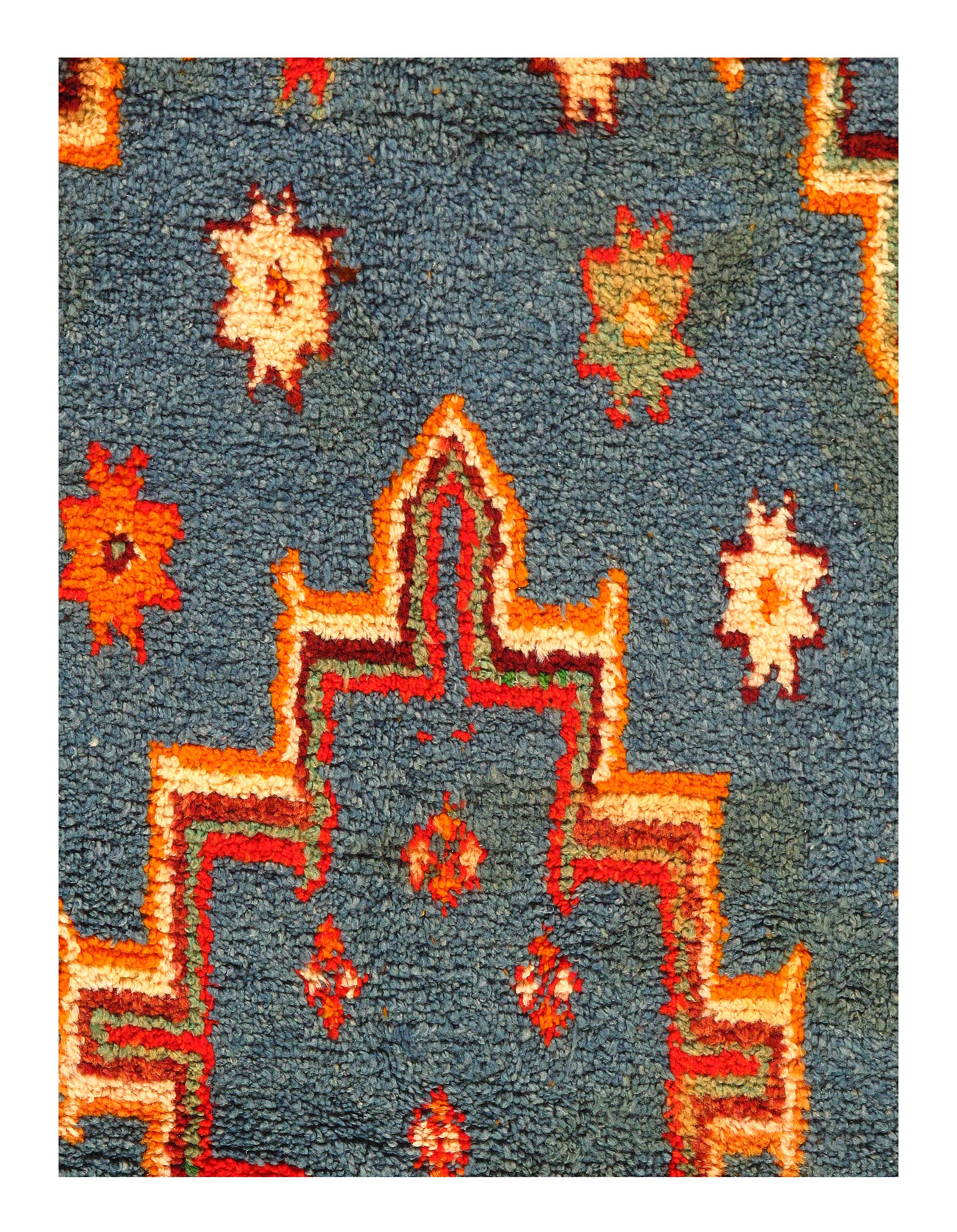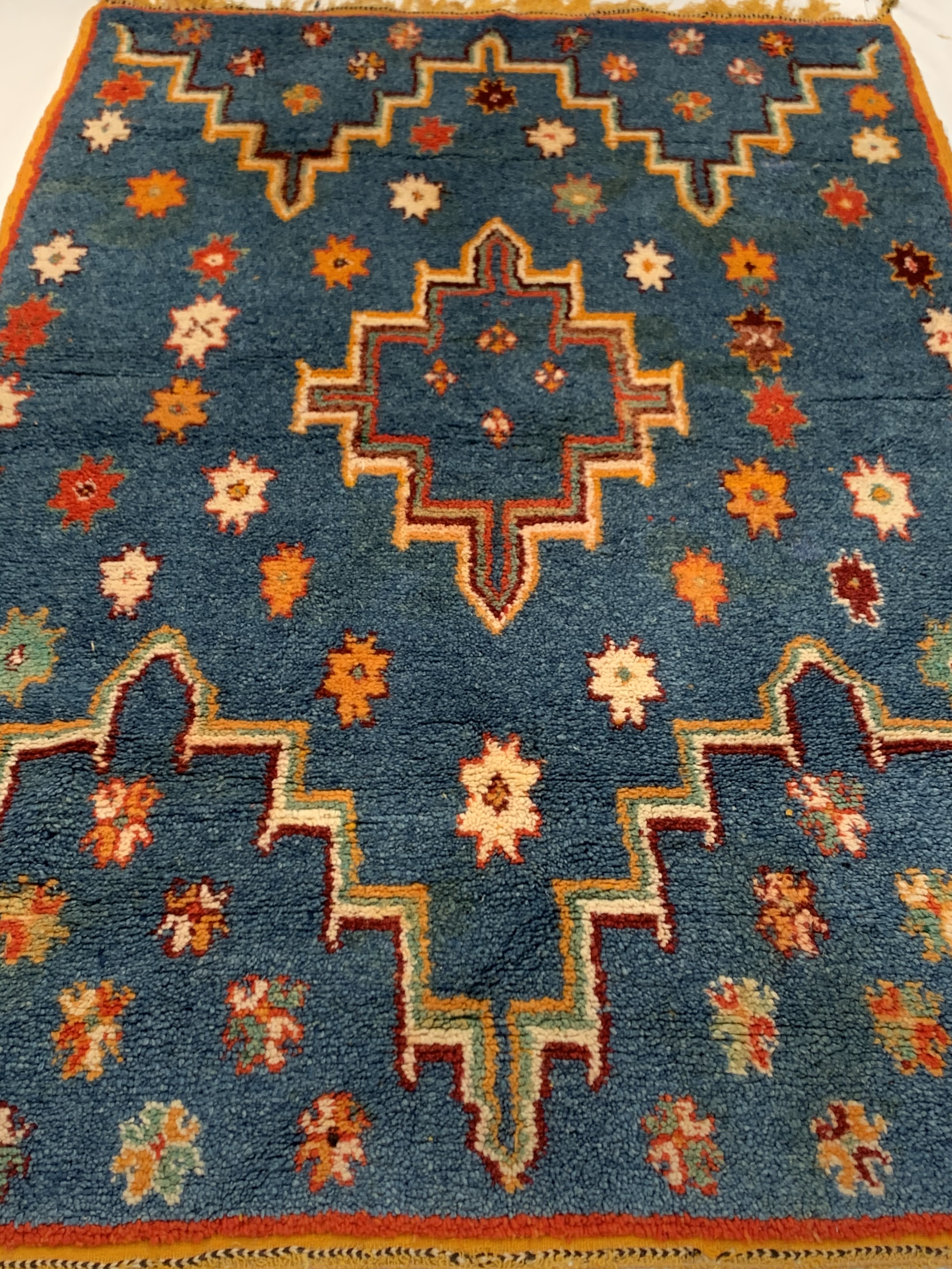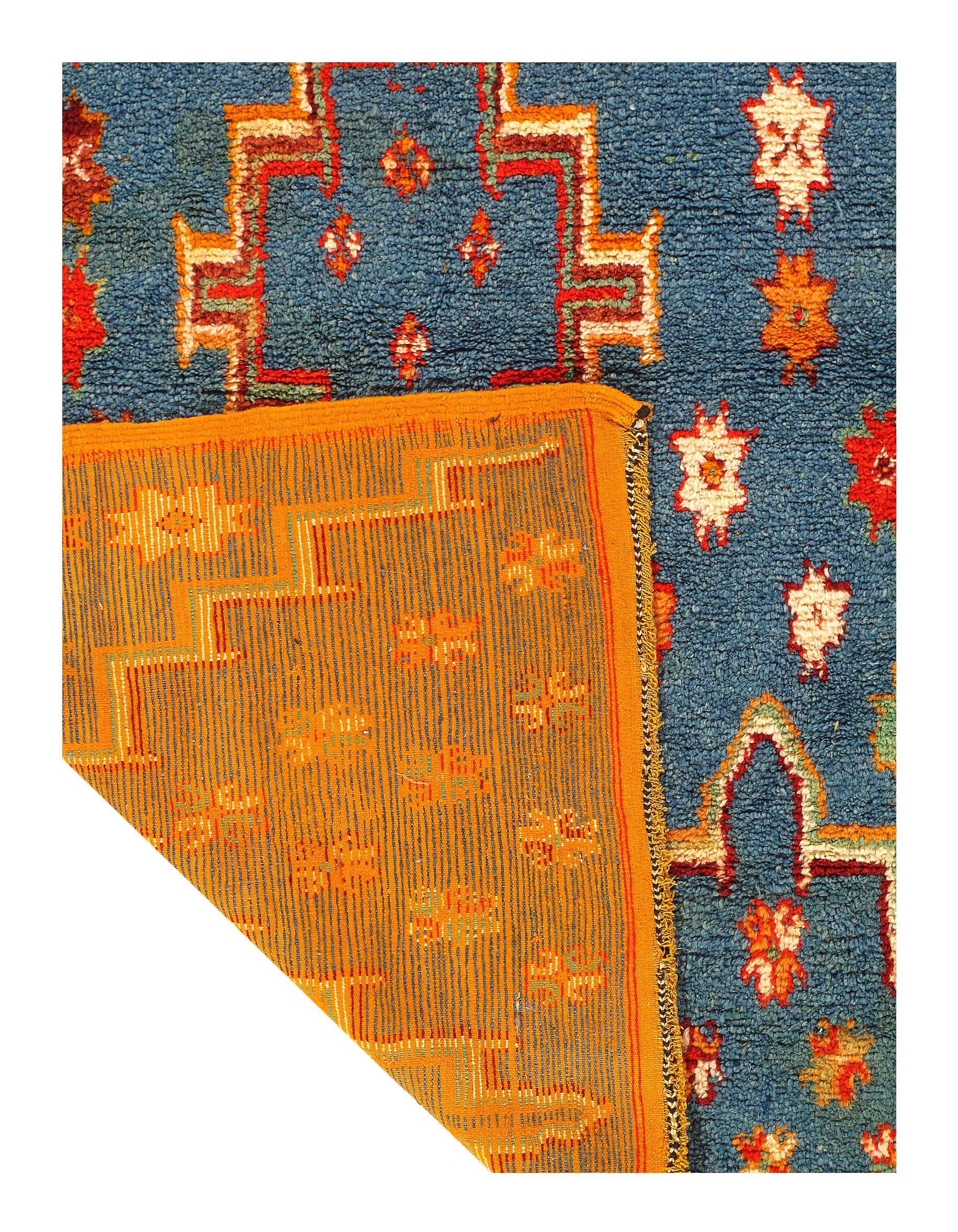 Beautiful Vintage Blue Color Background Moroccan Rug, Country of Origin: Morocco, Circa Date: Mid 20th Century – Stacked lozenges, humanoid figures and ancient protection symbols used to combat the evil eye are prominently featured across the field of this vibrantly colored vintage Moroccan rug, which highlights design elements preferred by the Moroccan weavers of vintage rugs. Created circa 1950, this vintage rug features colorfully striped flat-woven ends and distinctive tribal-influenced motifs rendered in a bold combination of ivory, saffron yellow and Blue set over a tomato red field. Horizontal bands decorated with checkered goz symbols and staggered Bargello stripes subtly frame the central medallion, which is in turn flanked by a group of checkered bands and towering stacked lozenges. Filled with tribal details and strong colors, this bold Moroccan carpet makes a grand impression with an eclectic visage ideal for rustic and modern spaces alike.
