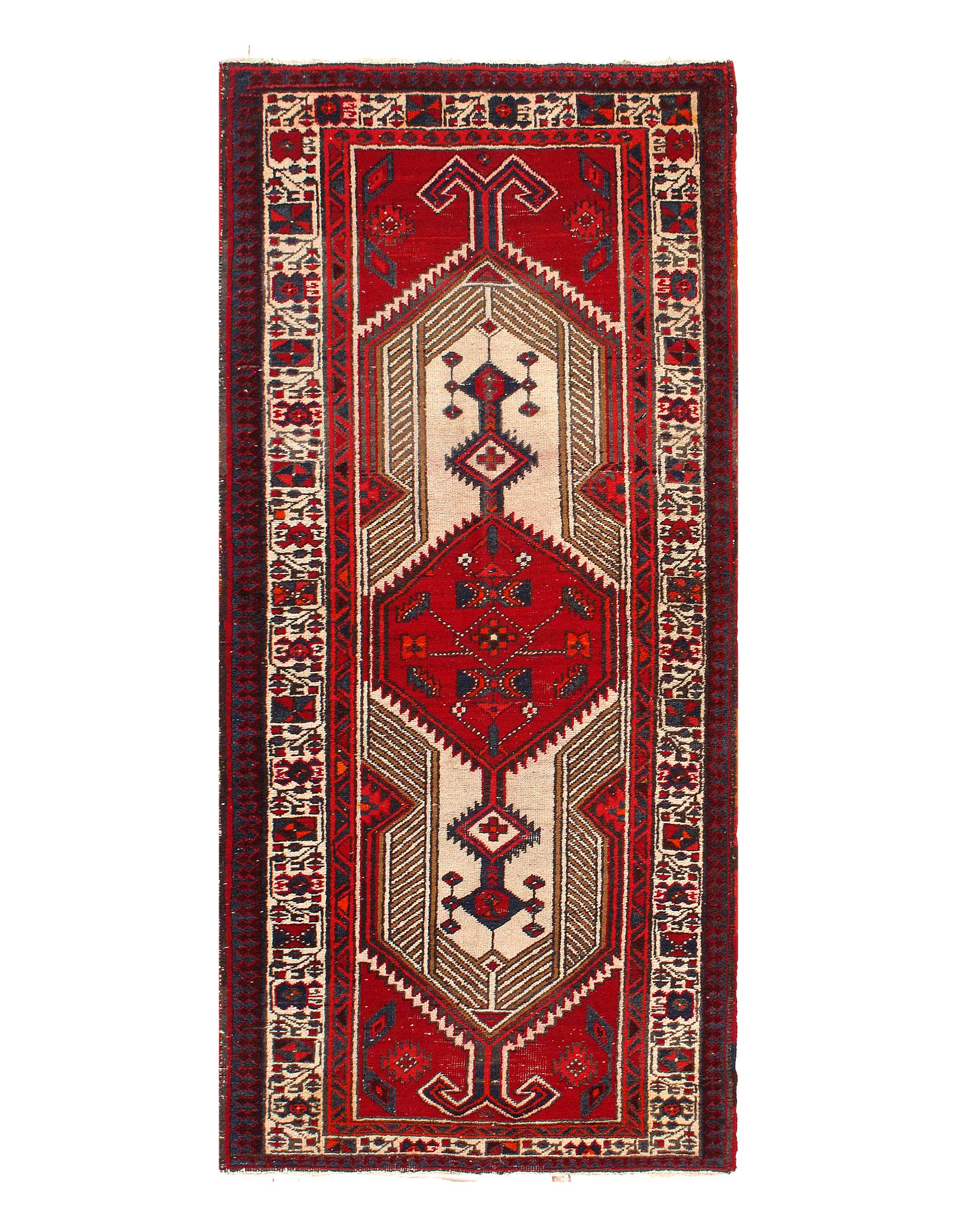 The central field of this beautiful rug displays a vibrant fusion of various geometric shapes. These tribal patterns are set against a bolder earthy reddish color. This created a beautiful juxtaposition and playfulness between the designs themselves and background.