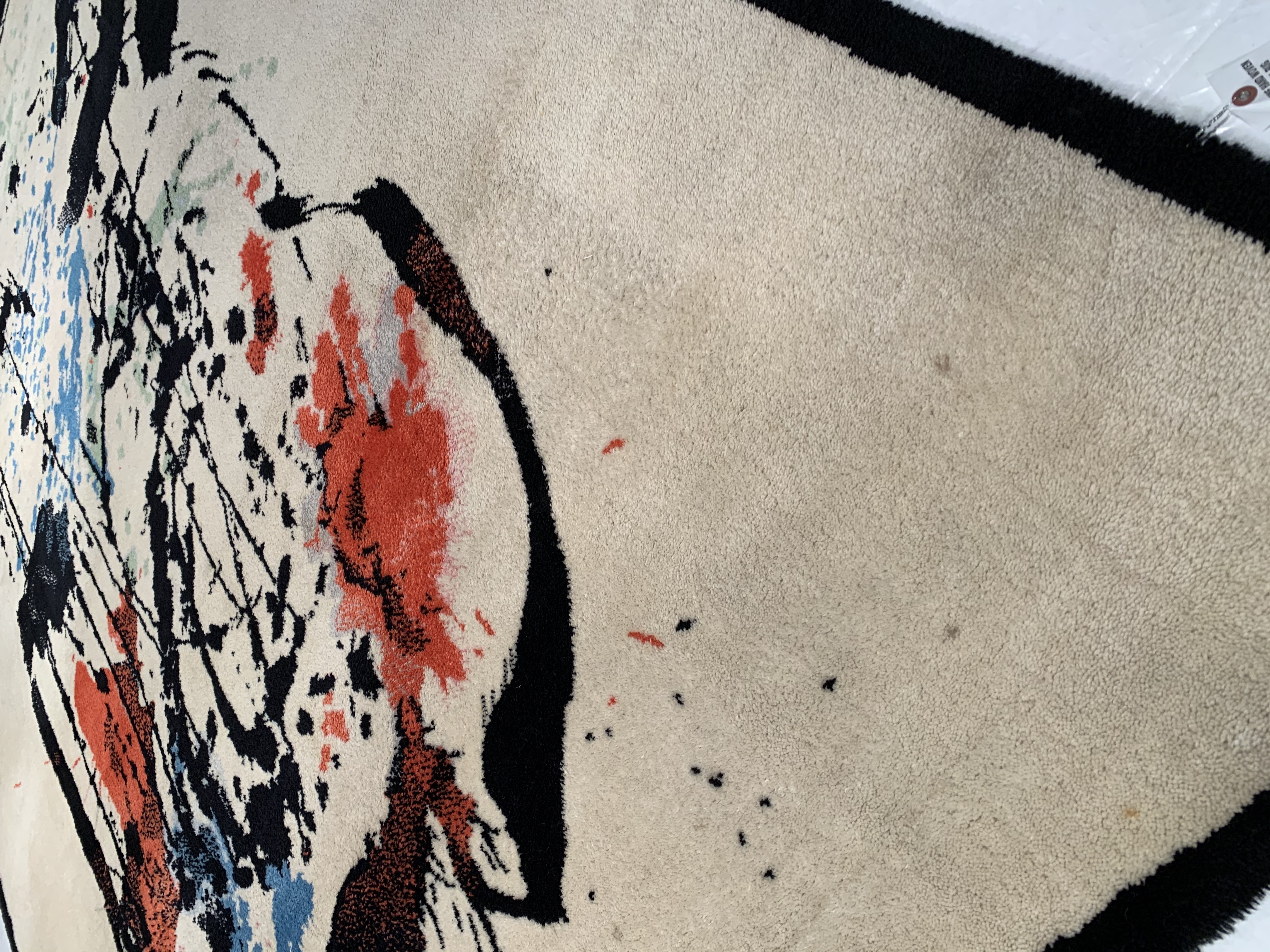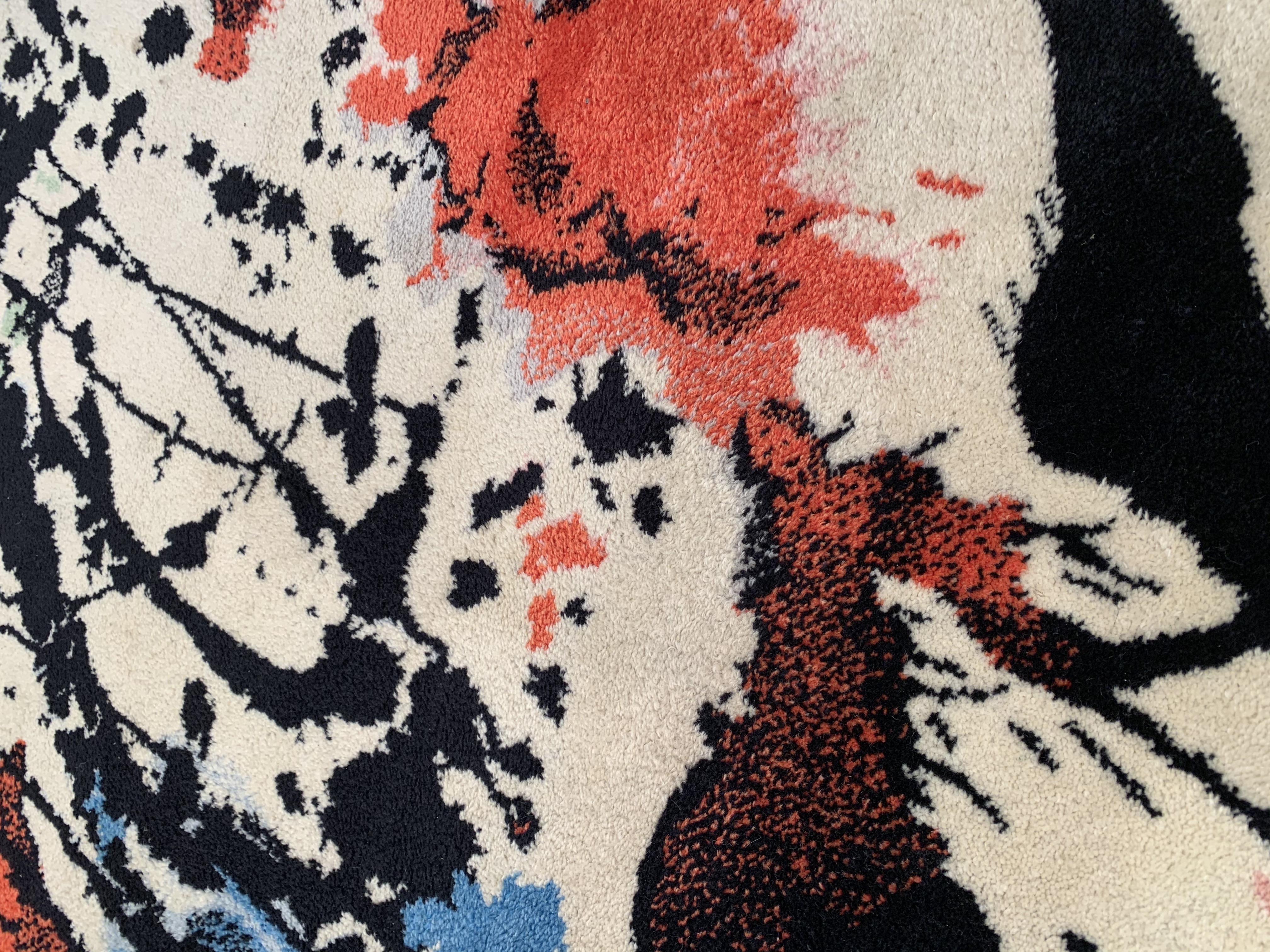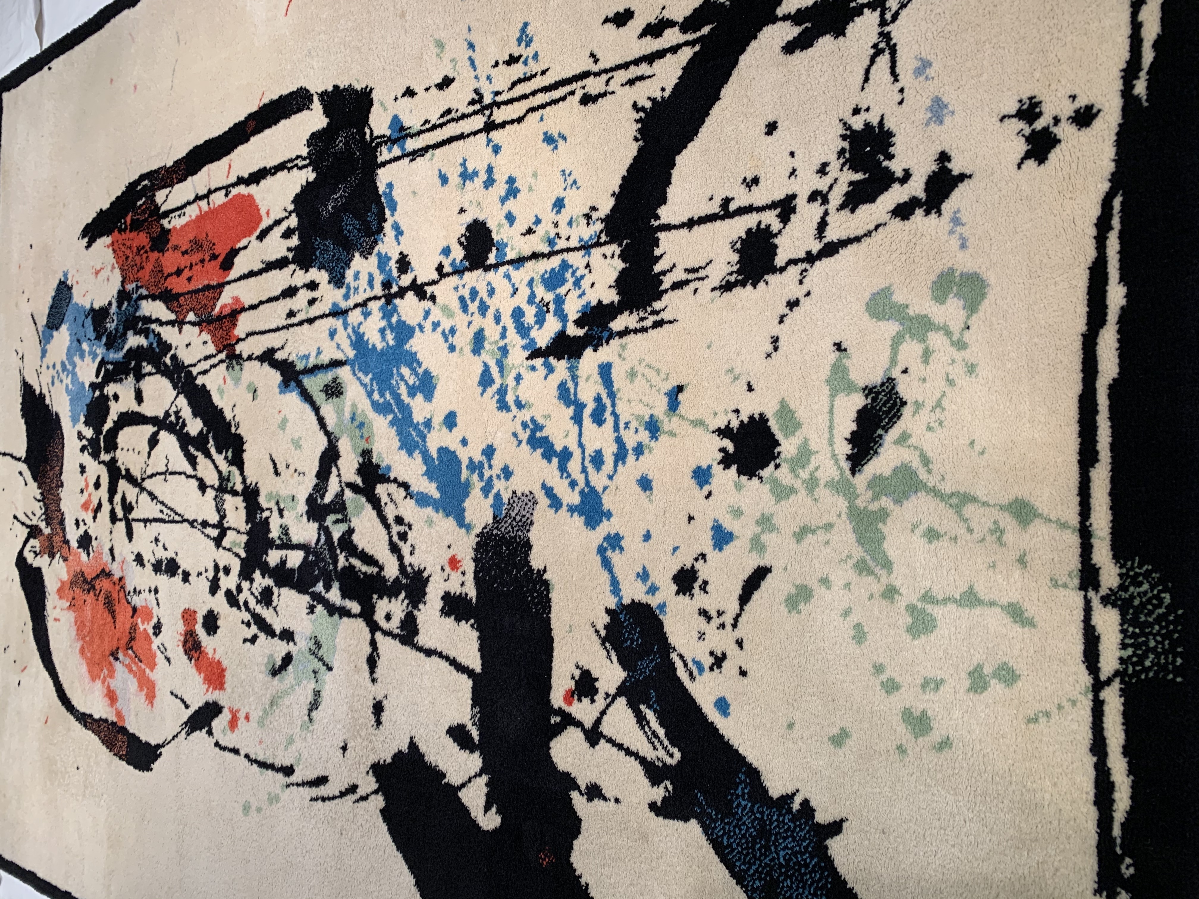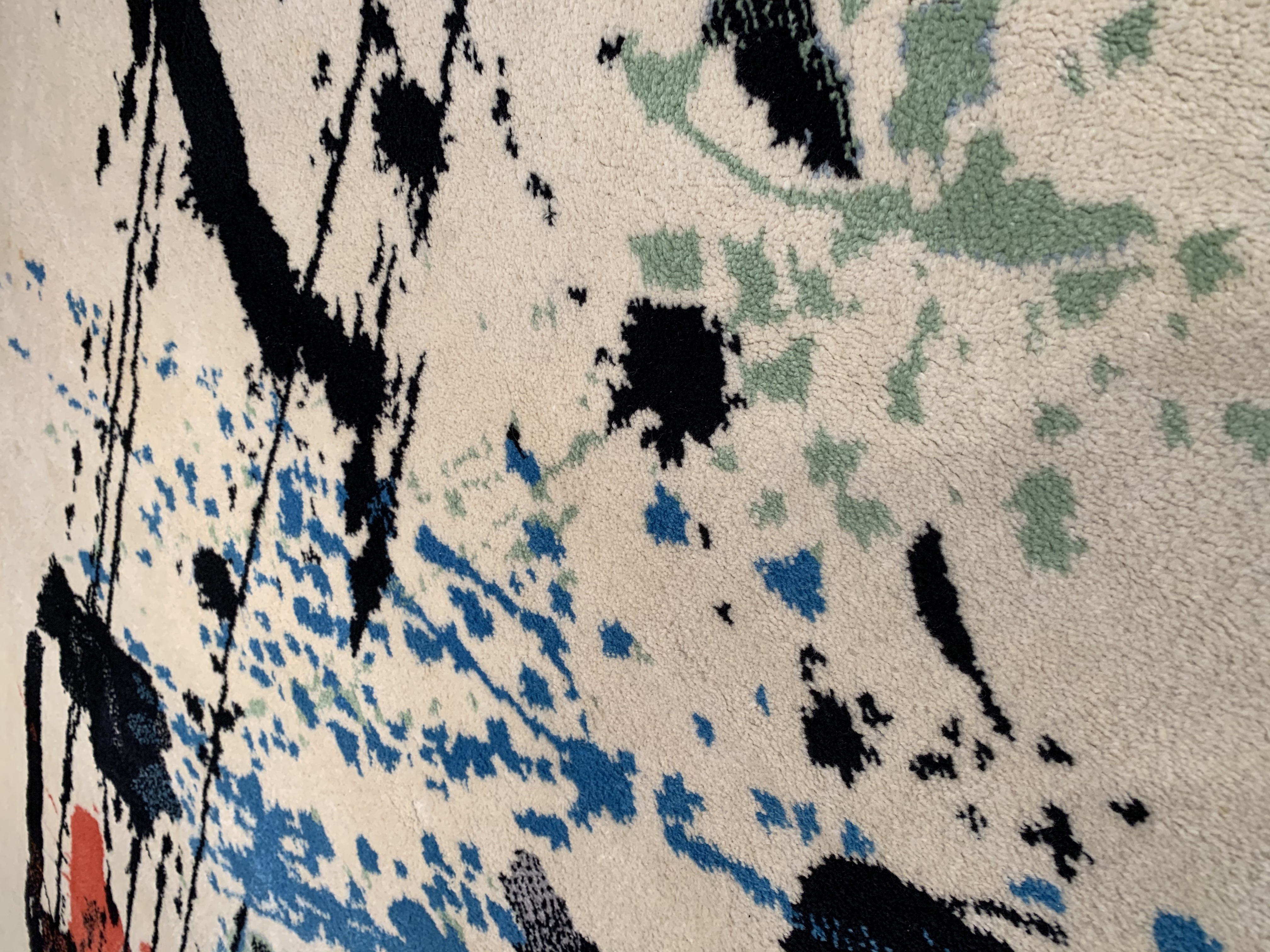 Jacobsen’s designs use a combination of curves, straight lines and organic elements to create designs that emphasize form and motion. This exciting Robert Jacobsen rug compares the organic design in the middle to the edges of the carpet, which are emphasized by black lines. The “paint drips” serve as the organic element of the design. It makes use of the white space through the use of colors that can be easily seen in fine detail.