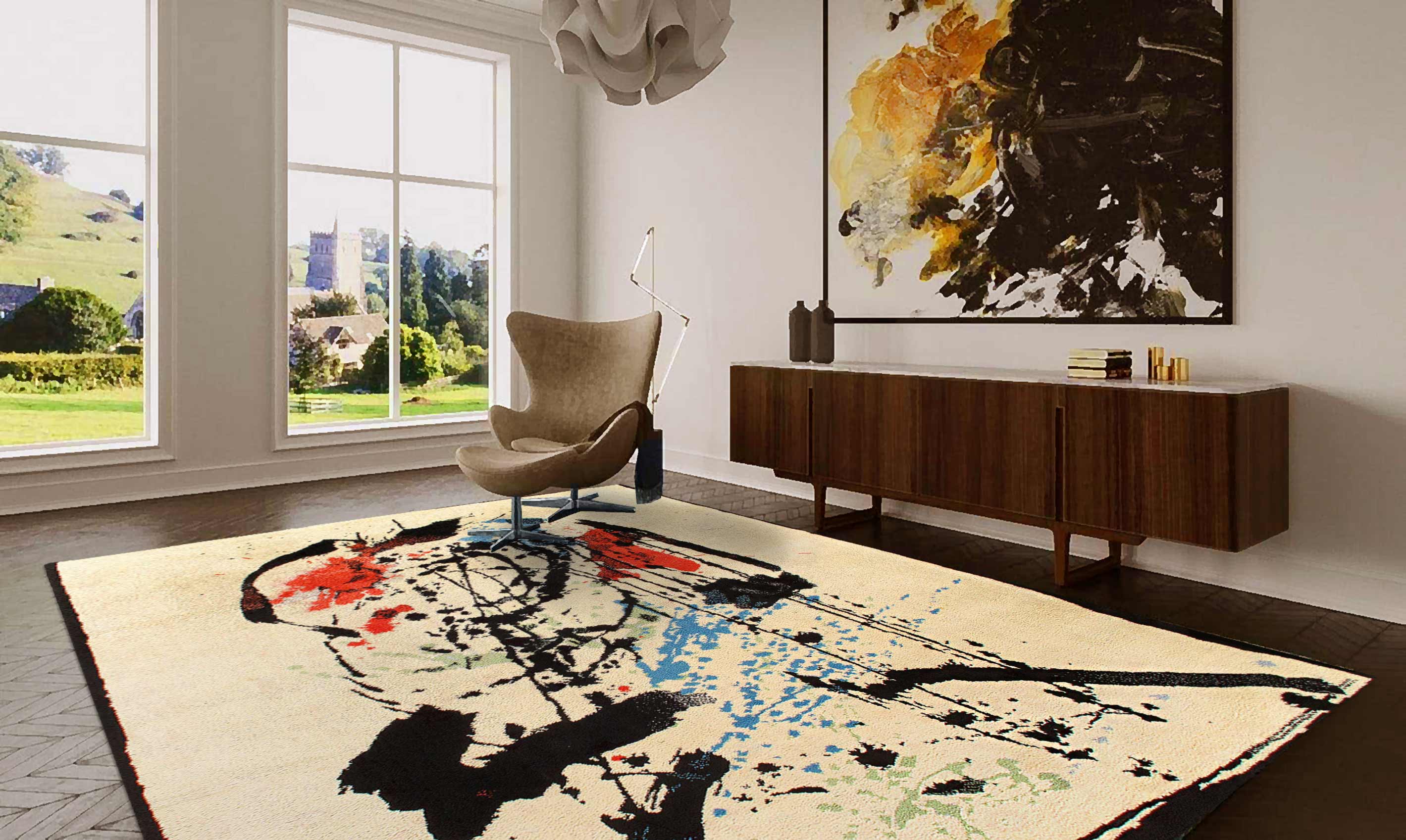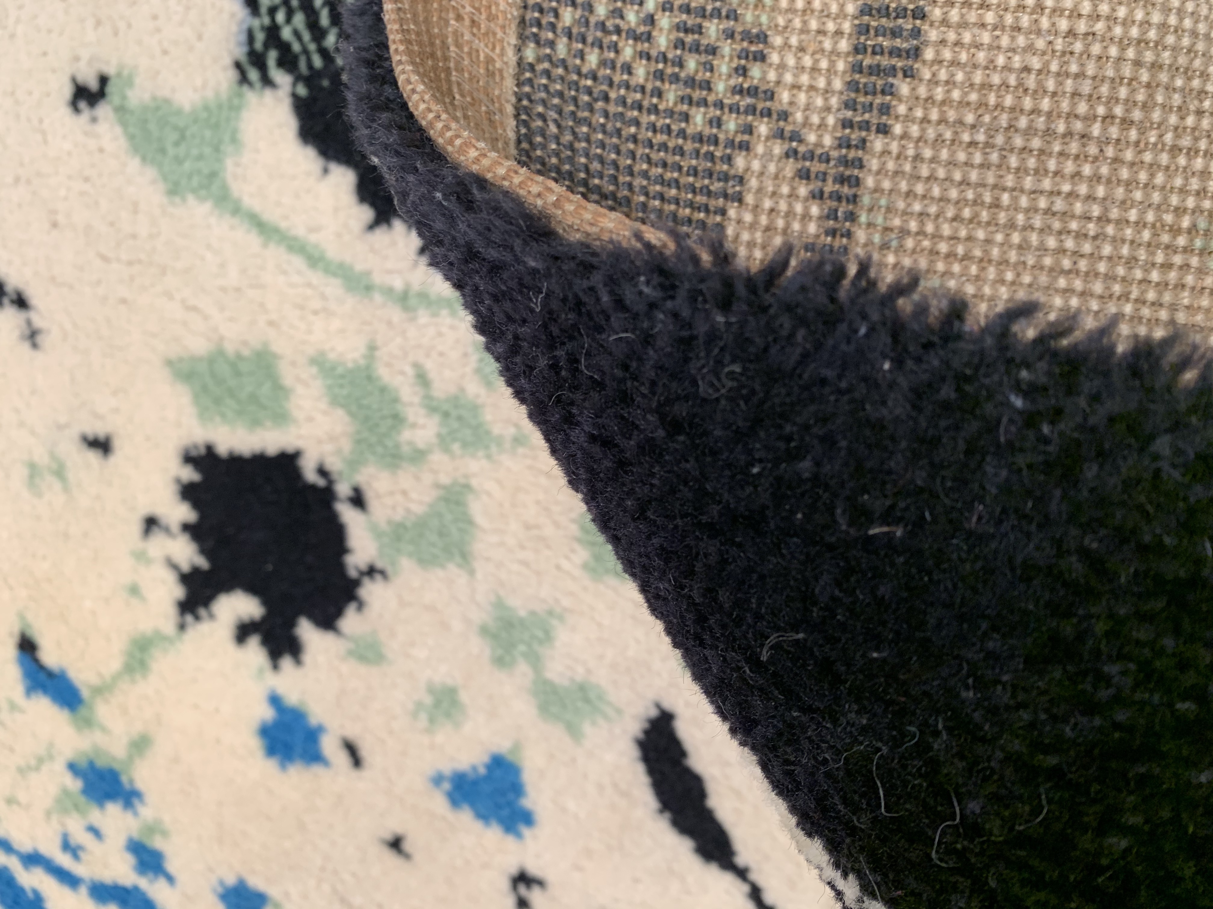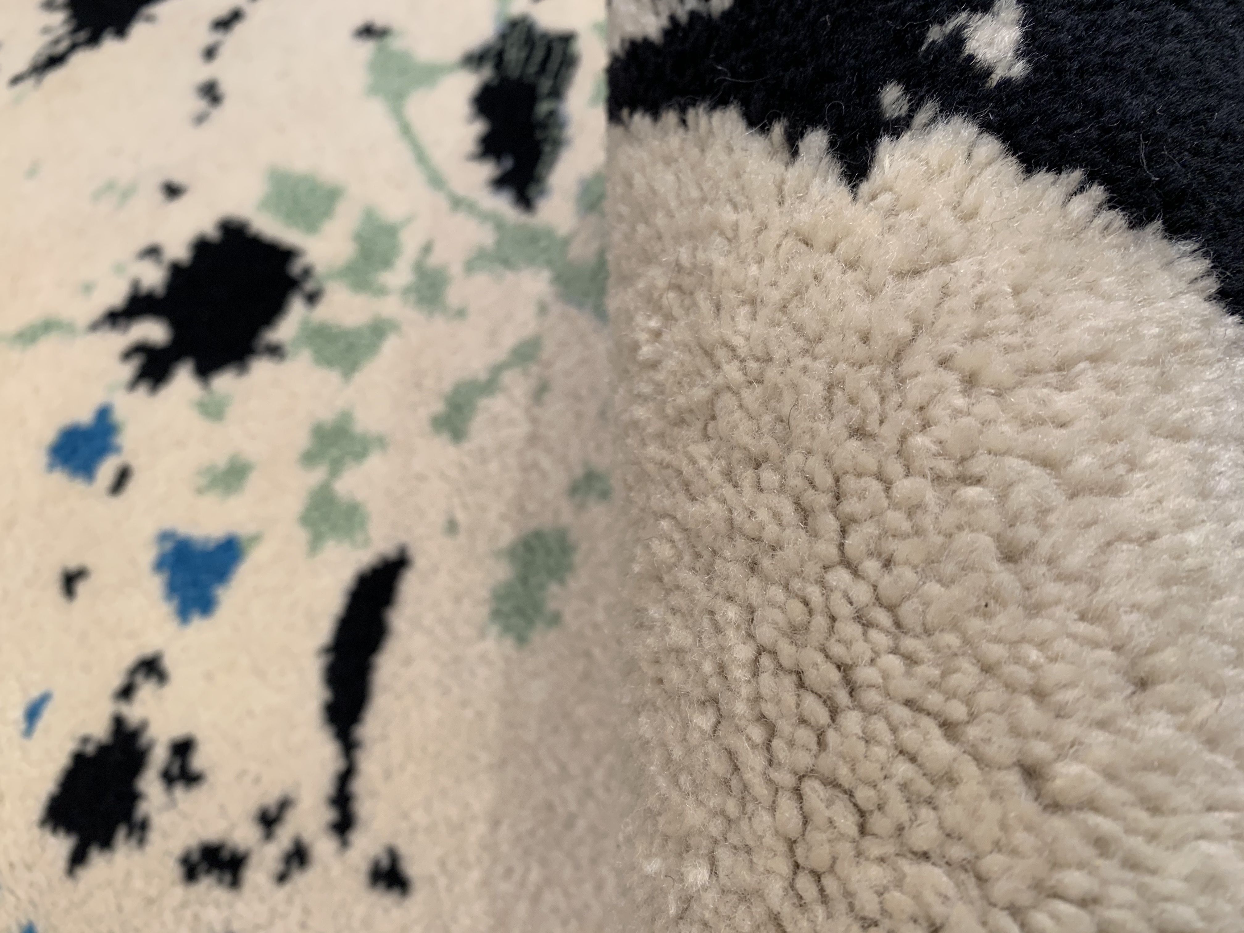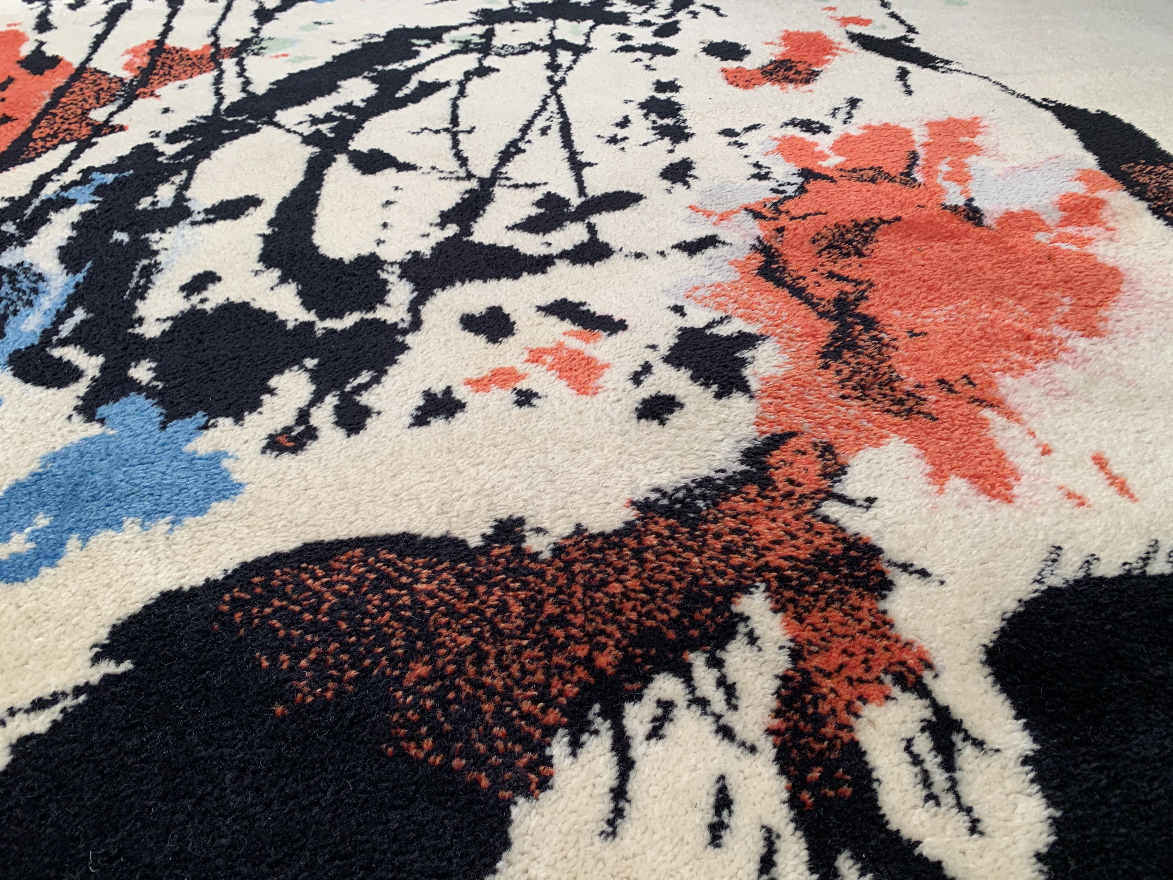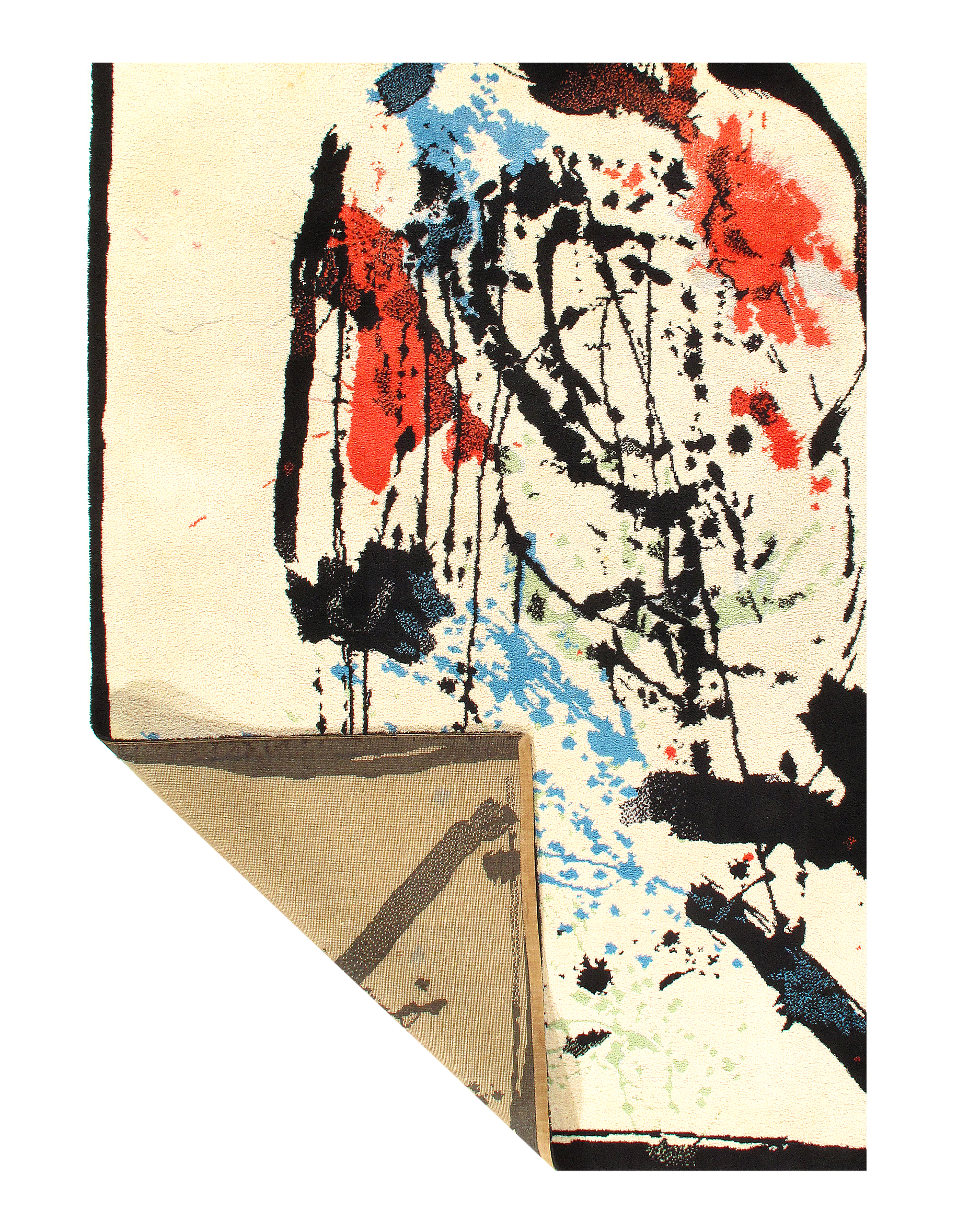 Jacobsen’s designs use a combination of curves, straight lines and organic elements to create designs that emphasize form and motion. This exciting Robert Jacobsen rug compares the organic design in the middle to the edges of the carpet, which are emphasized by black lines. The “paint drips” serve as the organic element of the design. It makes use of the white space through the use of colors that can be easily seen in fine detail.
