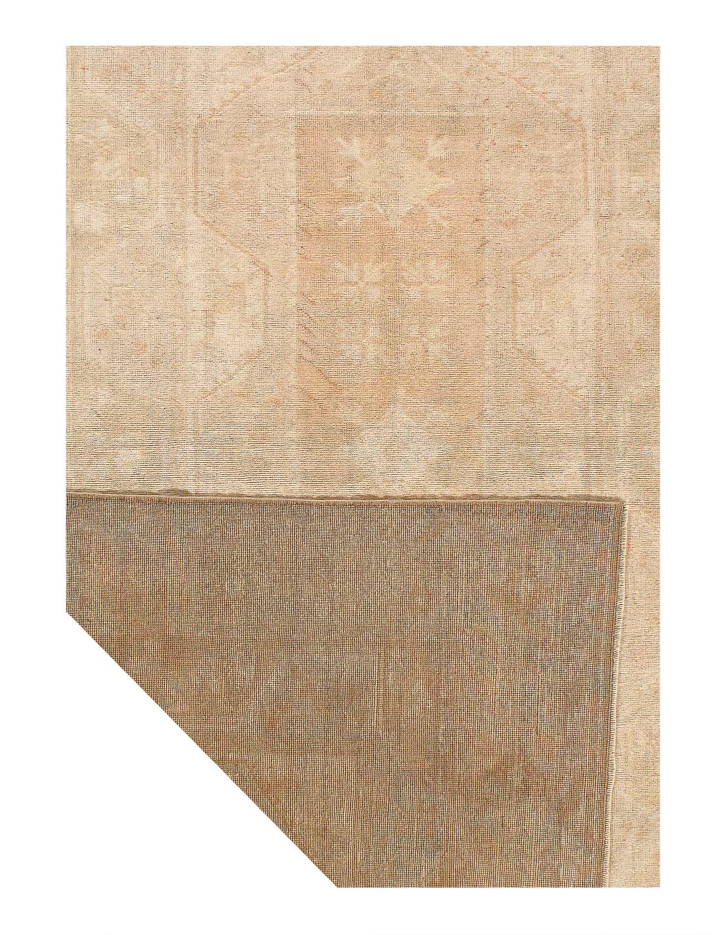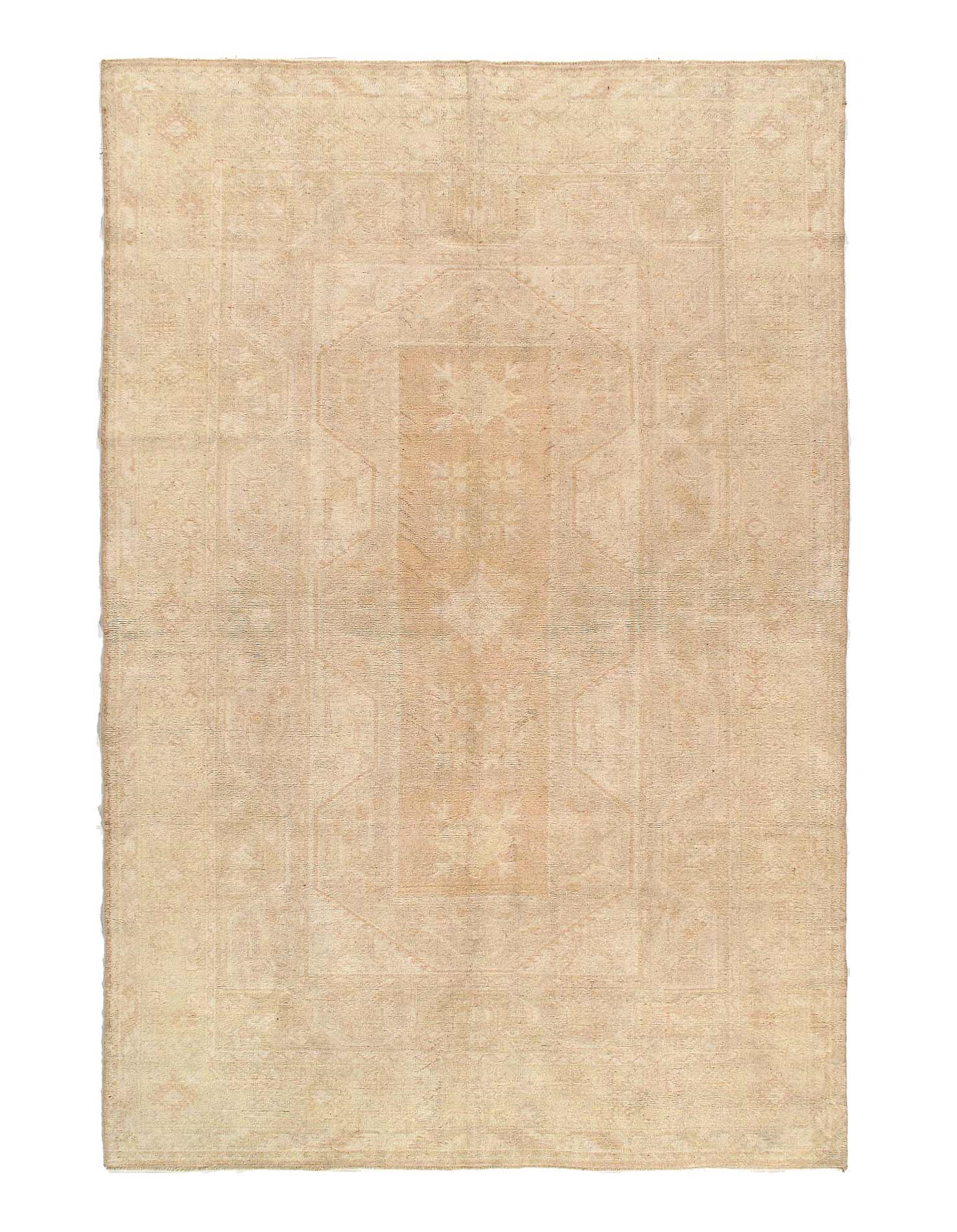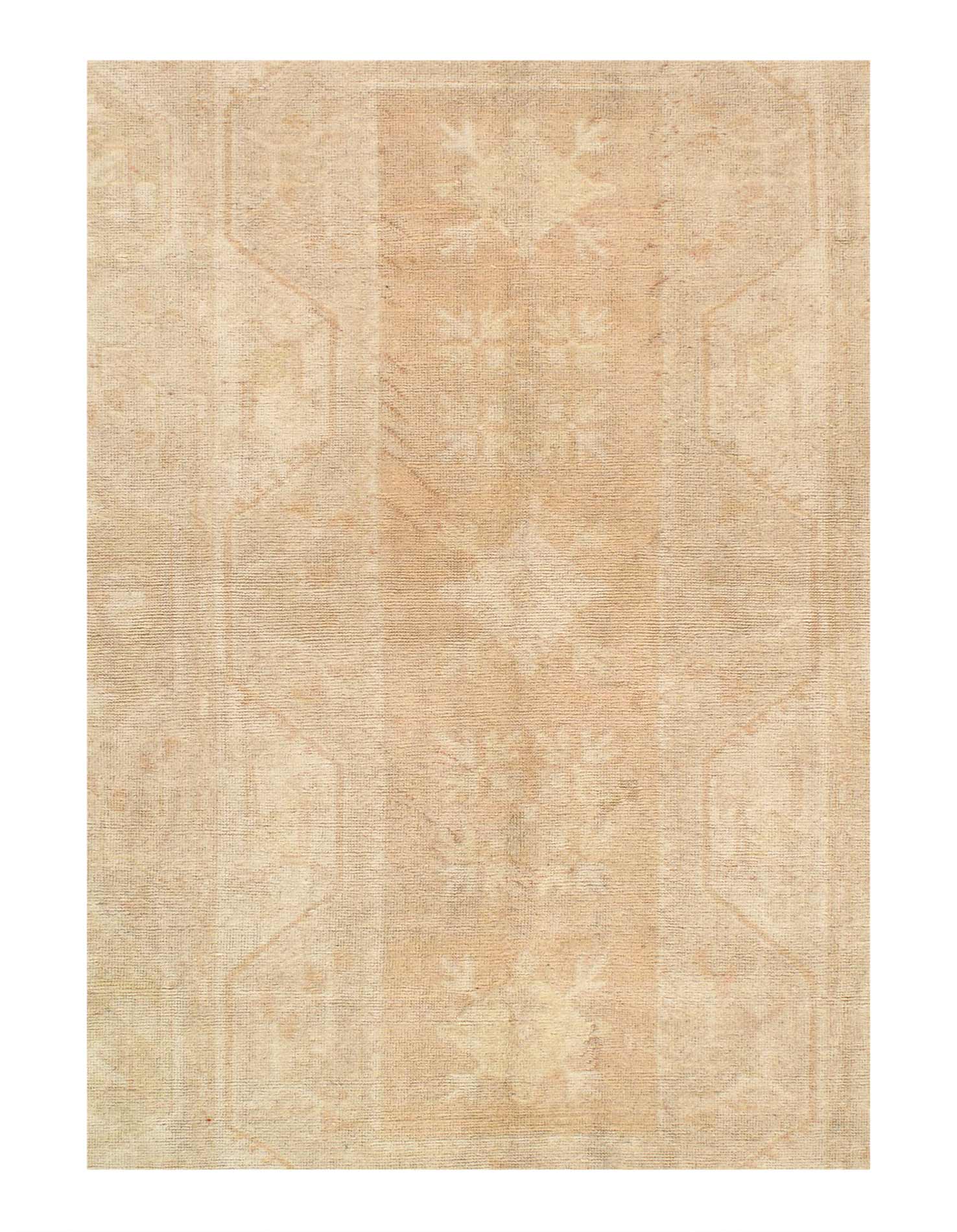 This vintage Turkish Oushak rug features a cross-shaped medallion design in the central field, flanked by other tribal motifs. The multi-banded border frames the designs floating in the central field, and the entirety of the rug is rendered in light cream / Rose color