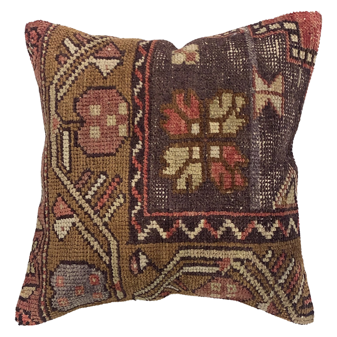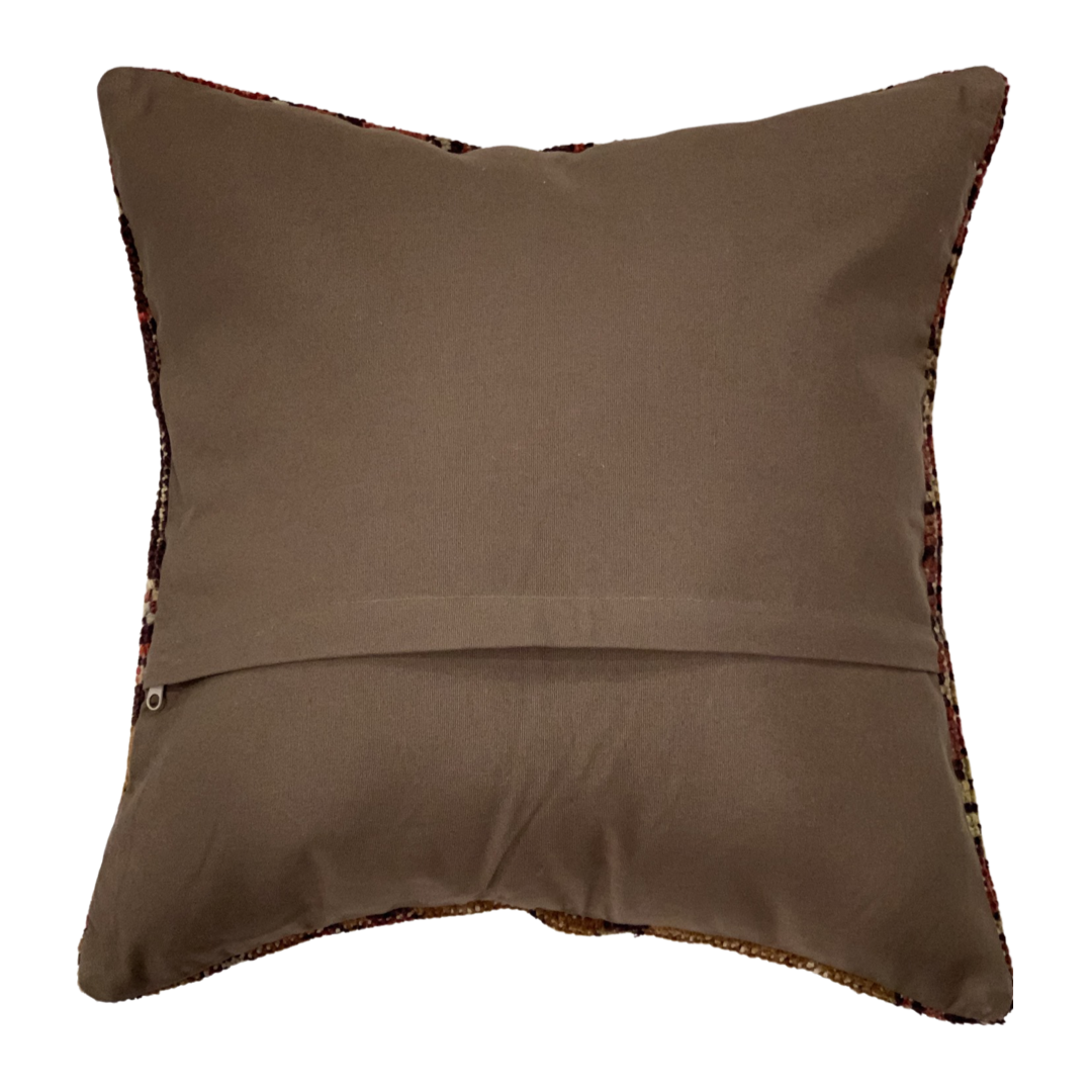 Vintage hand woven Turkish pillow. This is 100% wool. Back 100% cotton. Beautiful colors and well made. This pillow features a hidden zipper closure with neutral fabric backing.