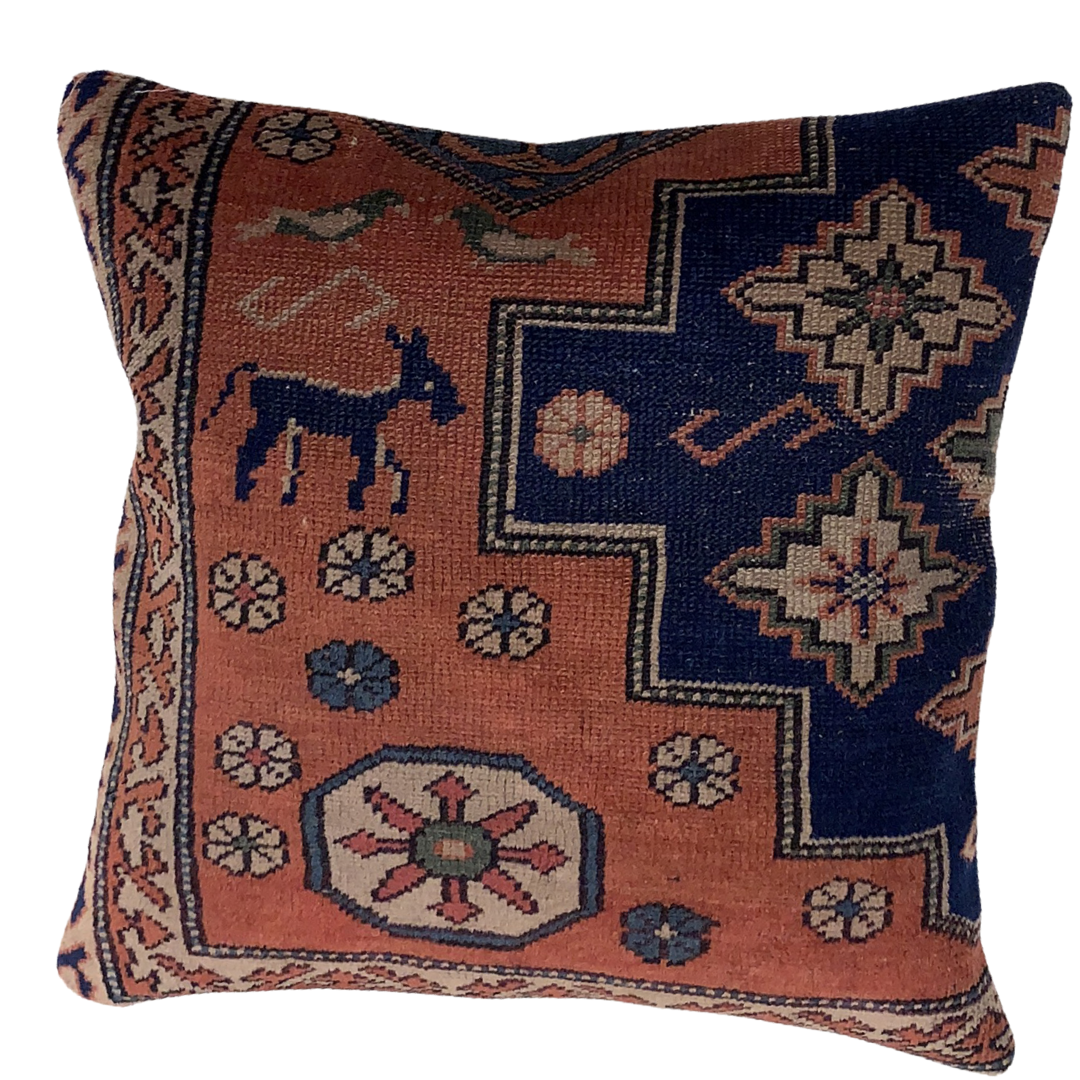 Vintage hand woven Turkish pillow. This is 100% wool. Back 100% cotton. Beautiful colors and well made. This pillow features a hidden zipper closure with neutral fabric backing.